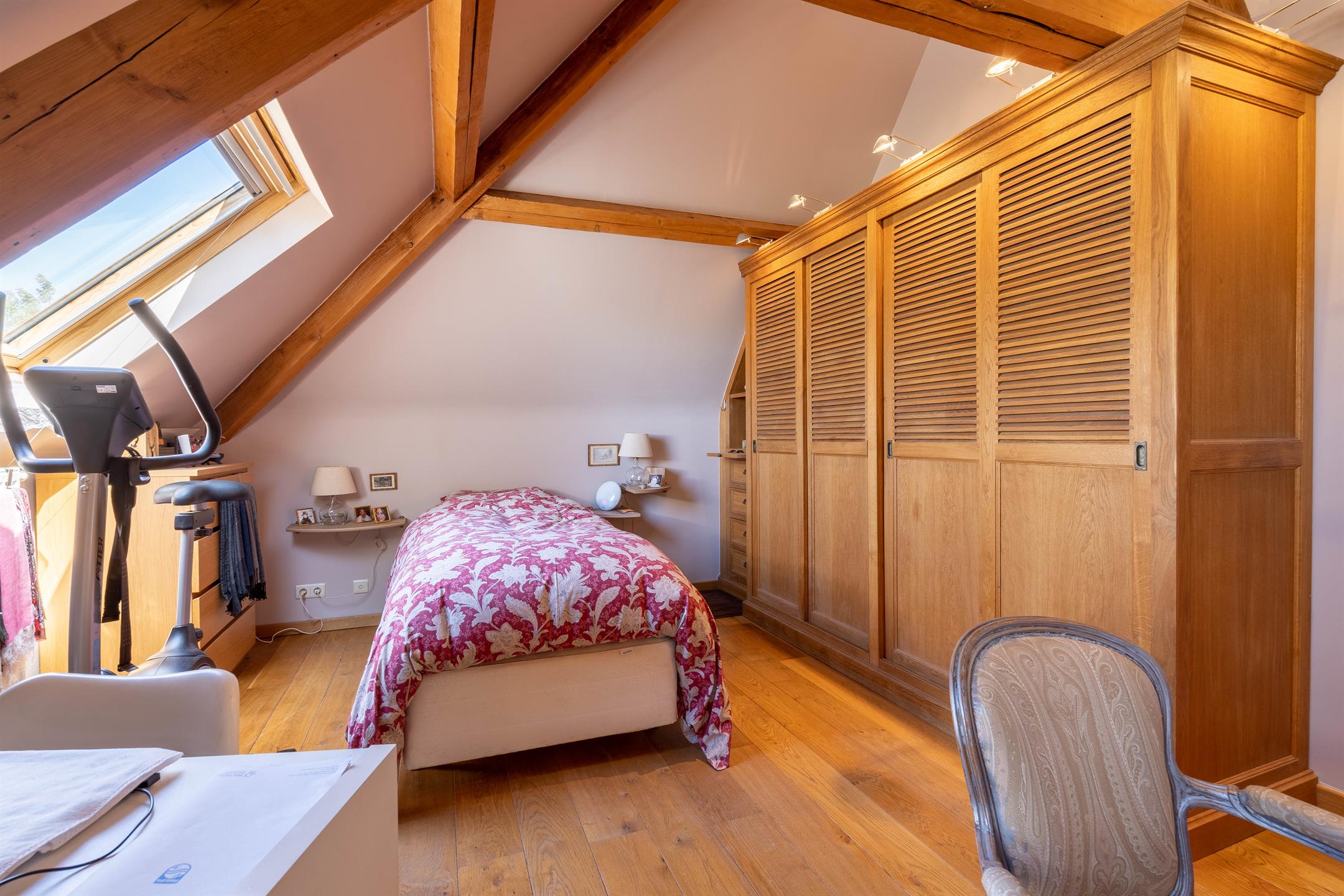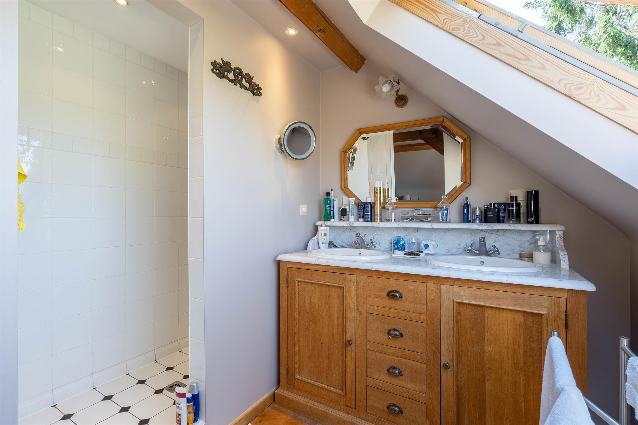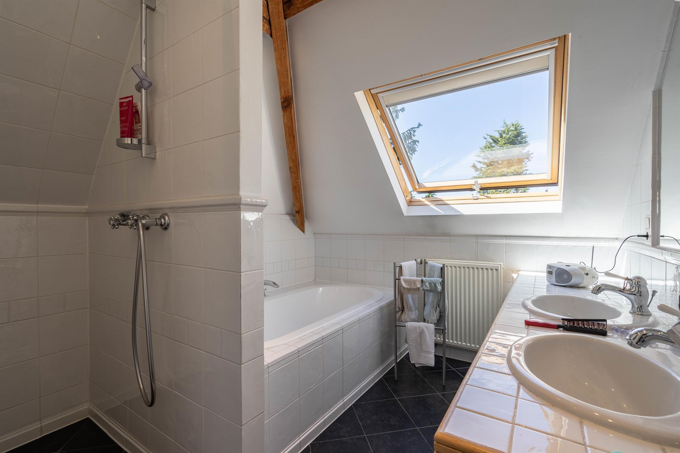 A l’étage, un hall de nuit desservant 3 chambres, une chambre de +- 16m2, une chambre de +- 16m2 avec salle de douche attenante, une chambre de +- 13m2 avec mezzanine de +- 13m2 et placard intégré, une salle de bains (bain, douche, 2 lavabos), un wc séparé.