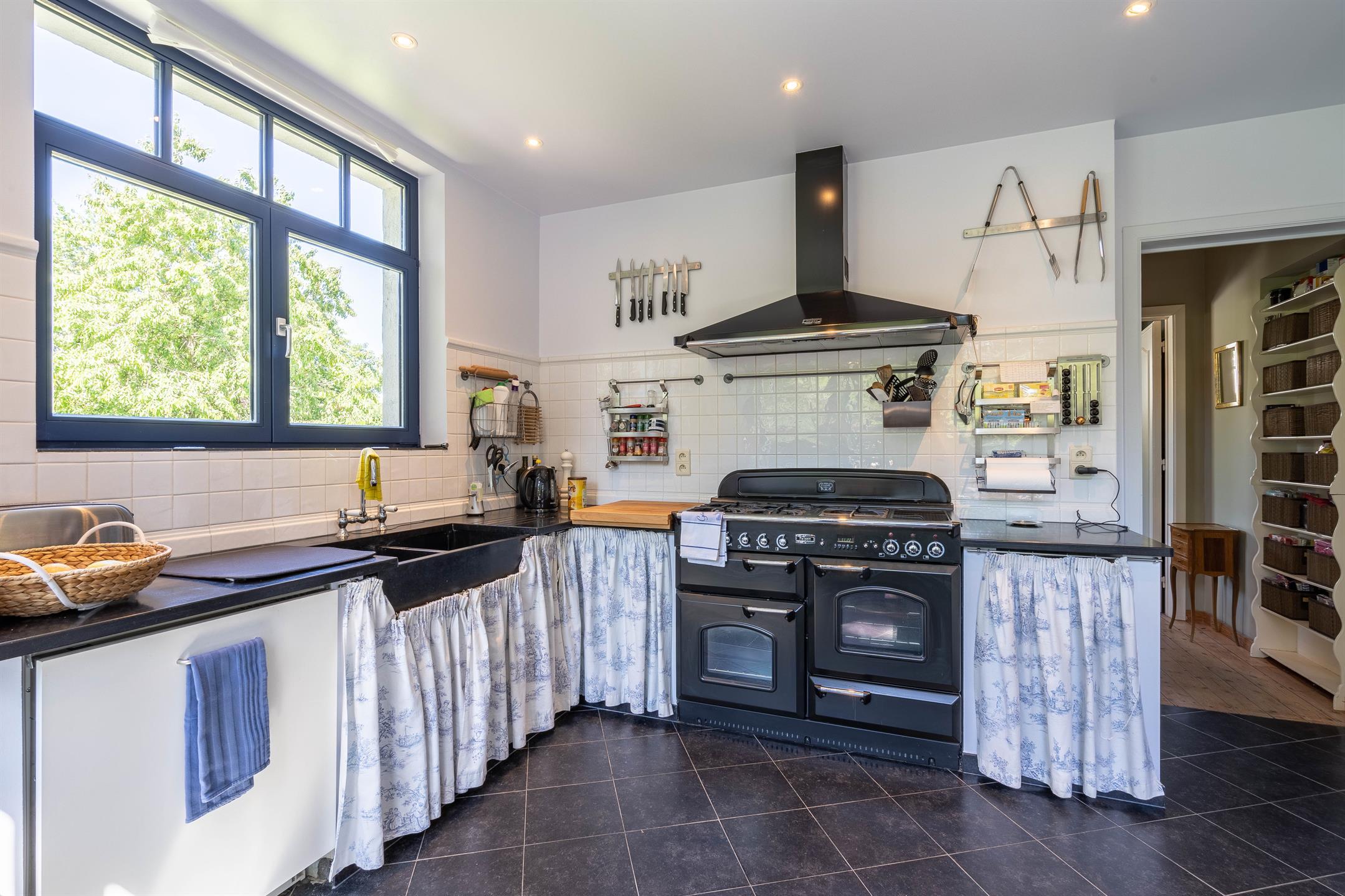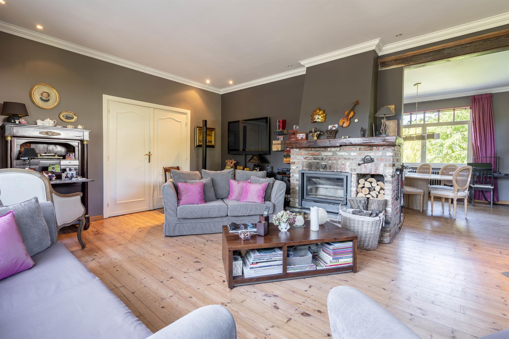 Comprenant au rez-de-chaussée un hall d’entrée menant à un living de +- 26m2 et son feu ouvert, une salle à manger +/-17m2, une cuisine super-équipée avec un accès vers la terrasse plein sud.