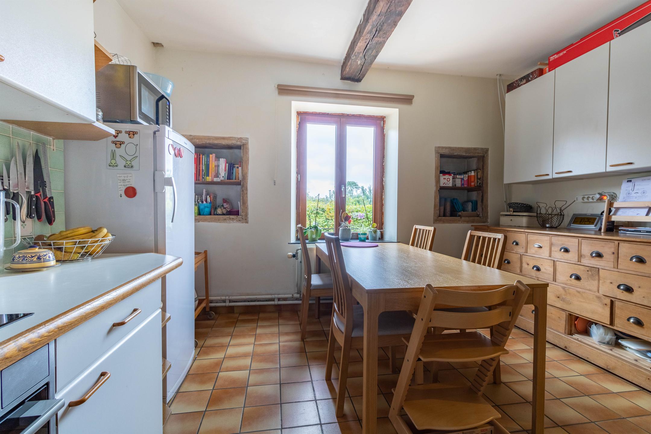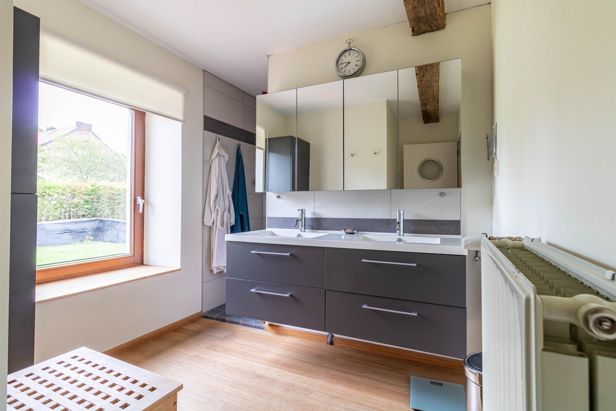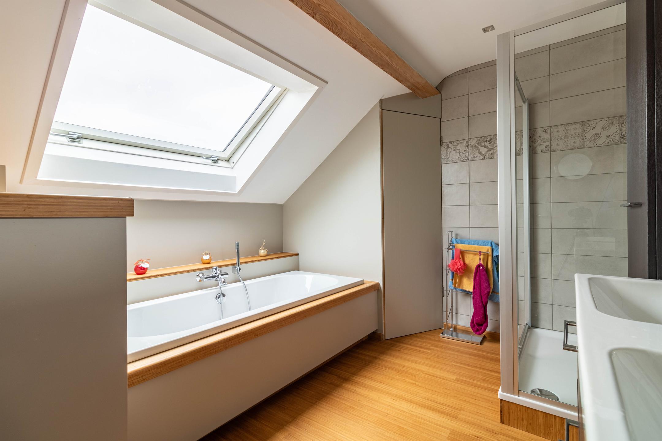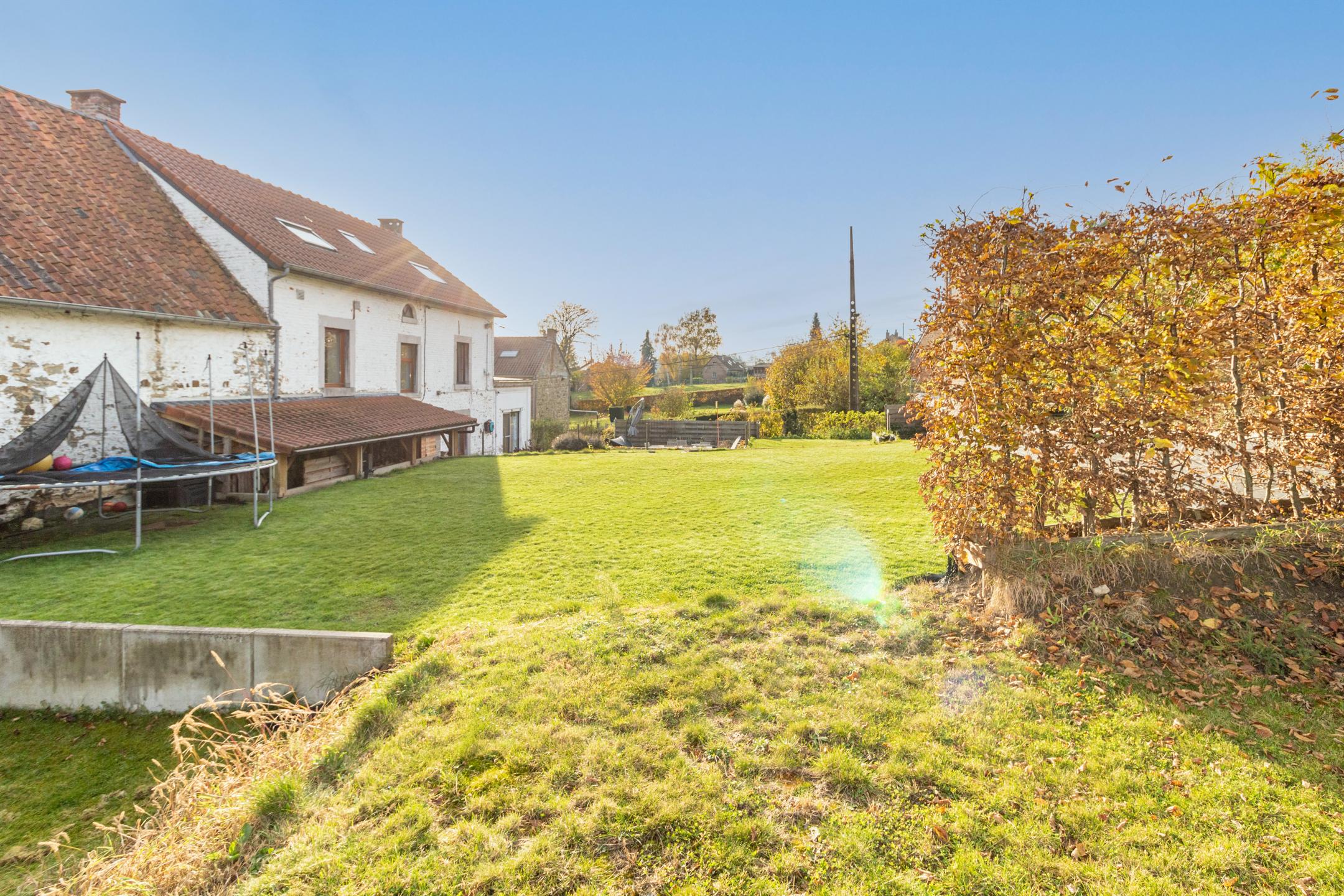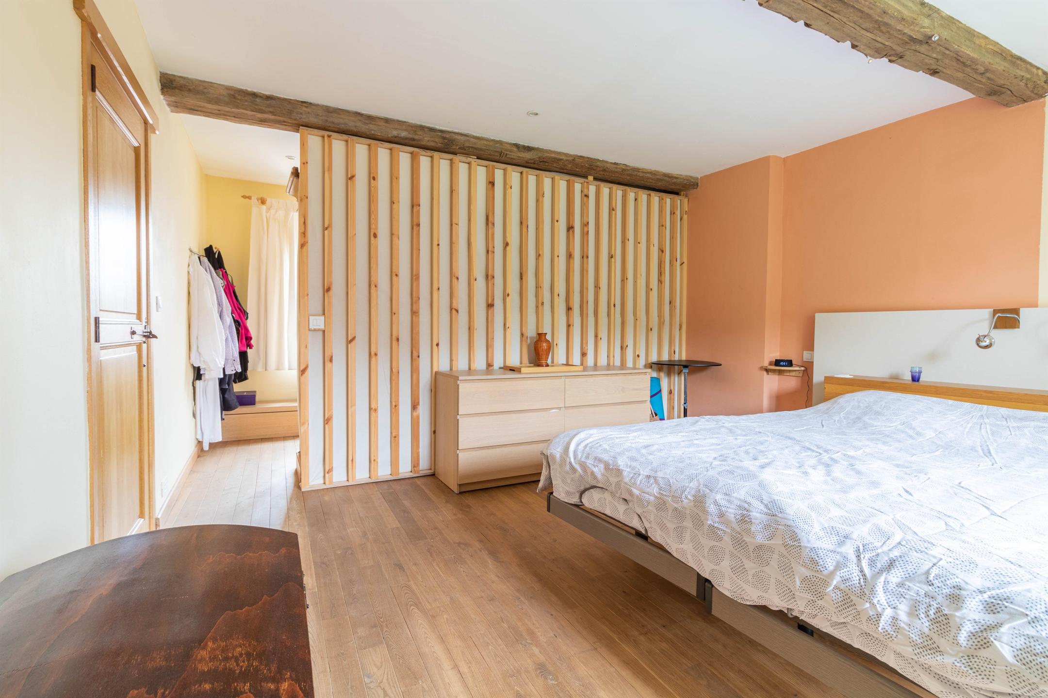 Très belle maison rénovée et aménagée avec goût, dans l’aile d’un corps de ferme en carré inscrit au patrimoine de la région wallonne, et idéalement située en campagne hesbignonne dans le petit village de Vieux-Waleffe, entre Bruxelles, Liège et Namur, à proximité de l’E42 et de l’E40. Au bout d’un chemin sans issue se dresse un somptueux porche en pierres de pays qui ouvre sur la cour de l’ancienne ferme. La maison se situe sur la droite. Elle comprend un hall d’entrée qui distribue, à gauche, sur un beau séjour avec un parquet en chêne et un poêle à bois, et à droite sur une grande cuisine équipée et une buanderie. Derrière le séjour, un grand atelier baigné de lumière, faisant pour le moment office de salle à manger, pourra accueillir divers projets : profession libérale, salle de réception, etc. Au premier étage, on trouve une chambre parentale avec dressing, un coin bureau, une salle d’eau avec douche à l’italienne et une seconde chambre. On appréciera le parquet en châtaignier et les portes en chêne. Au deuxième étage, trois autres chambres et une deuxième salle de bains avec douche et baignoire, et au sous-sol, une grande cave voûtée, en trois parties. A l’extérieur, le jardin privatif d’environ 500 m2 est agrémenté d’une grande terrasse et d’un appentis, et permet un accès direct à la rue. En pratique : chauffage central mazout (chaudière récente), citerne à eau de pluie de 10.000 l, 2 toilettes séparées aux entresols, installation électrique récente (en partie domotique), bonne isolation ! Enfin, cerise sur le gâteau, la grange attenante sur la droite de la maison, qui abrite pour le moment la chaufferie et un espace atelier, offre encore – avec une superficie de l’ordre de 50 m2 au sol sur 3 niveaux – un beau potentiel de rénovation et de multiples possibilités : extension de l’habitation principale, second logement séparé, espace professionnel, etc. Calme, charme et authenticité sont au rendez-vous !! Infos et visites : 019 51 15 50 ou [email protected]