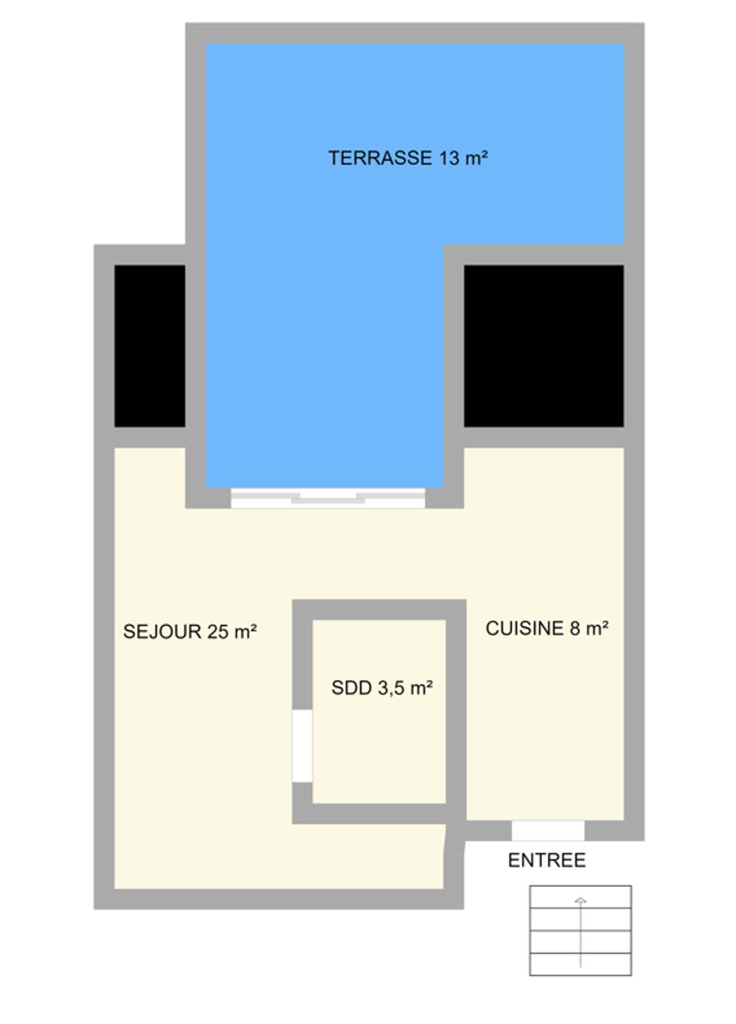 Idéal pour une personne seule, situé au 2ème étage d’un petit immeuble de rapport composé de deux appartements et d’un studio.