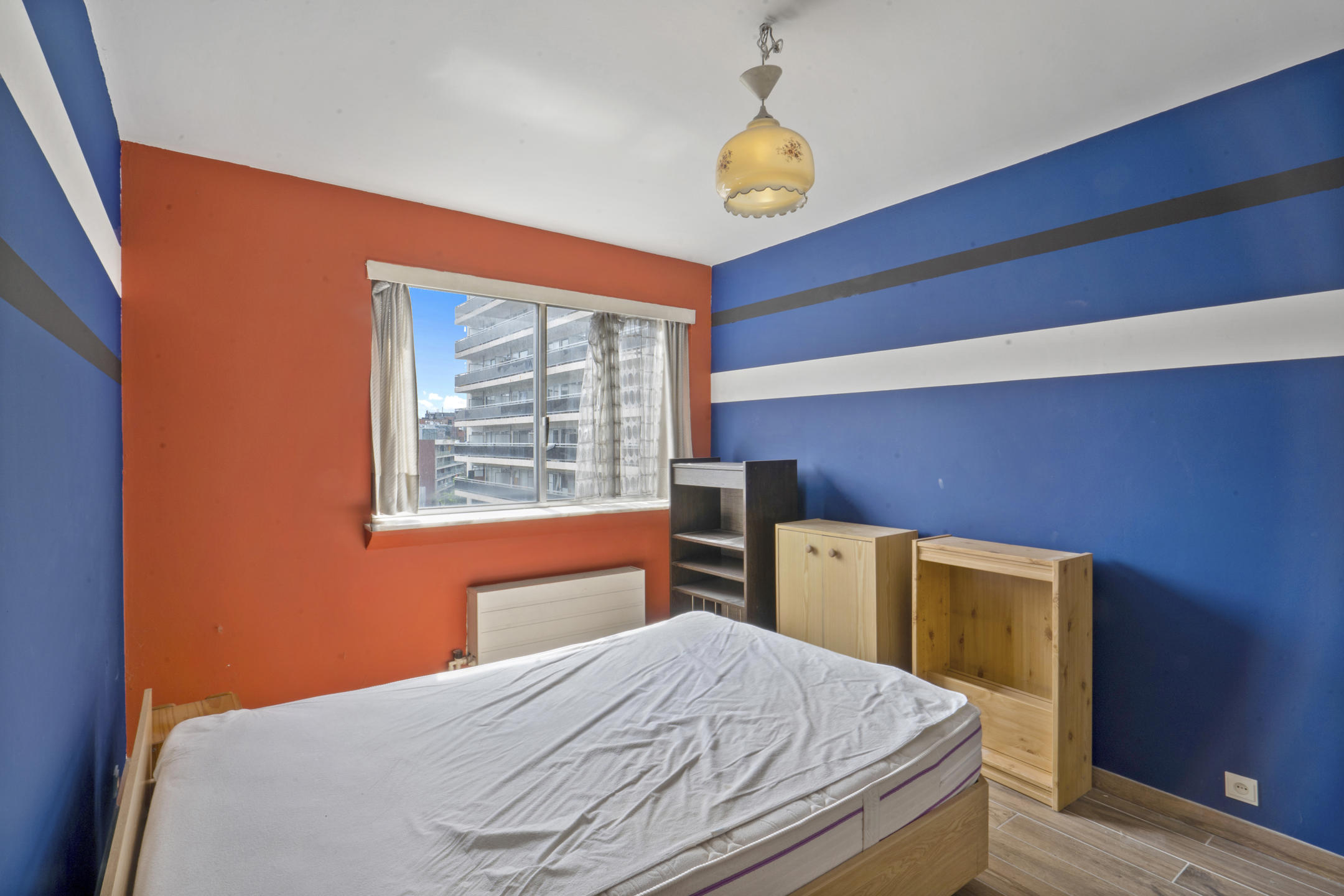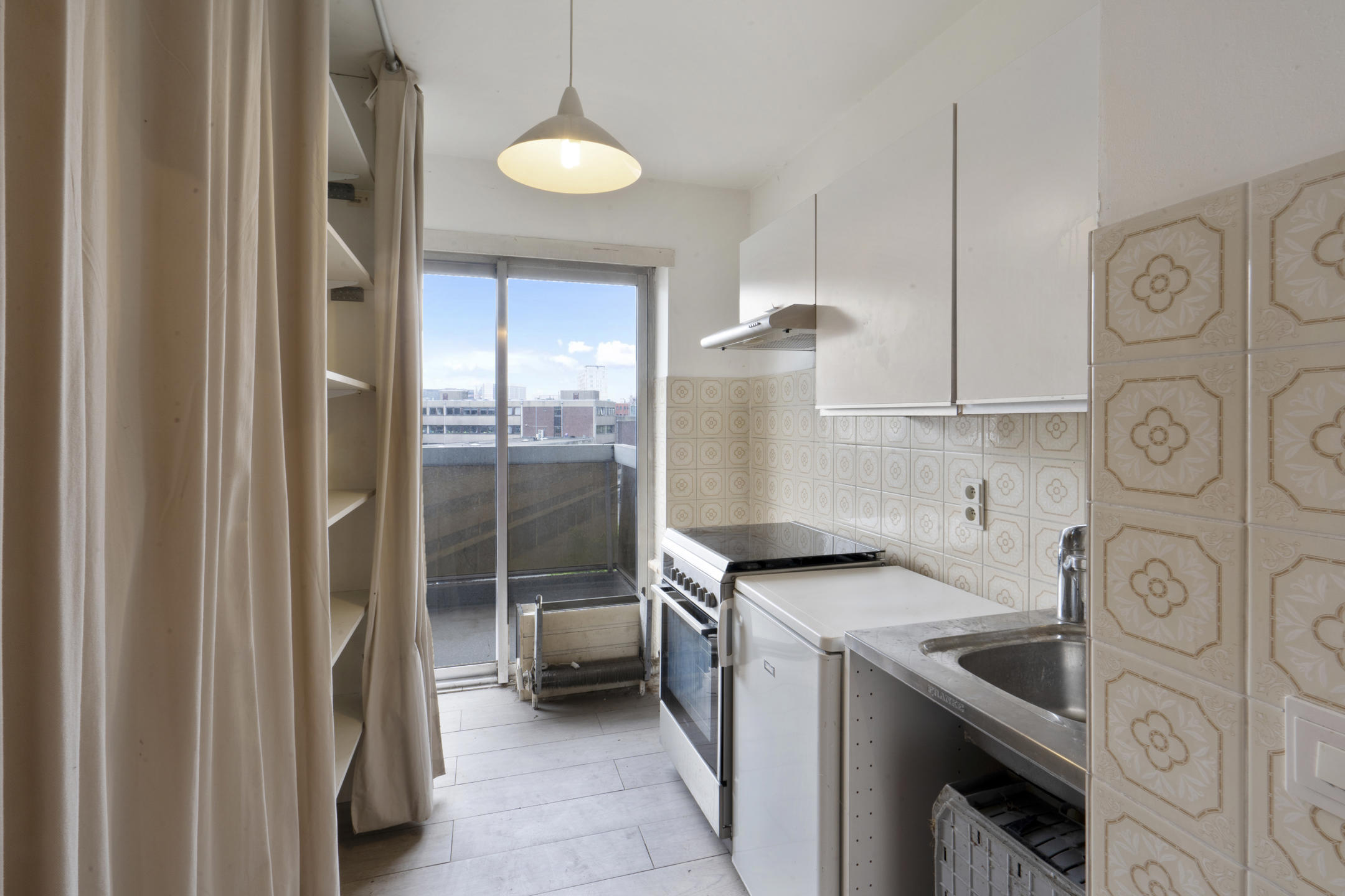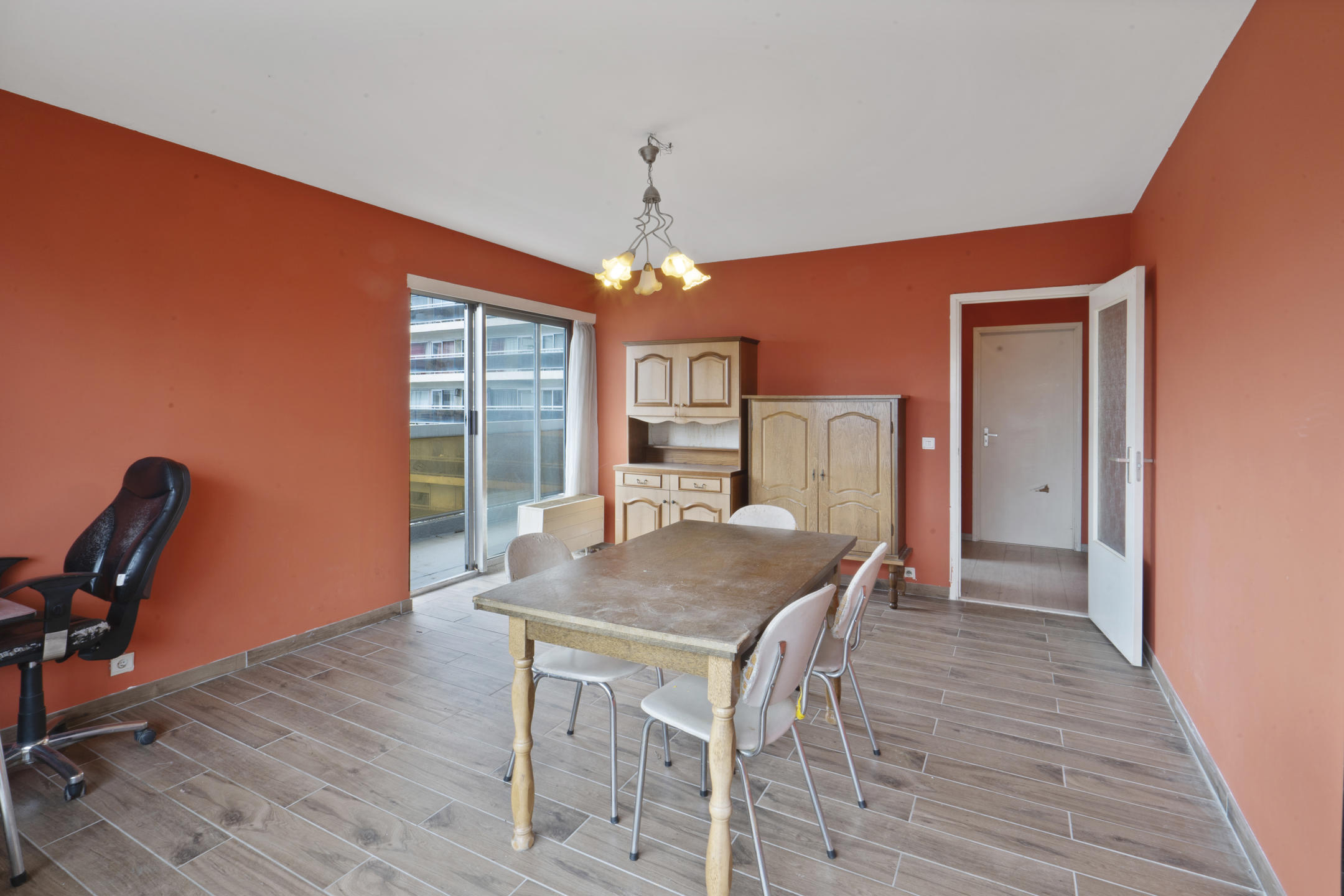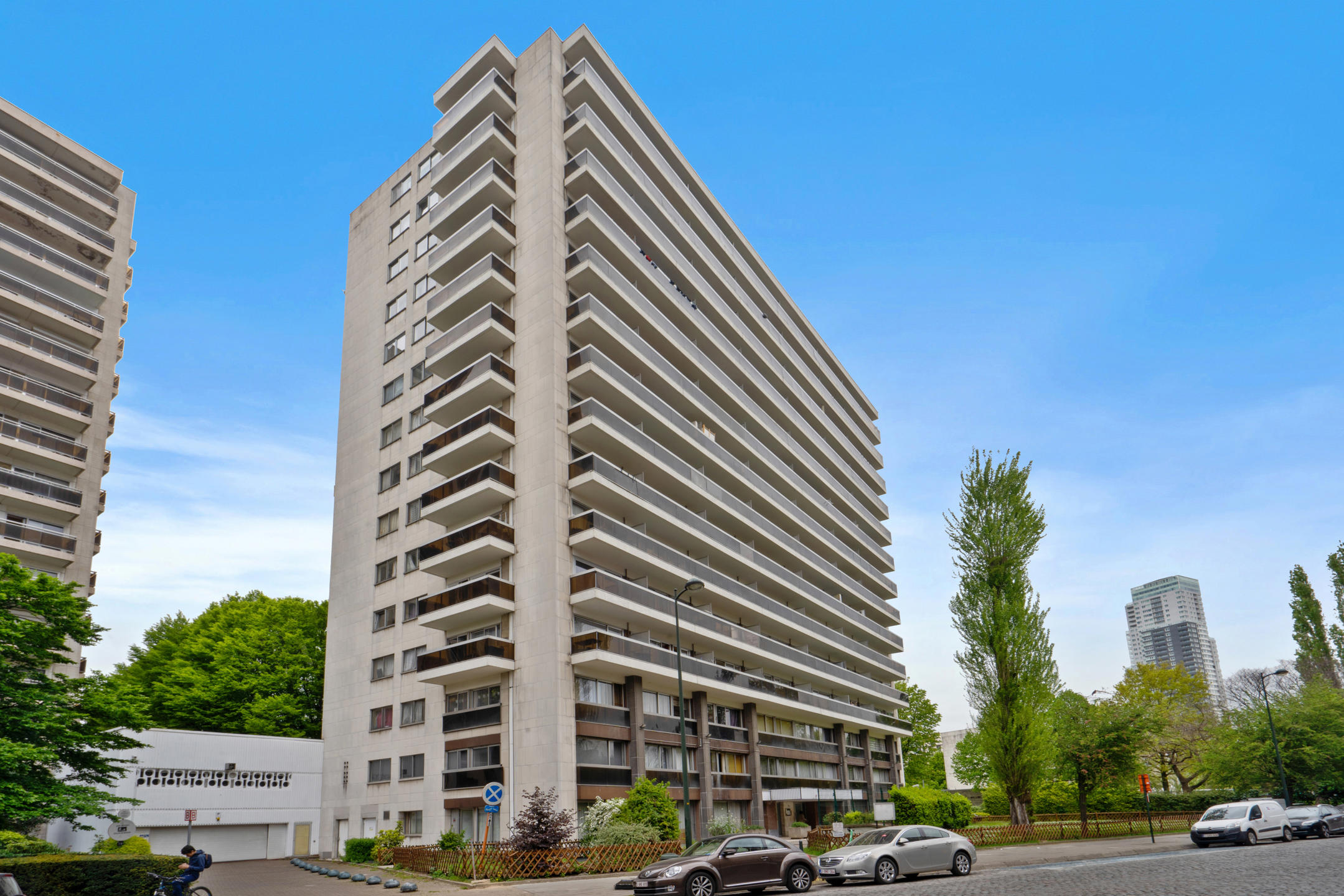 Situé au 6è étage d’un immeuble en bordure d’un beau parc, l’appartement fait une superficie d’environ 50m² et se compose comme suit : une agréable pièce de vie donnant sur 2 balcons (respectivement orientés Sud et Ouest), une cuisine semi-équipée (donnant sur le balcon Ouest), un hall de nuit avec placards, une chambre de 12m², une salle-de-douche (douche à l’italienne, simple vasque et radiateur sèche-serviettes), un wc séparé et un débarras.