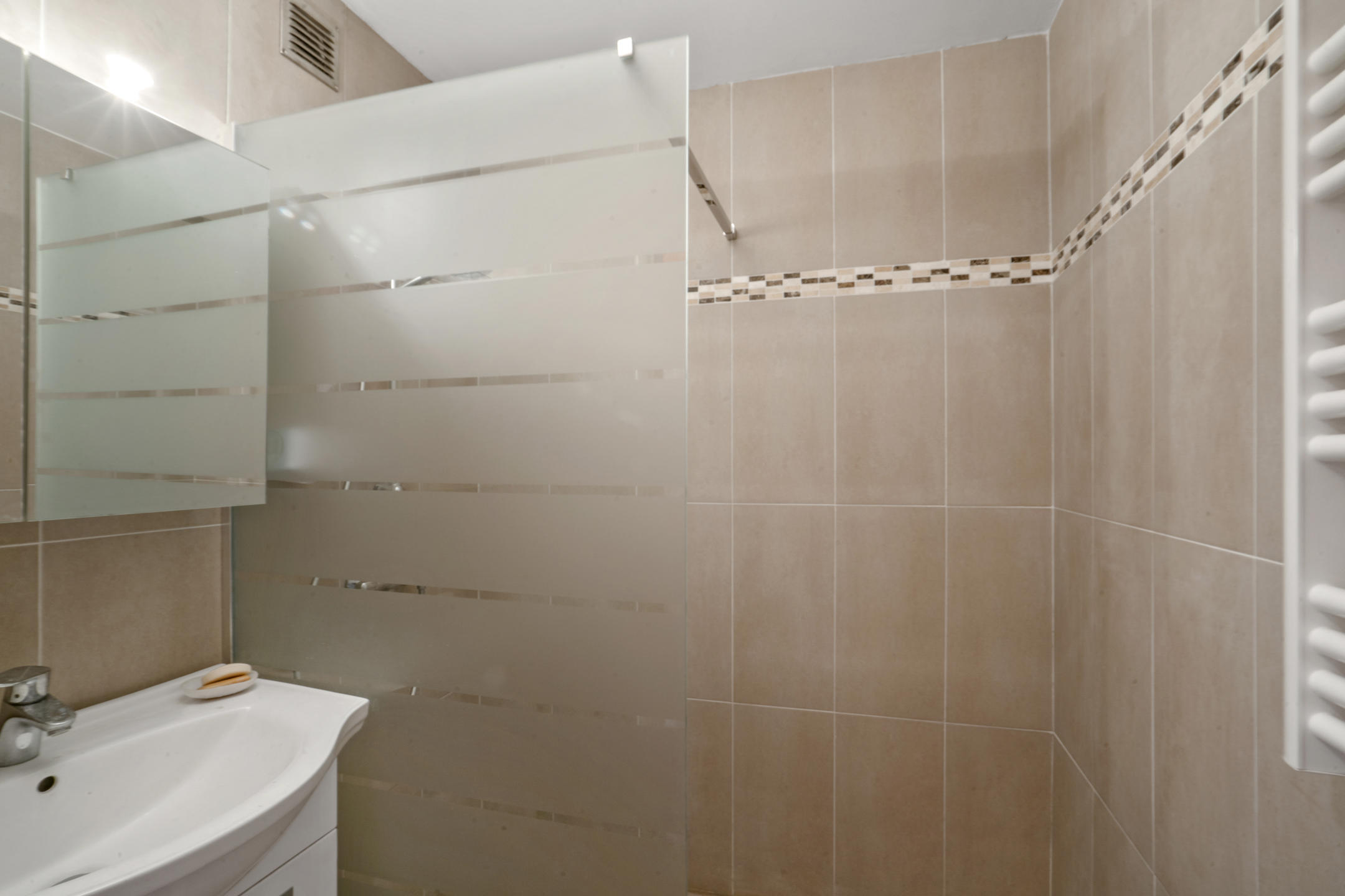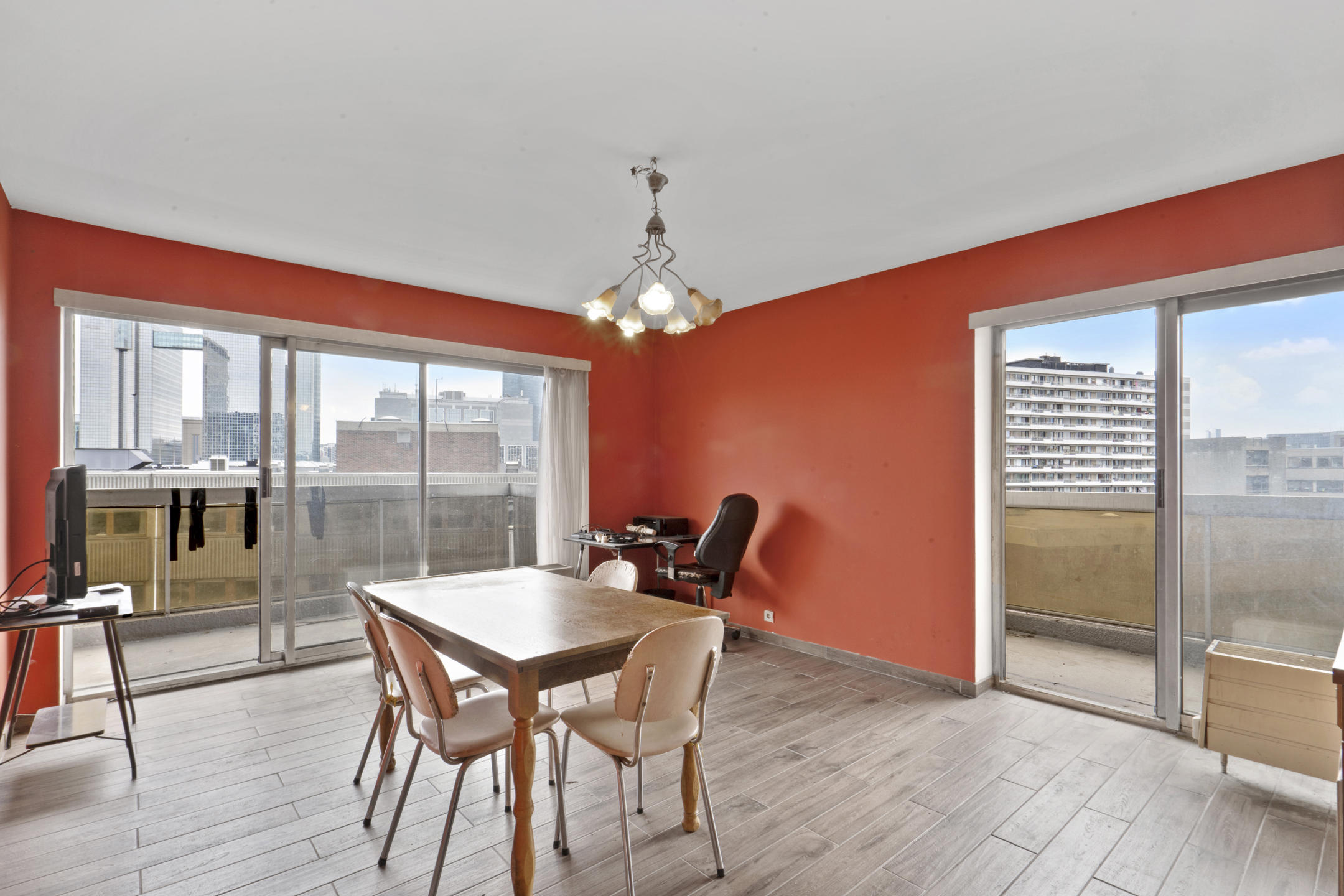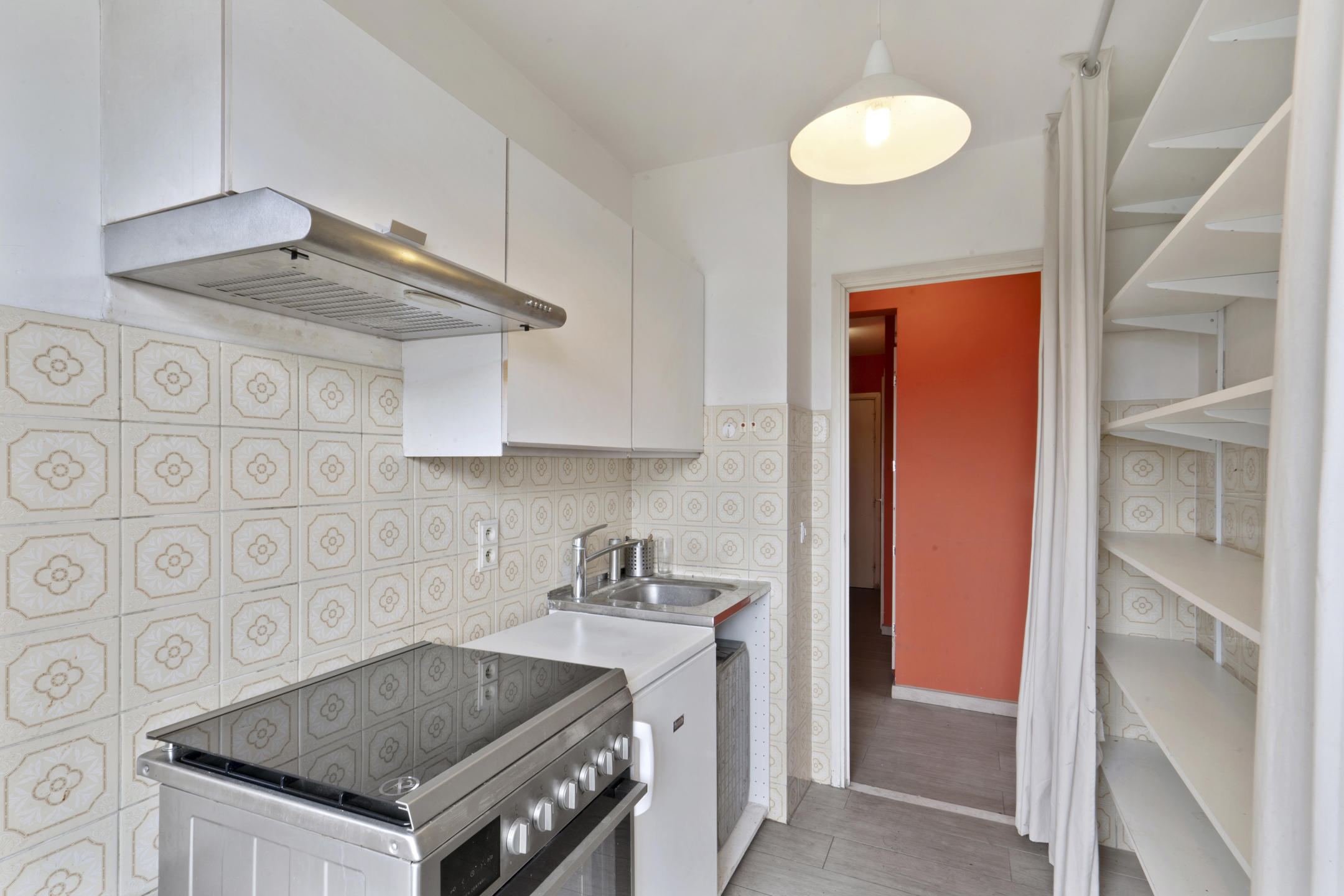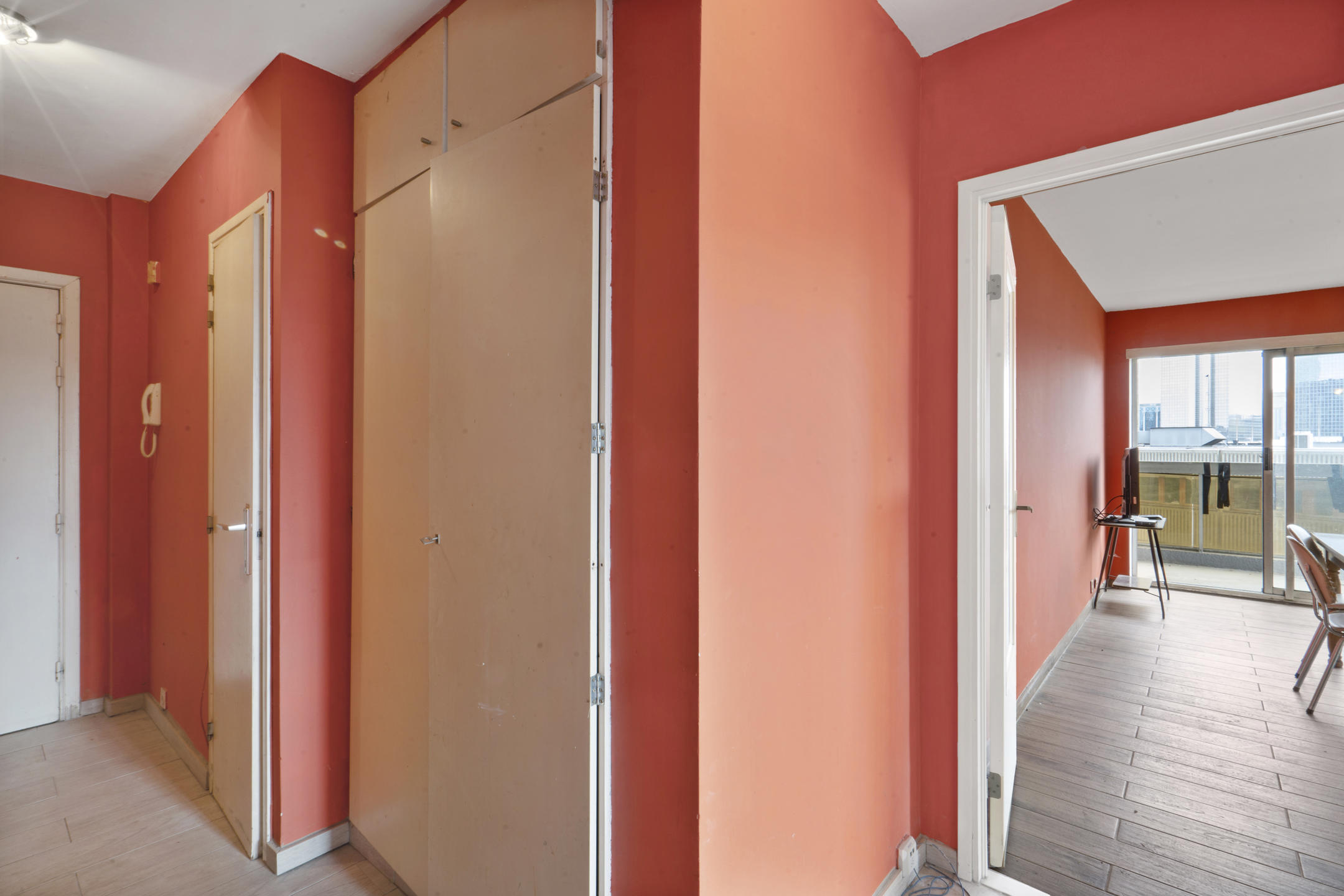Situé au 6è étage d’un immeuble en bordure d’un beau parc, l’appartement fait une superficie d’environ 50m² et se compose comme suit : une agréable pièce de vie donnant sur 2 balcons (respectivement orientés Sud et Ouest), une cuisine semi-équipée (donnant sur le balcon Ouest), un hall de nuit avec placards, une chambre de 12m², une salle-de-douche (douche à l’italienne, simple vasque et radiateur sèche-serviettes), un wc séparé et un débarras.