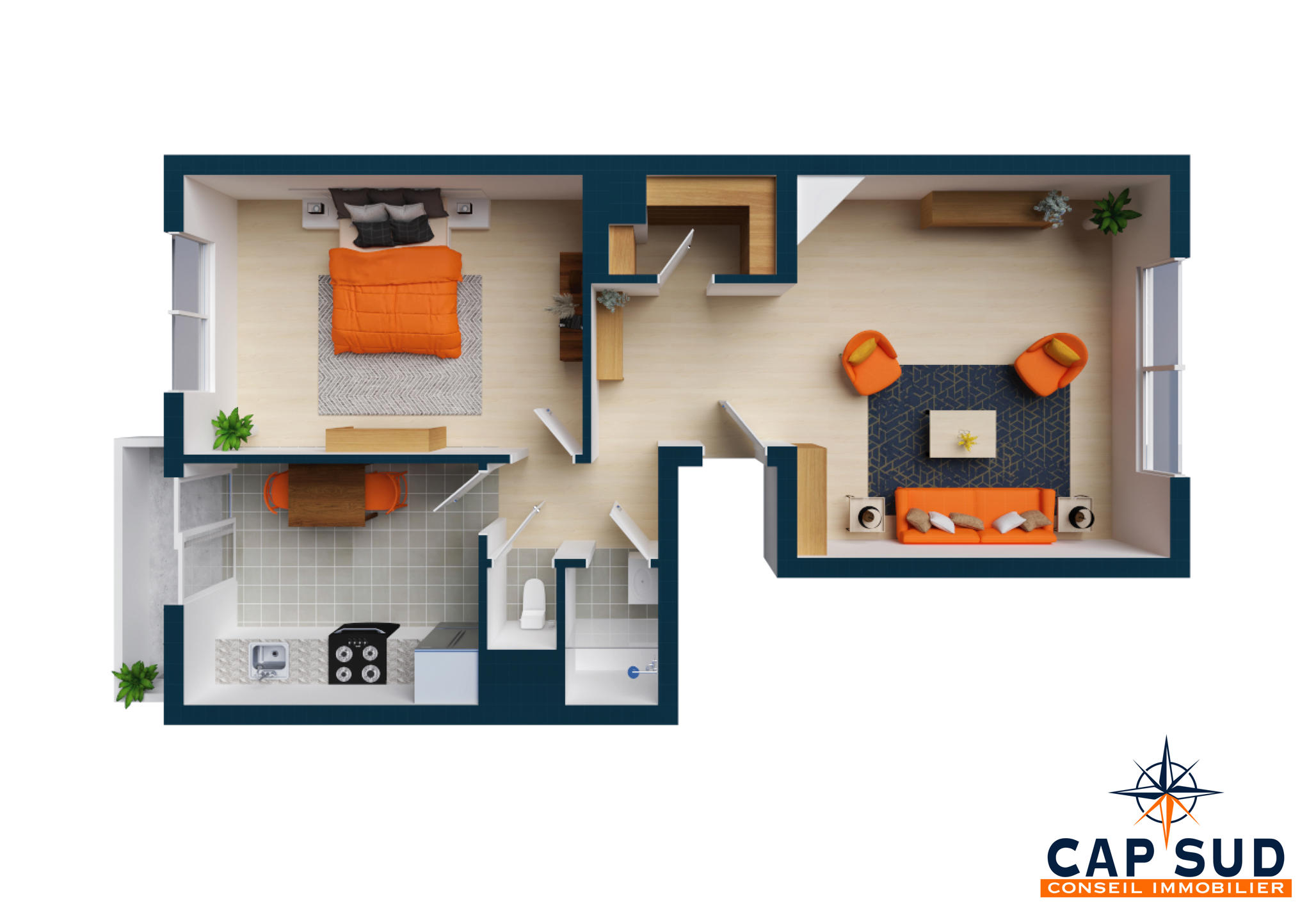 Il se compose d’une chambre, d’une salle de bain, d’une cuisine semi équipée, d’un agréable séjour, d’une petite terrasse à l’arrière ainsi que d’une double cave.