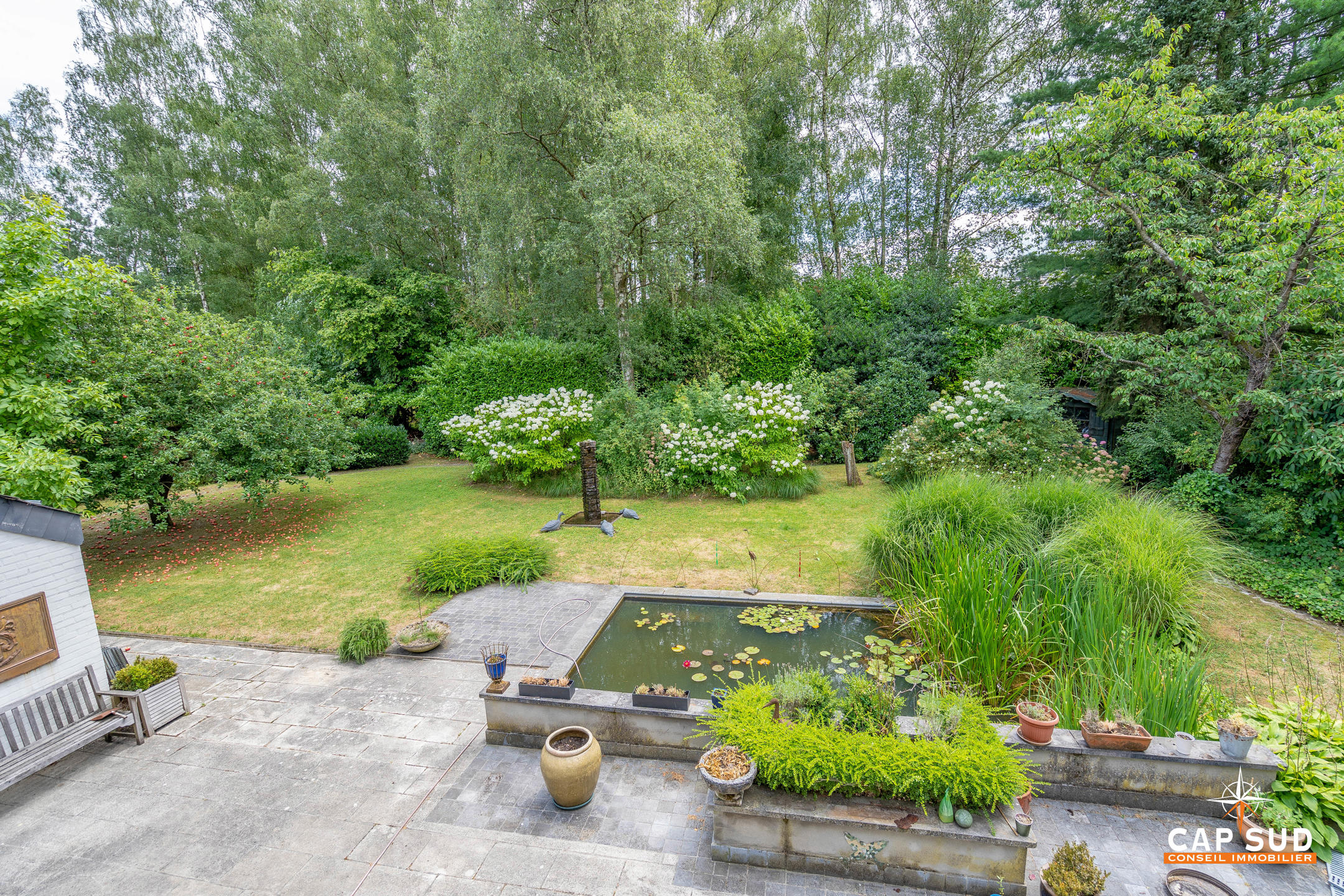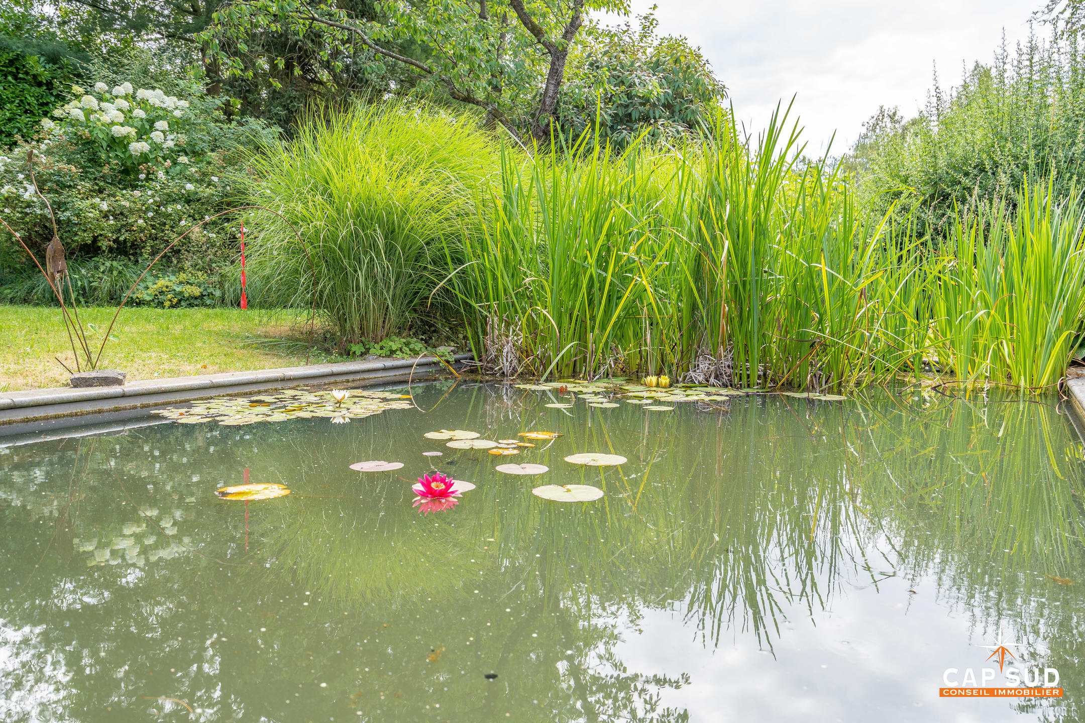 A l’extérieur: 2 parkings. Un magnifique jardin orienté SUD avec sa piscine convertie en pièce d’eau naturelle avec ses poissons et plantes aquatiques et sa sculpture d’eau. Cabanon de jardin.