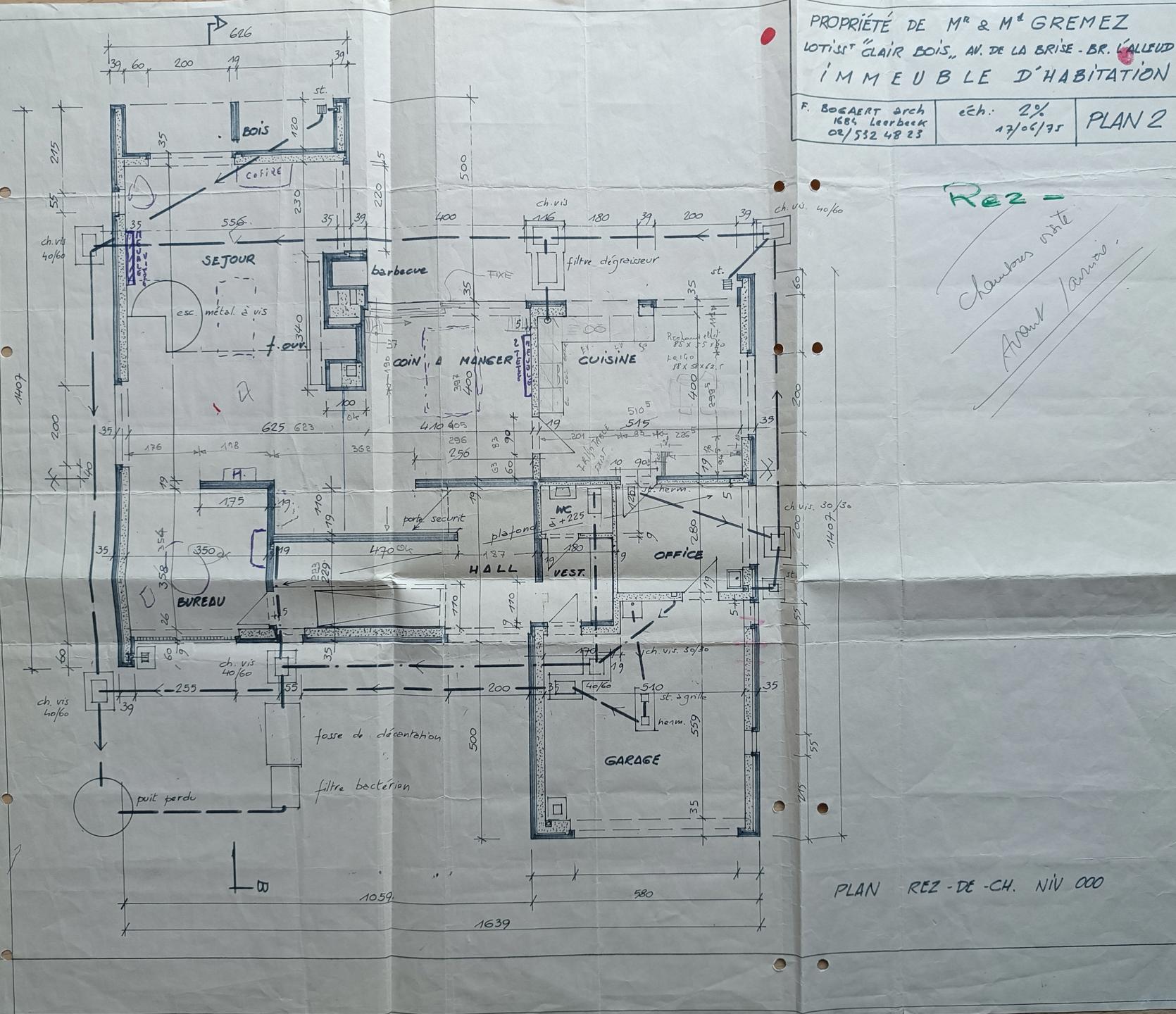 Celle-ci dispose au rez d’un hall d’entrée accueillant, un living avec insert à bois (±55 m²), une sàm (±16 m²), une cuisine avec son coin déjeuner (±21m²), une arrière cuisine servant de salle de repassage/couture, un grand bureau (±13 m²), un atelier en véranda (±17 m²), un vestiaire avec wc1 et un grand garage 2 voitures porte automatique avec accès au hall d’entrée et à l’arrière-cuisine.