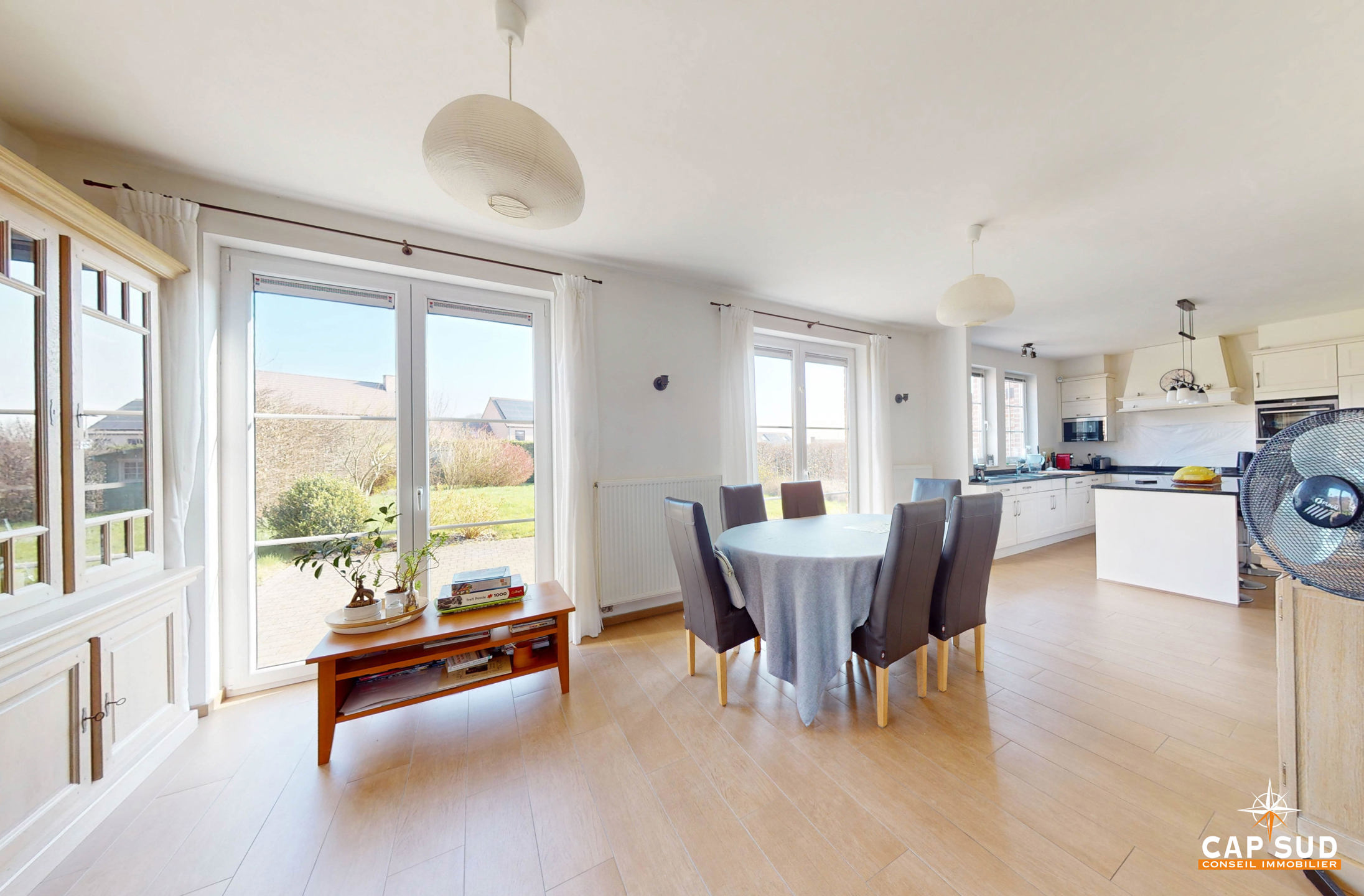 L’articulation des pièces de vie se fait autour du hall d’entrée: living en L avec cuisine équipée et ilot central, wc, buanderie et garage