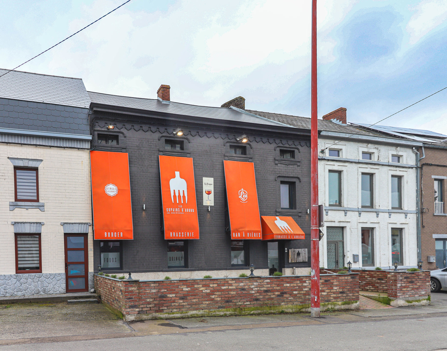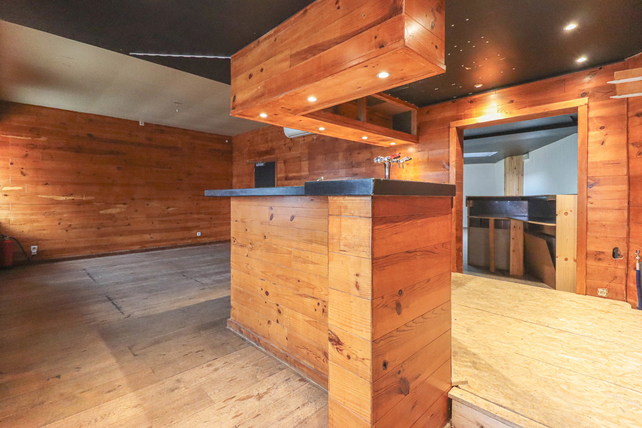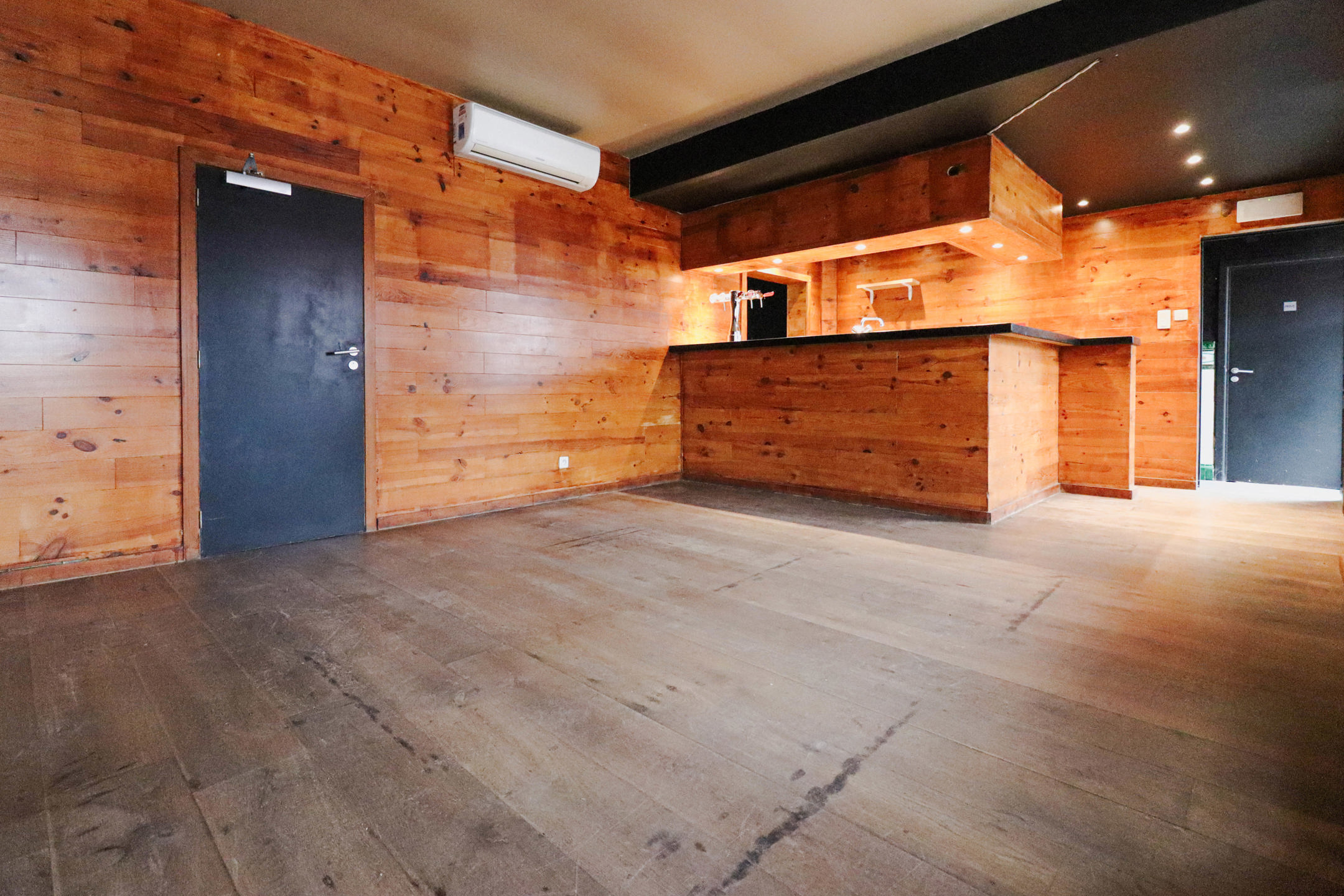 Au rez-de-chaussée se trouve un hall d’entrée desservant une partie bar de +/- 31m², une surface de salle d’environ 75m², un espace cuisine + réserve de +/- 32m², ainsi qu’un WC PMR.