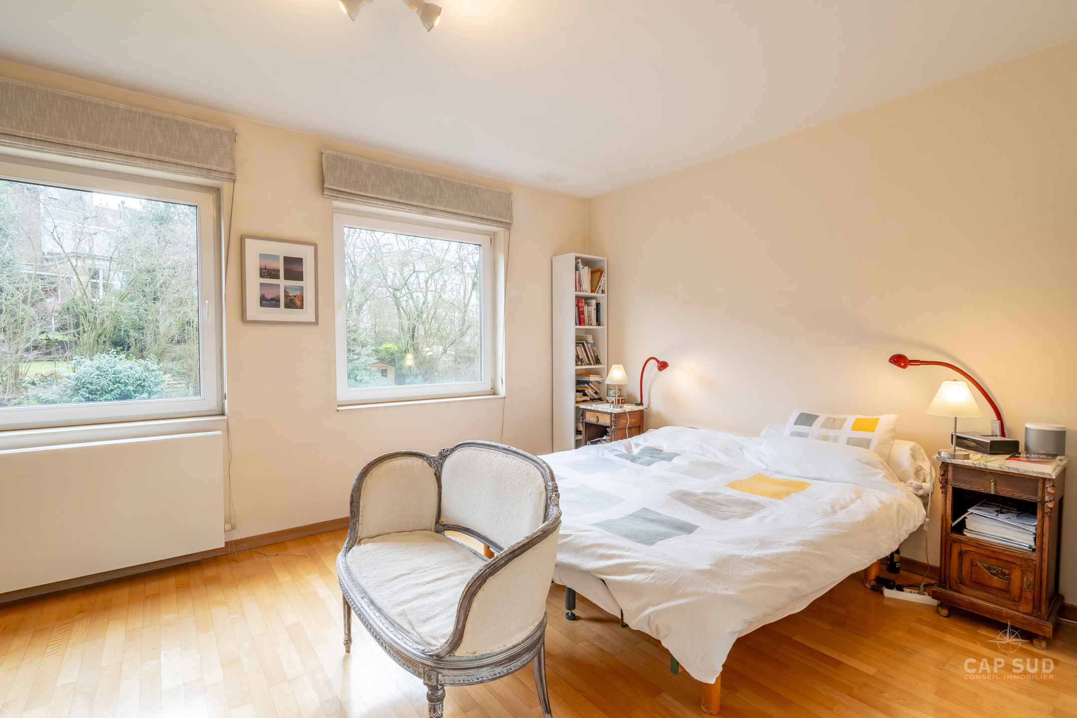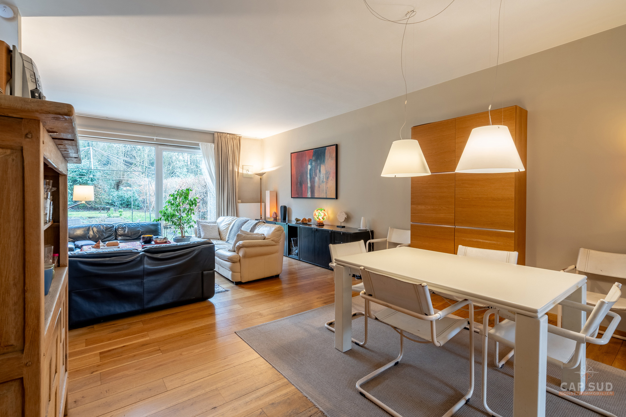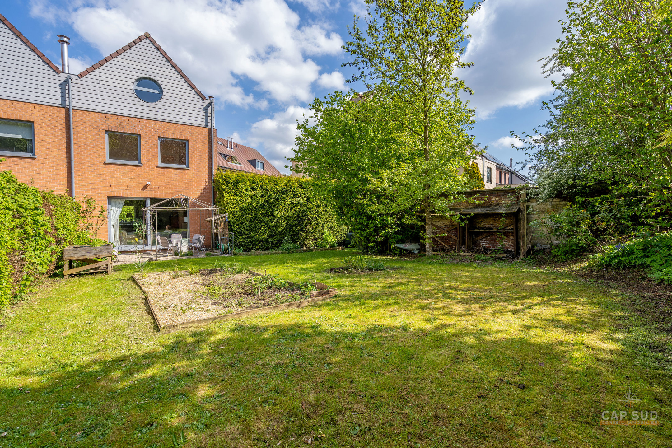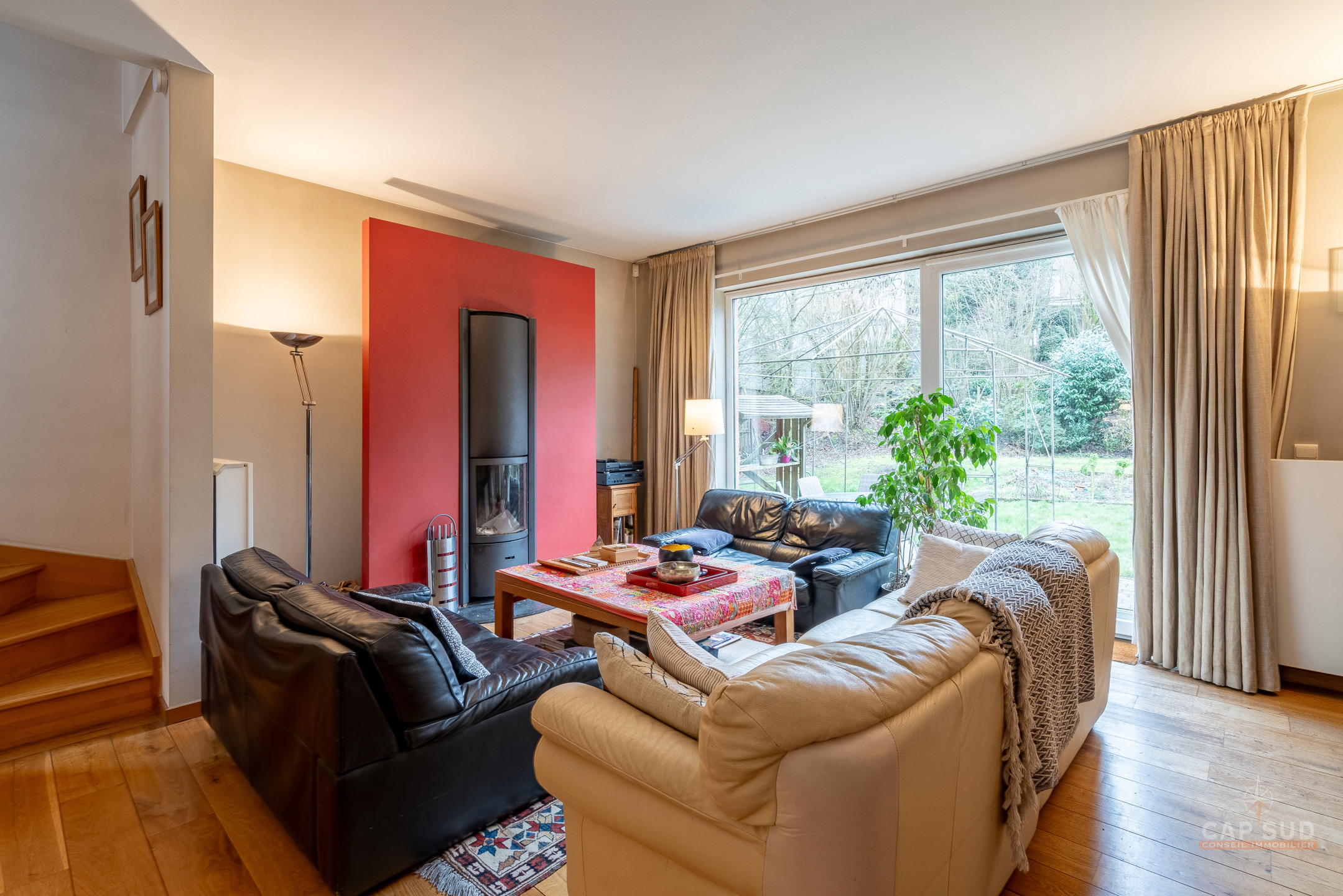 WATERLOO CENTRE – Dans un quartier résidentiel calme et arboré, à proximité immédiate du centre ville (à moins de 100m de Ducobu pour les connaisseurs! ), située à l’extrémité d’une rue sans issue, CAP SUD vous propose cette maison d’architecte (Damien CAUWE) de 2004 de 200m2 sise sur un terrain de 3,98ares orienté Sud. Très originale par sa façade, cette maison révèle ses incroyables atouts dès que vous franchissez les quatres marches qui vous ouvrent à un séjour et un jardin étonnants. Vous trouverez donc au rez, un hall d’entrée menant à un lumineux living de 40m2 avec FO donnant d’une part sur la terrasse et un jardin joliment sans vis-à-vis et arboré, et d’autre part sur la cuisine ouverte équipée de 12m2. Au 1er étage, le hall de nuit dessert 2 belles chambres de 18 et 19m2, une salle de bains et une salle de douche. Au 2ème étage se trouvent 2 grandes chambres mansardées de 19m2 chacune, une salle de douche et un espace buanderie (avec WC). Au sous-sol : un garage privé et un espace en copropriété. 2 parkings extérieurs, FO STUV (3 positions), système d’alarme, VMC simple flux, plancher au sol, porte de garage automatique, châssis PVC DV bi-colore 2004. PEB: B – 163kWH/m2.An…Rare opportunité sur Waterloo ! Volumes parfaits, esthétique, rationalité et gaité sont les Maîtres Mots de ce bien ! A découvrir rapidement…