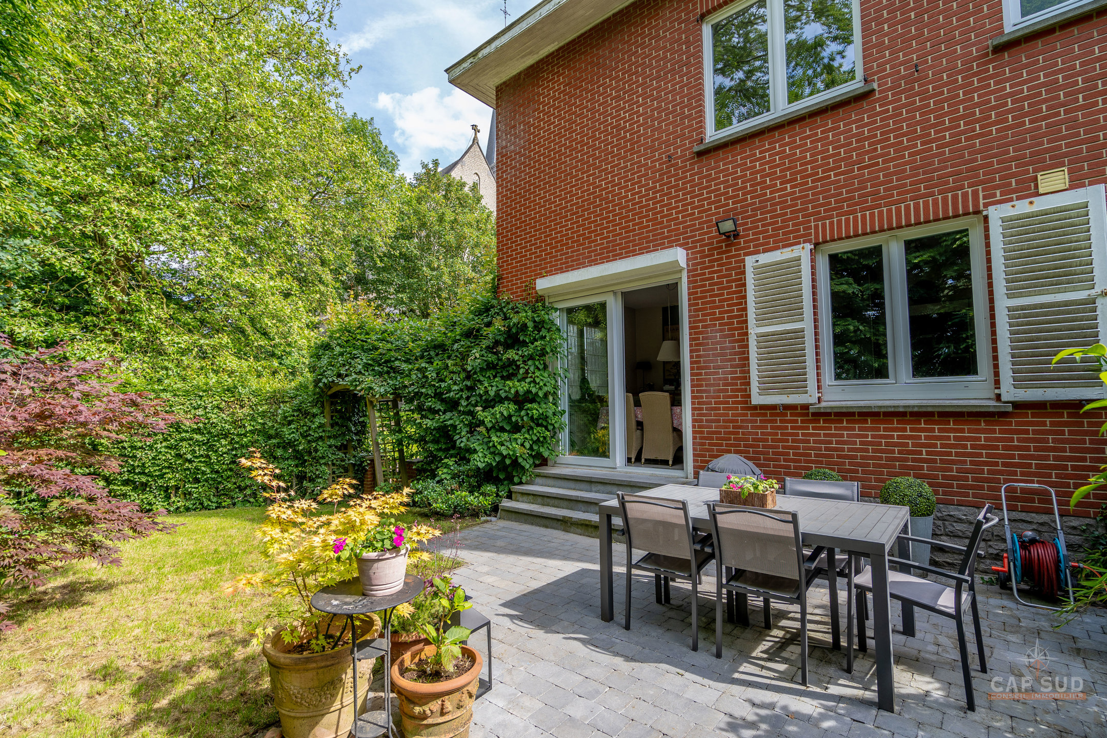 SOUS OPTION – Merci aux propriétaires pour leur confiance ! Waterloo – CHENOIS – A proximité de la gare, des écoles et des commerces, CAP SUD vous présente cette ravissante maison de 216m2 sise sur un terrain de 1,98a plongé dans un écrin de verdure. Au rez-de-chaussée, le hall d’entrée vous mène d’une part dans un lumineux living de 27m2 et d’autre part dans la salle à manger de 11m2 donnant sur le jardin et sur la cuisine équipée de 7m2 (comprenant hotte, taque vitro, four, double évier, lave-vaisselle et frigo), espace vestiaire et local WC. Au 1er, le hall de nuit dessert 3 chambres de 8, 13 et 14m2, un bureau de 8m2, et une salle de bains (comprenant un double lavabo et une douche XL). Au 2ème, vous trouverez une grande chambre de 32m2. Le sous-sol est composé de deux caves, un local de chauffe et un garage 1voiture pour un total de 45m2. Châssis PVC DV, chaudière Buderus, volet automatique, la fibre vient d’être installée, marbre et parquet en chêne massif au sol. Situation très calme et sans vis-à-vis…Venez la découvrir rapidement !