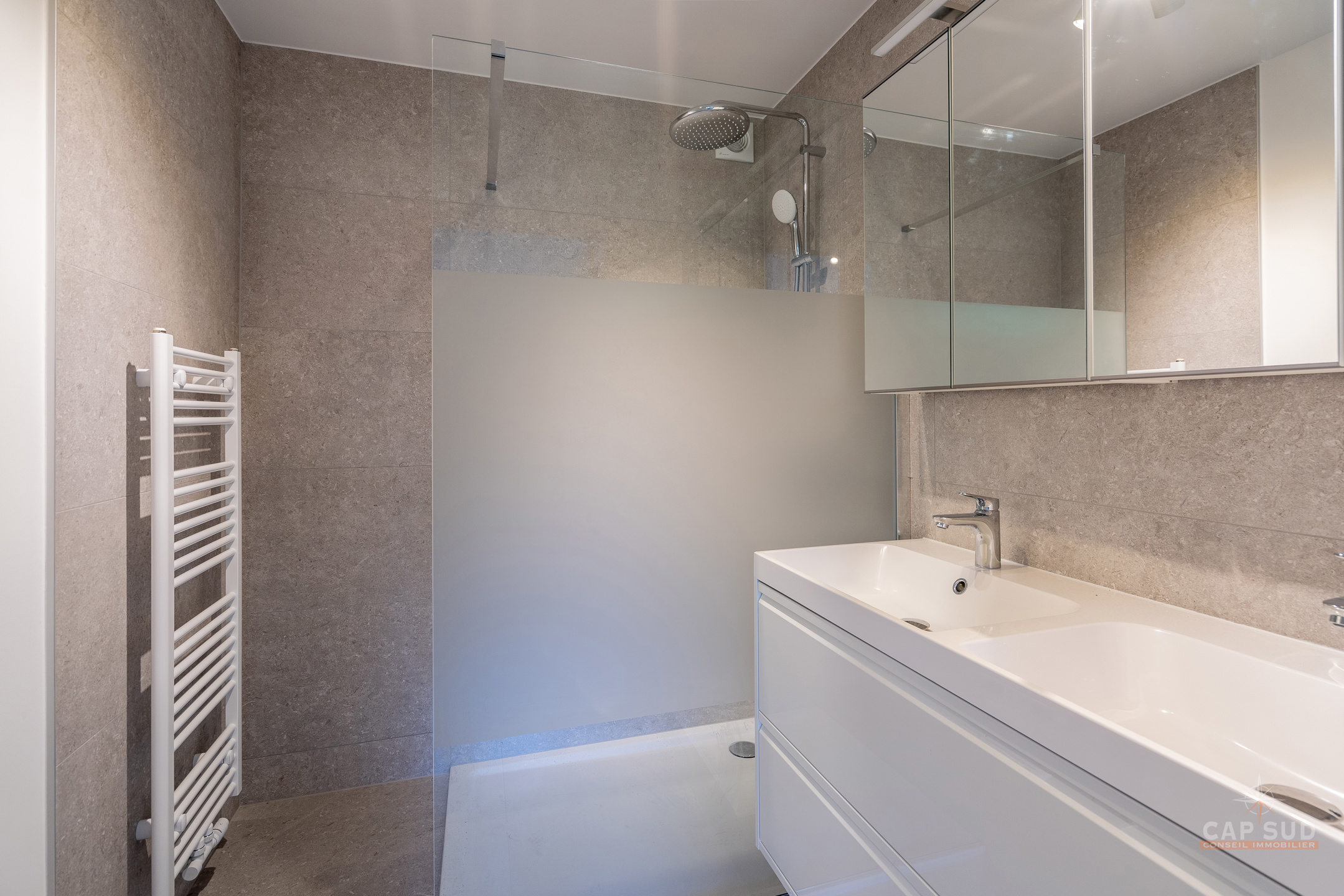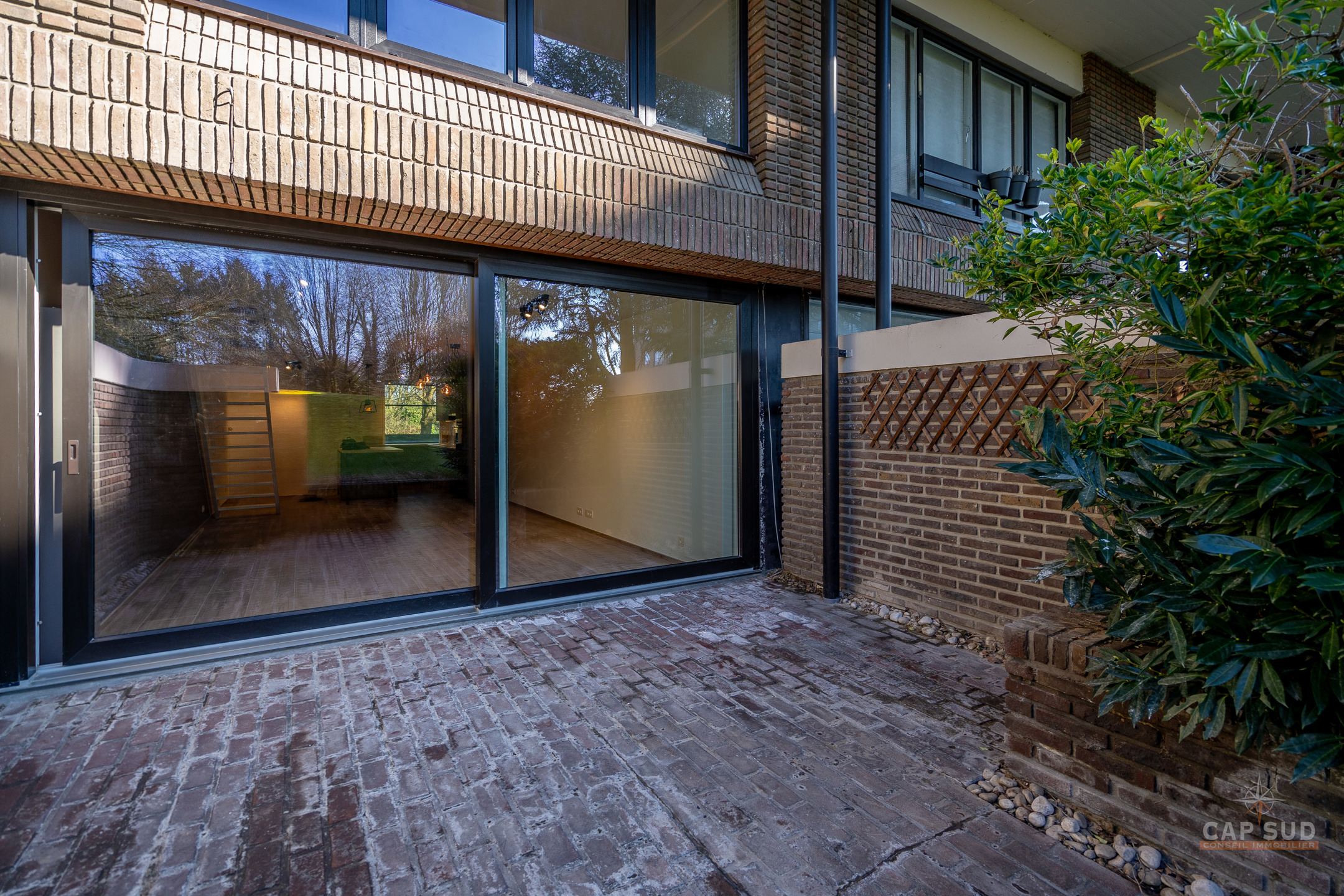 Une terrasse de +- 16m2 orienté Ouest. Un emplacement de parking intérieur, une cave. Luminaires inclus.