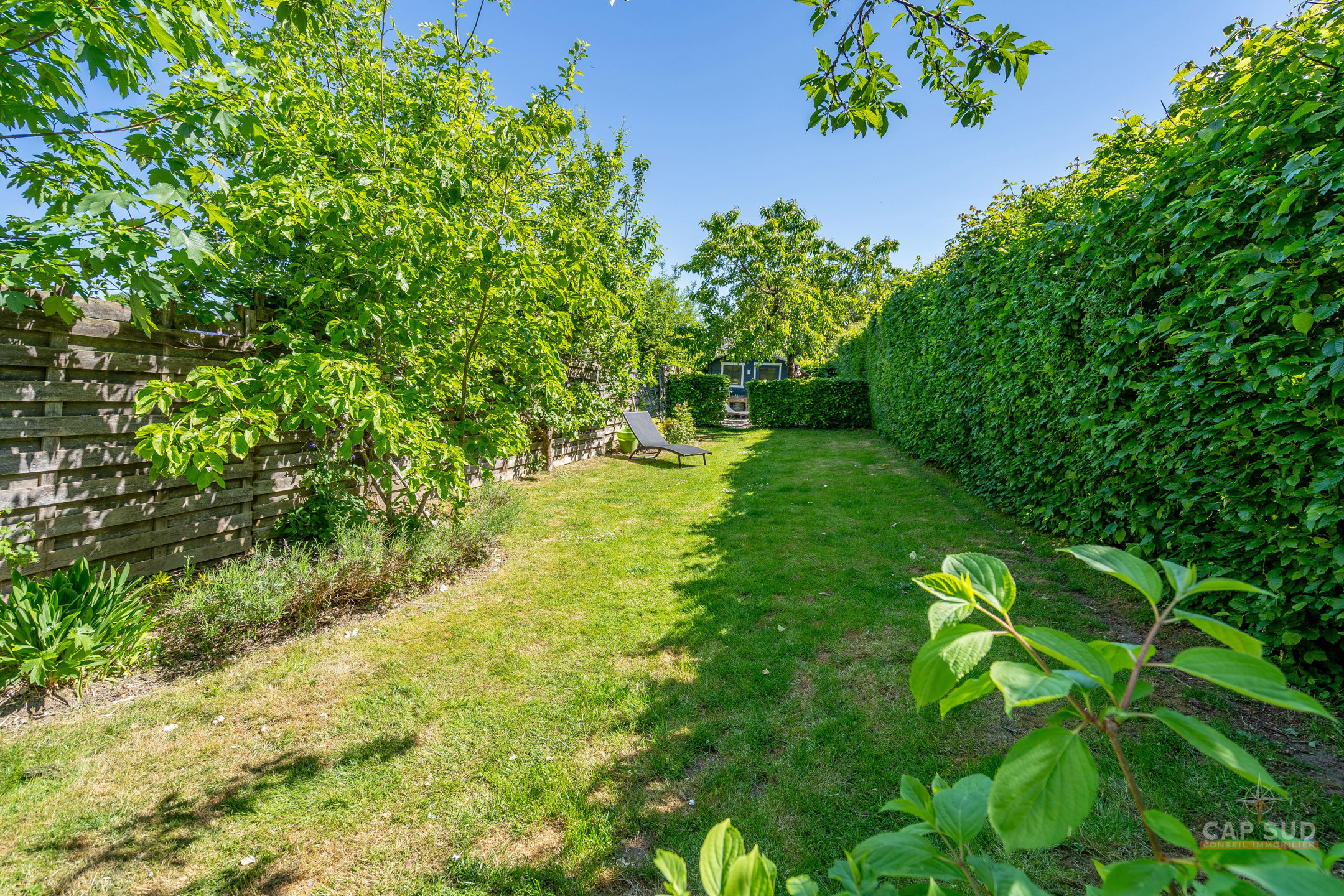 Charmante terrasse donnant sur le jardin joliment arboré.