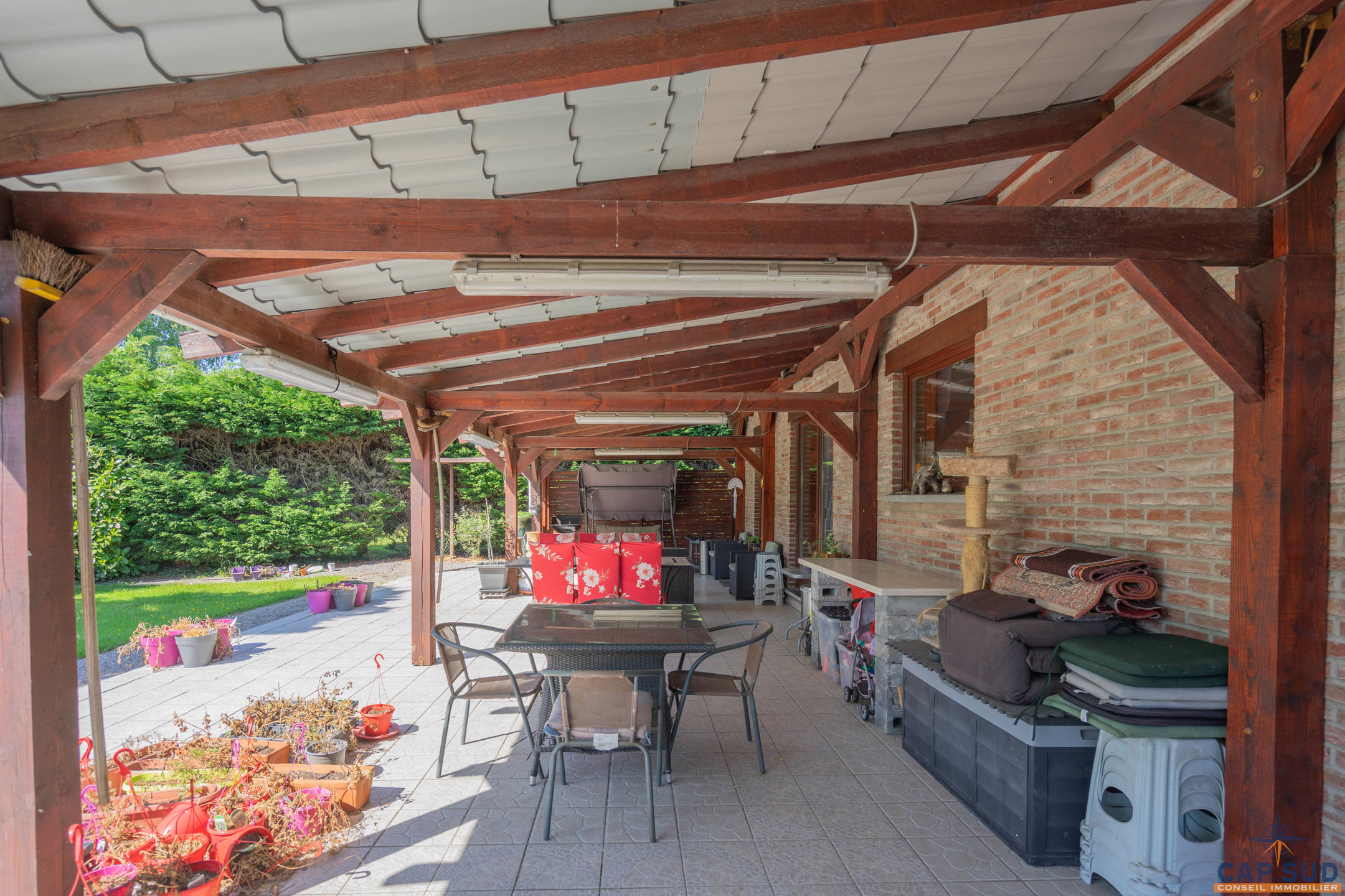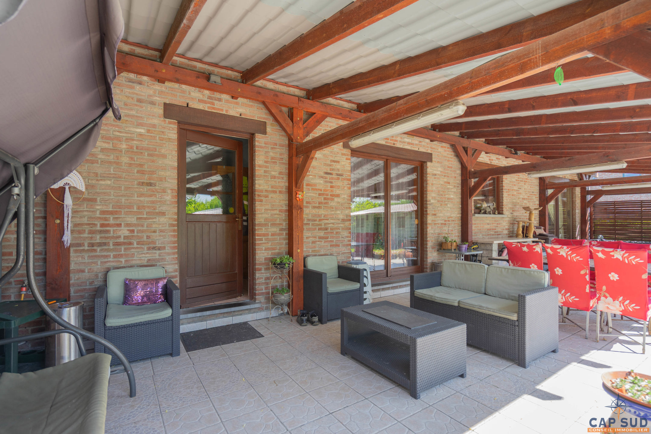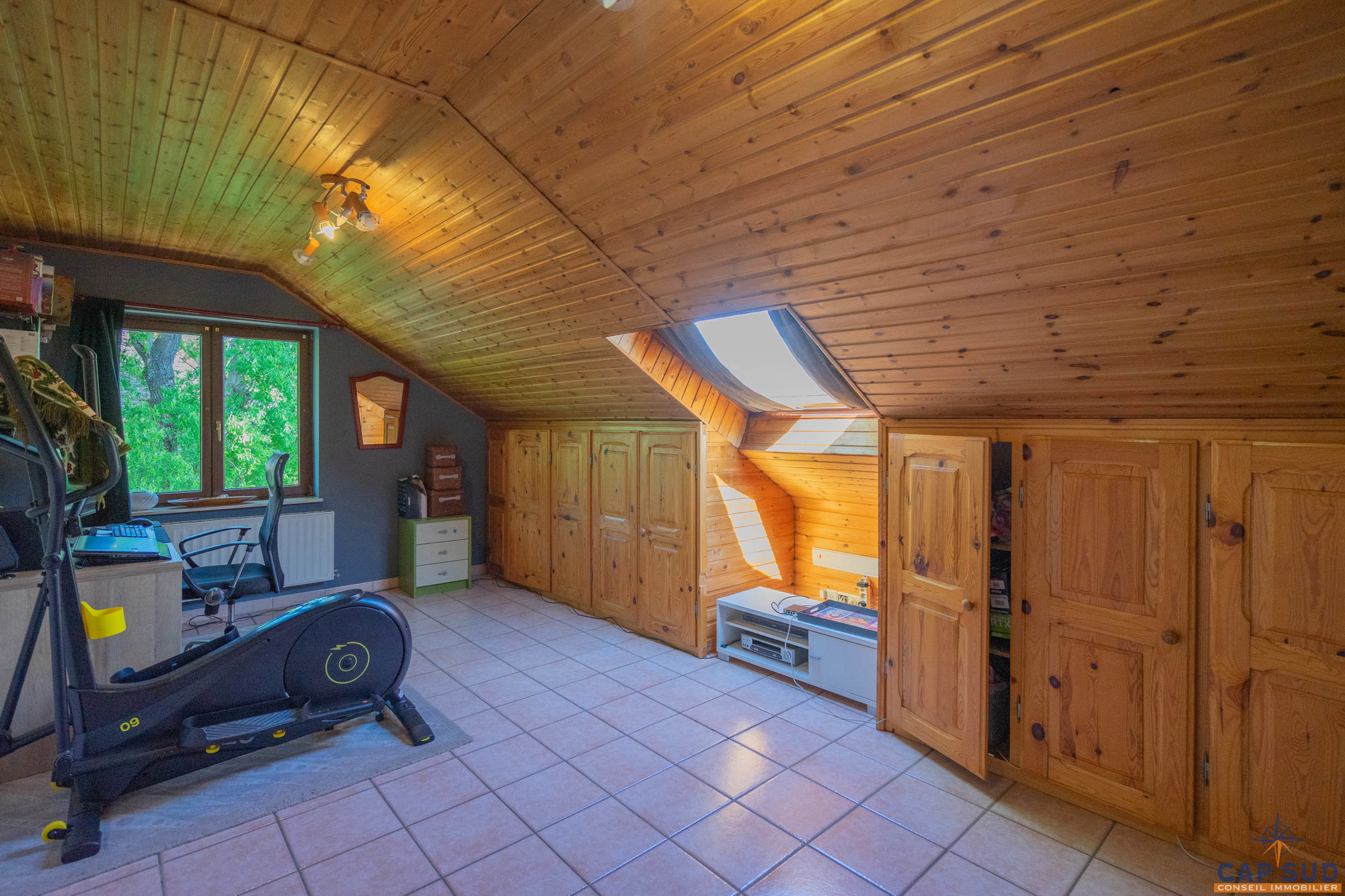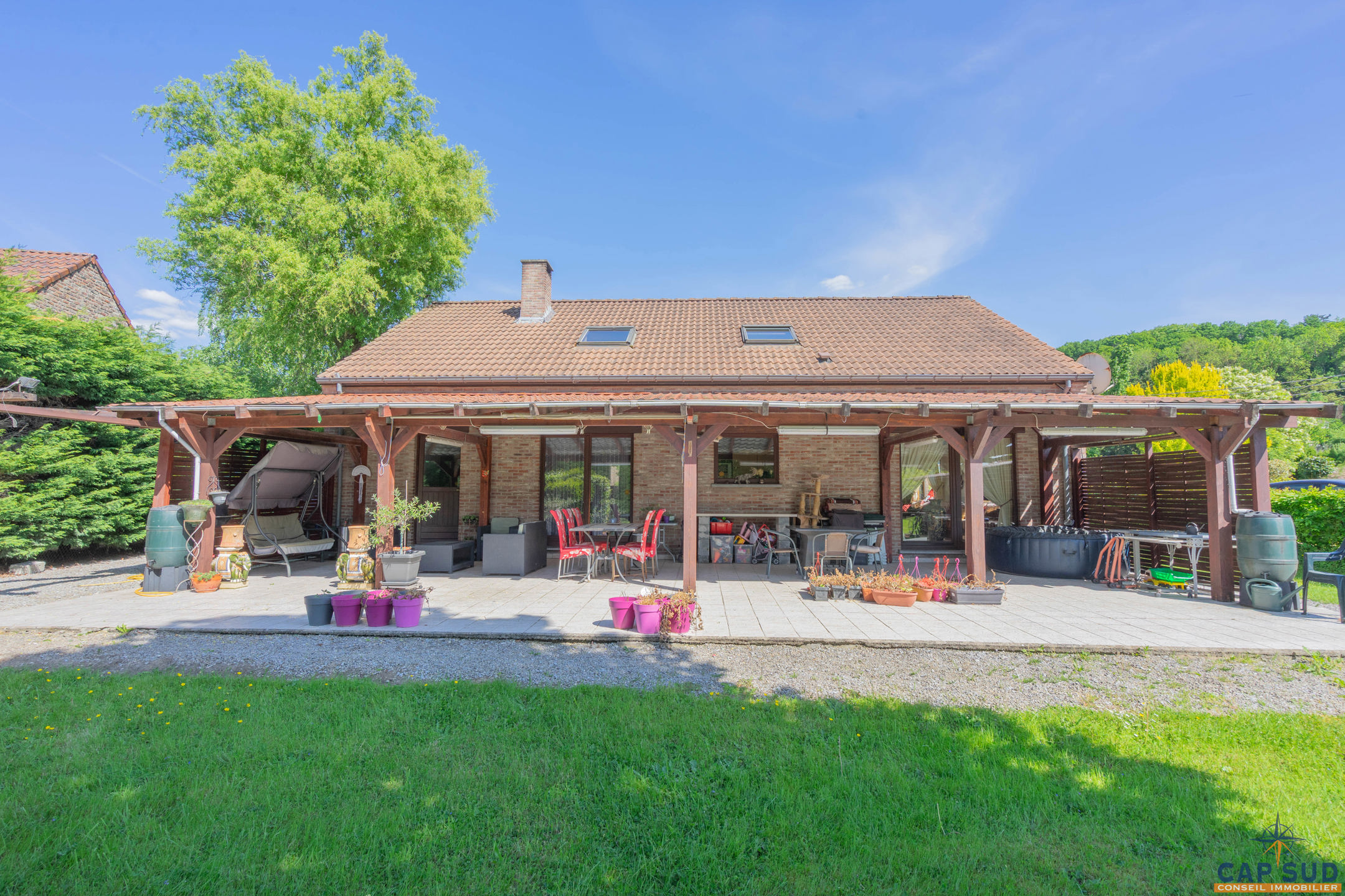 Dès l’entrée, vous serez accueilli par un grand hall équipé d’un WC séparé. Le rez-de-chaussée se compose d’un lumineux séjour avec salle à manger, d’une cuisine équipée conviviale, ainsi que d’un second salon actuellement aménagé en espace d’accueil. L’ensemble de ces pièces de vie donne accès à une vaste terrasse de 70 m² entièrement couverte, idéale pour profiter de l’extérieur en toute saison. Une salle de douche se trouve également au rez-de-chaussée, apportant un confort supplémentaire.