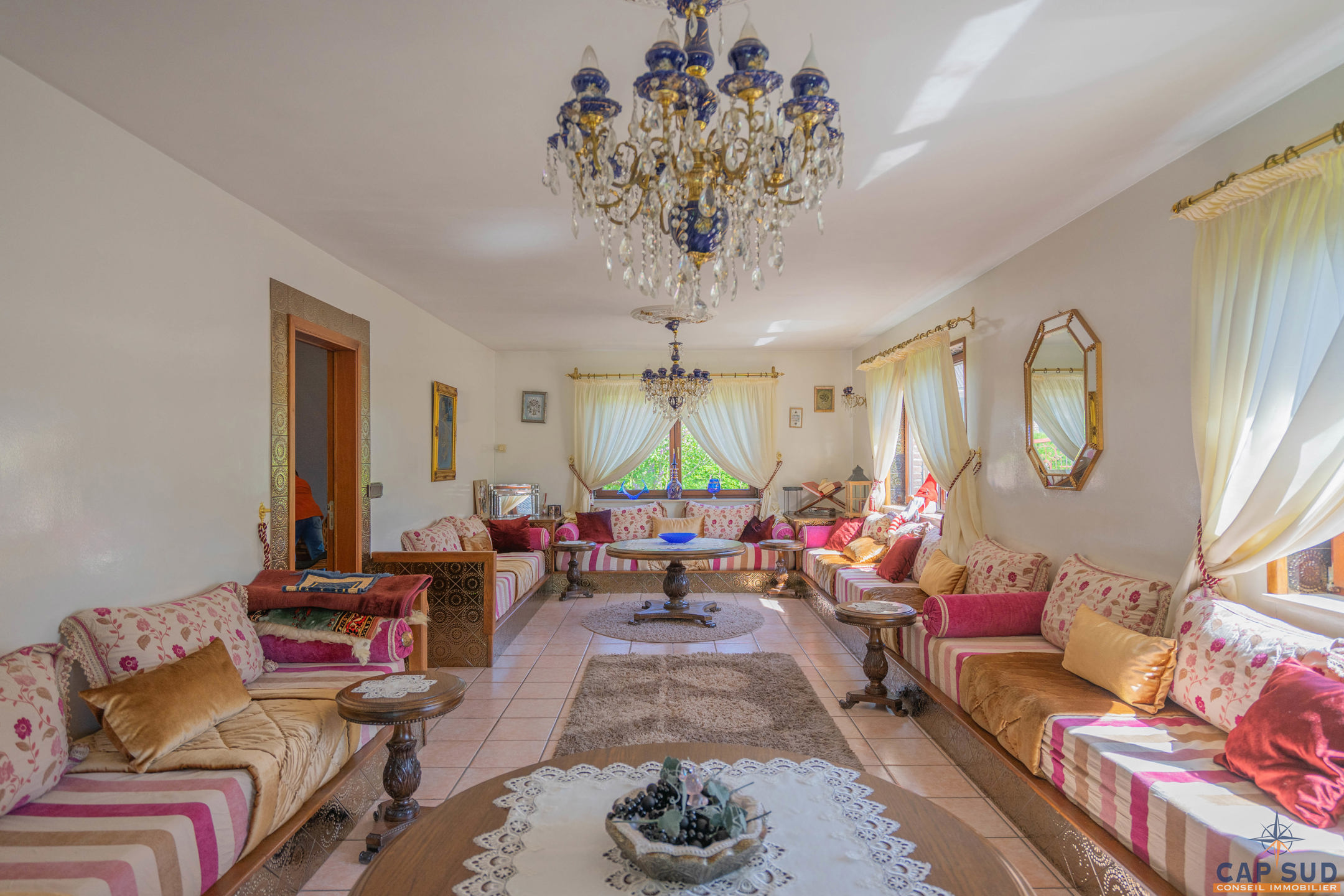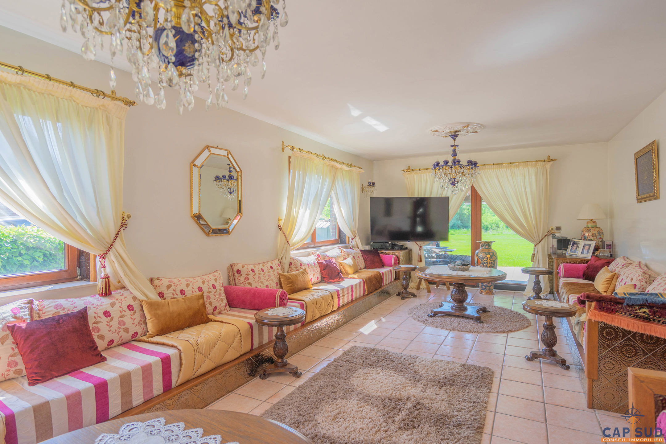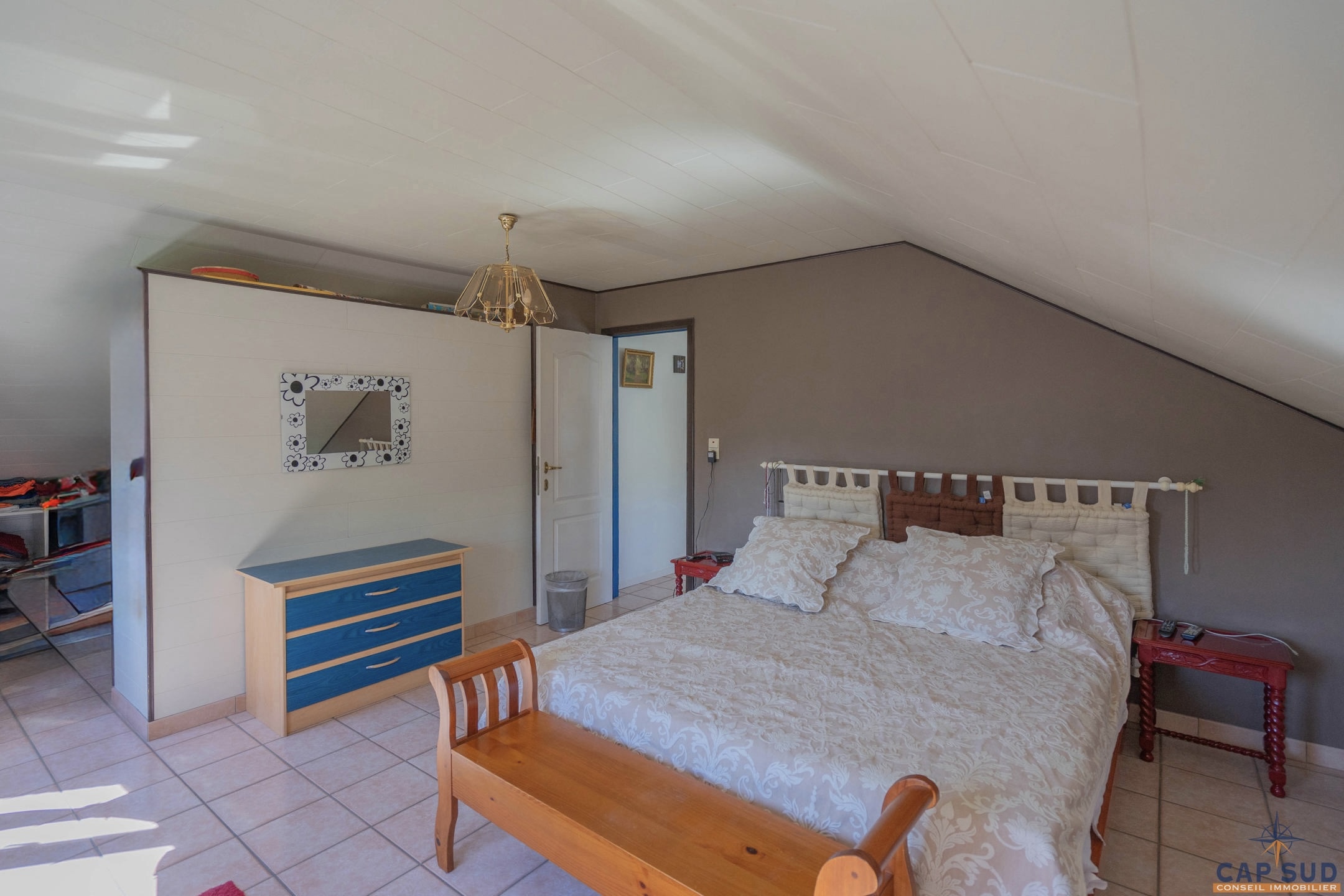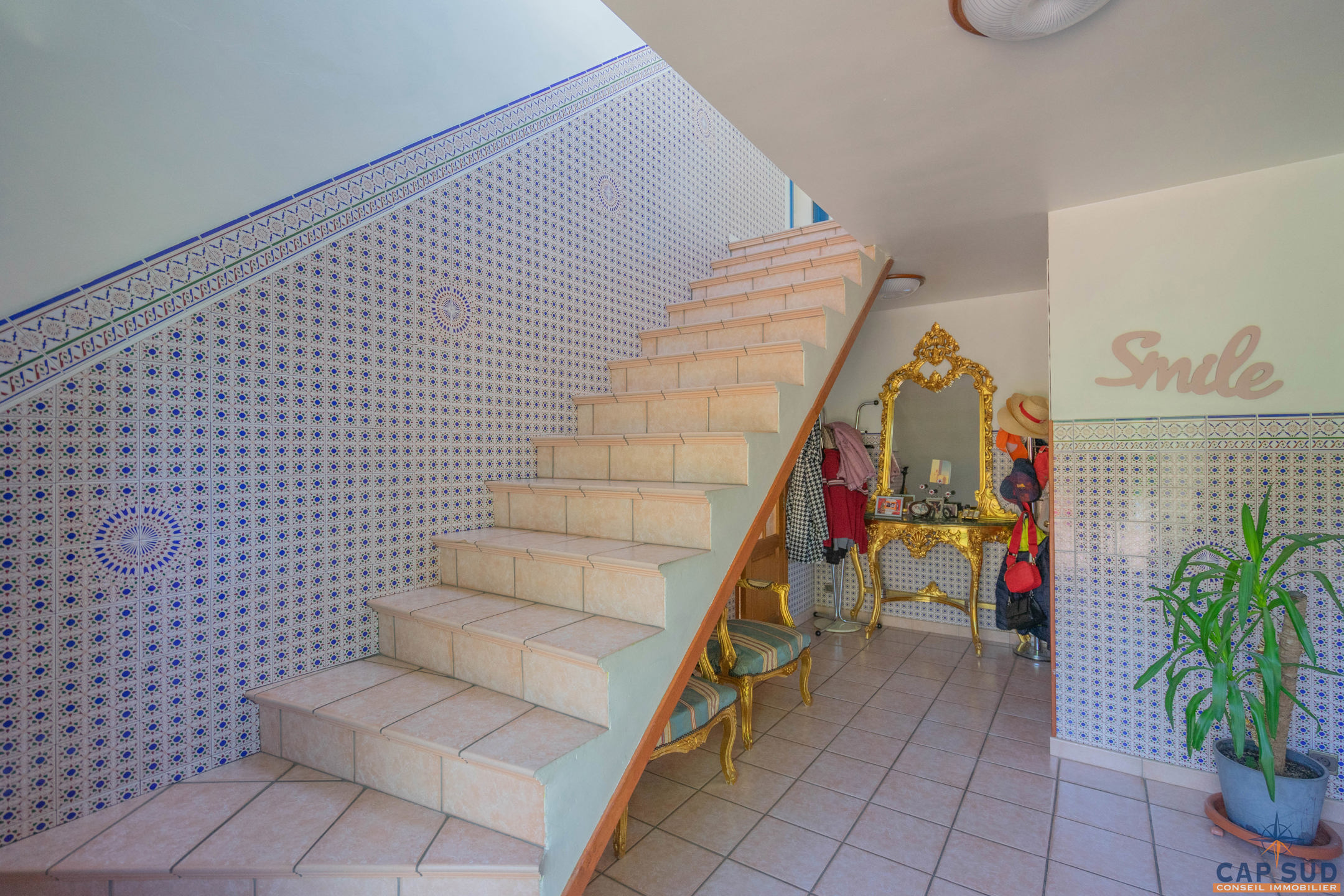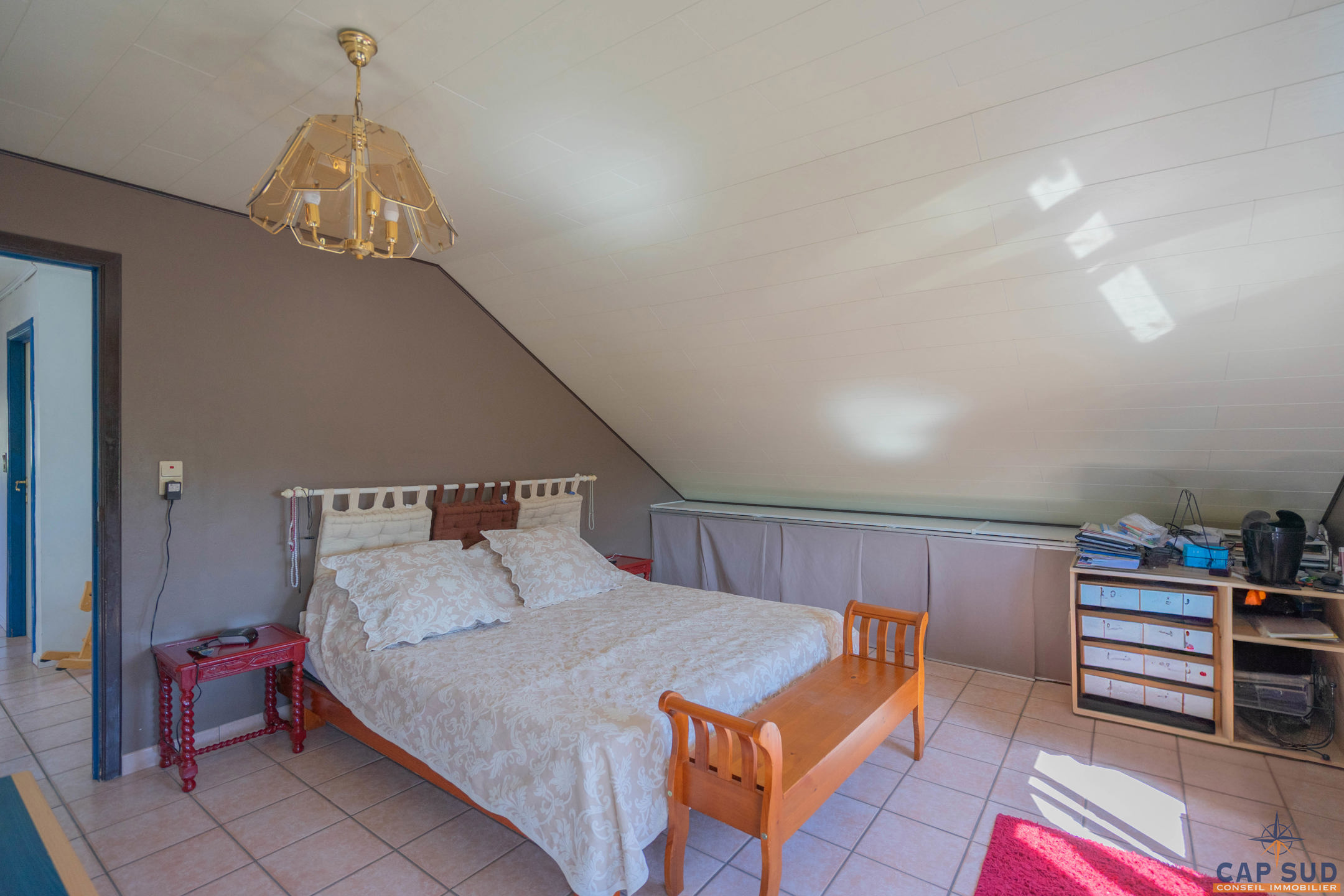 Dès l’entrée, vous serez accueilli par un grand hall équipé d’un WC séparé. Le rez-de-chaussée se compose d’un lumineux séjour avec salle à manger, d’une cuisine équipée conviviale, ainsi que d’un second salon actuellement aménagé en espace d’accueil. L’ensemble de ces pièces de vie donne accès à une vaste terrasse de 70 m² entièrement couverte, idéale pour profiter de l’extérieur en toute saison. Une salle de douche se trouve également au rez-de-chaussée, apportant un confort supplémentaire.