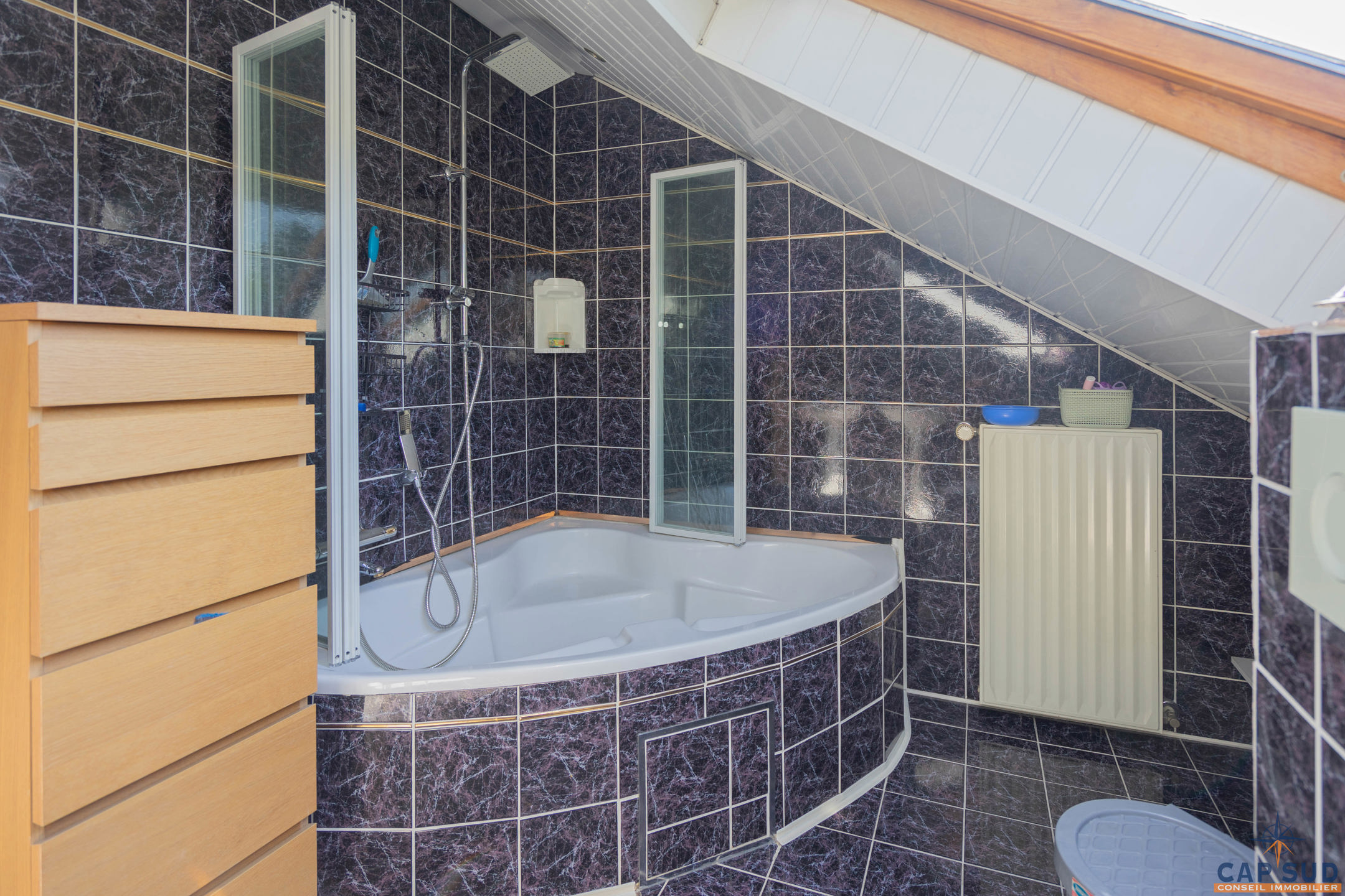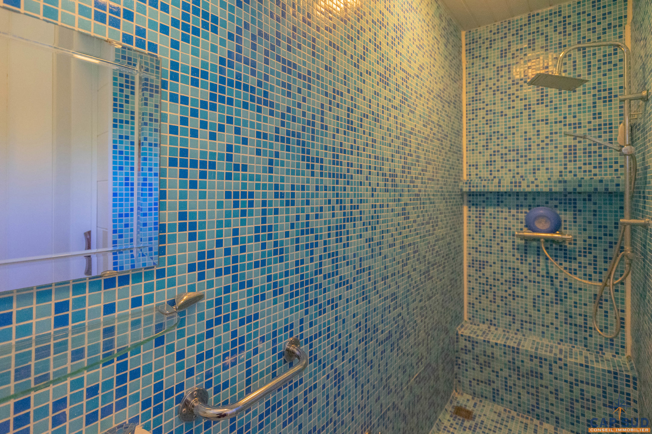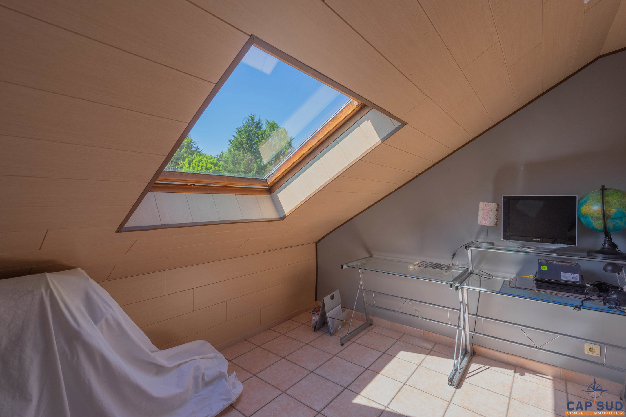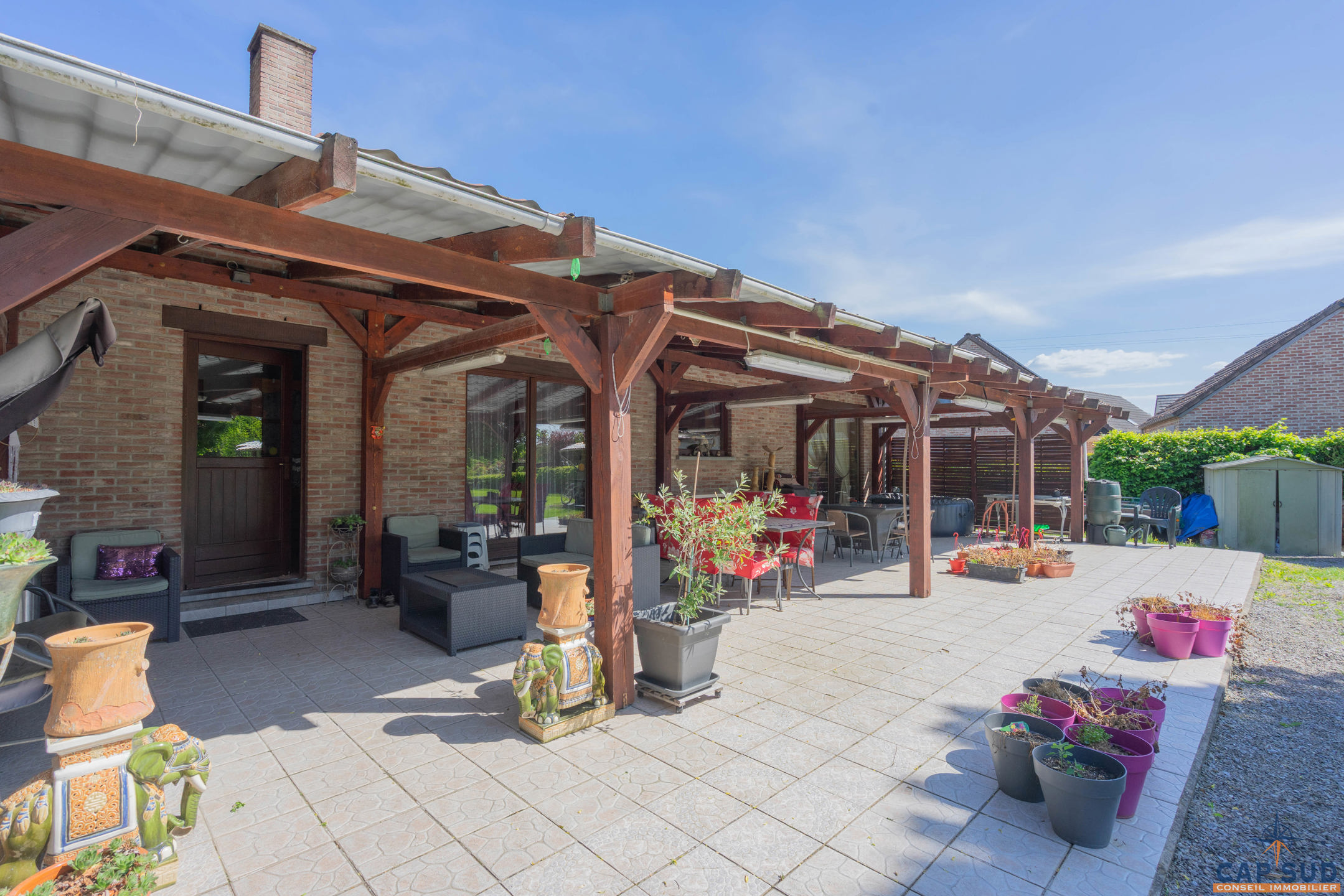 Dès l’entrée, vous serez accueilli par un grand hall équipé d’un WC séparé. Le rez-de-chaussée se compose d’un lumineux séjour avec salle à manger, d’une cuisine équipée conviviale, ainsi que d’un second salon actuellement aménagé en espace d’accueil. L’ensemble de ces pièces de vie donne accès à une vaste terrasse de 70 m² entièrement couverte, idéale pour profiter de l’extérieur en toute saison. Une salle de douche se trouve également au rez-de-chaussée, apportant un confort supplémentaire.
