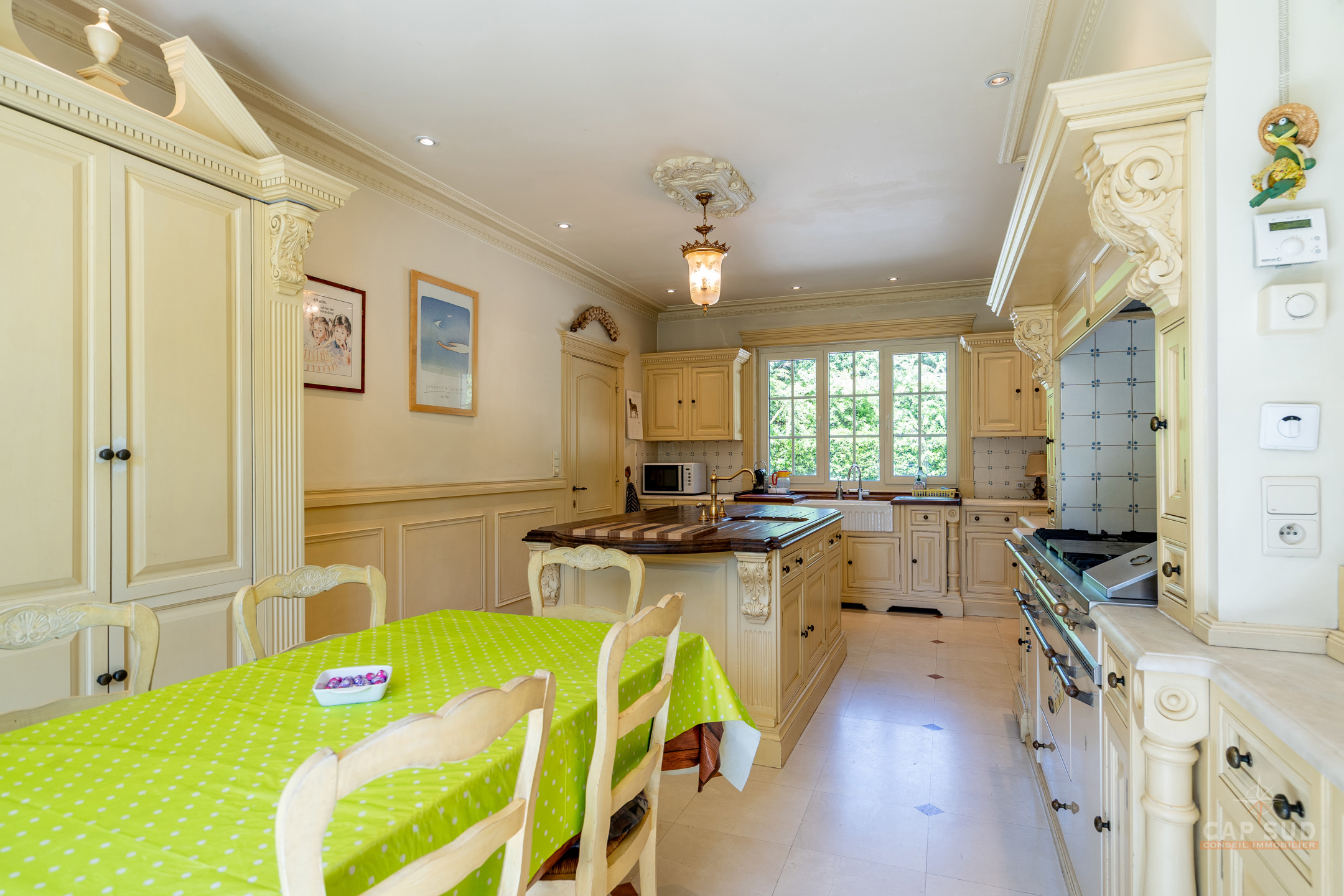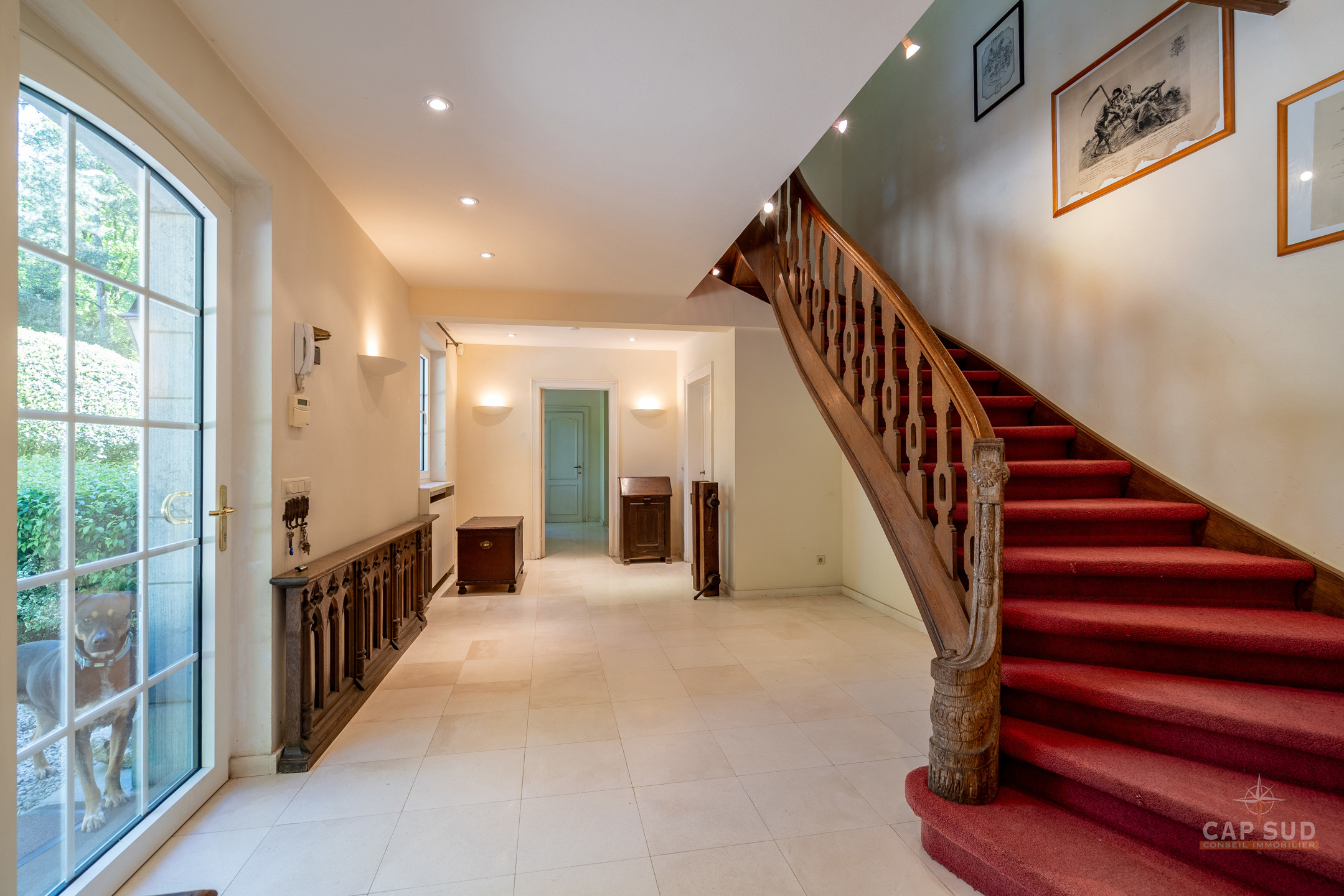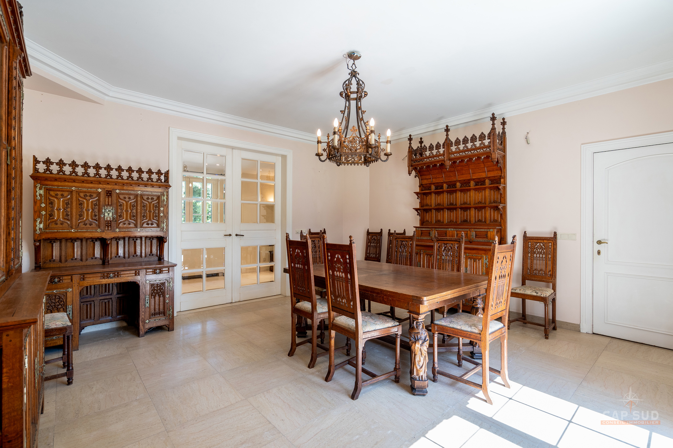 SOUS OPTION, Merci aux propriétaires pour leur confiance ! Quartier des Sept fontaines, magnifique propriété de 50a. La villa de 1961 de 595m2 bruts avec conciergerie vous séduira par ses volumes et sa luminosité, vous y trouverez un séjour, une cuisine avec coin à déjeuner, une salle à manger, une bibliothèque, 5 chambres, 4 salles de bains ou douches, dressing et placards, 6 WC, un grand garage, une buanderie, un grenier de 85m2 et des caves. Une grande terrasse Sud, un jardin arboré ainsi qu’une entrée carrossable la complètent. Les matériaux de qualité tels que le travertin, le marbre et le bois massif sont présents. Les châssis sont en doubles vitrages, le chauffage au gaz, citerne d’eau de pluie, ……