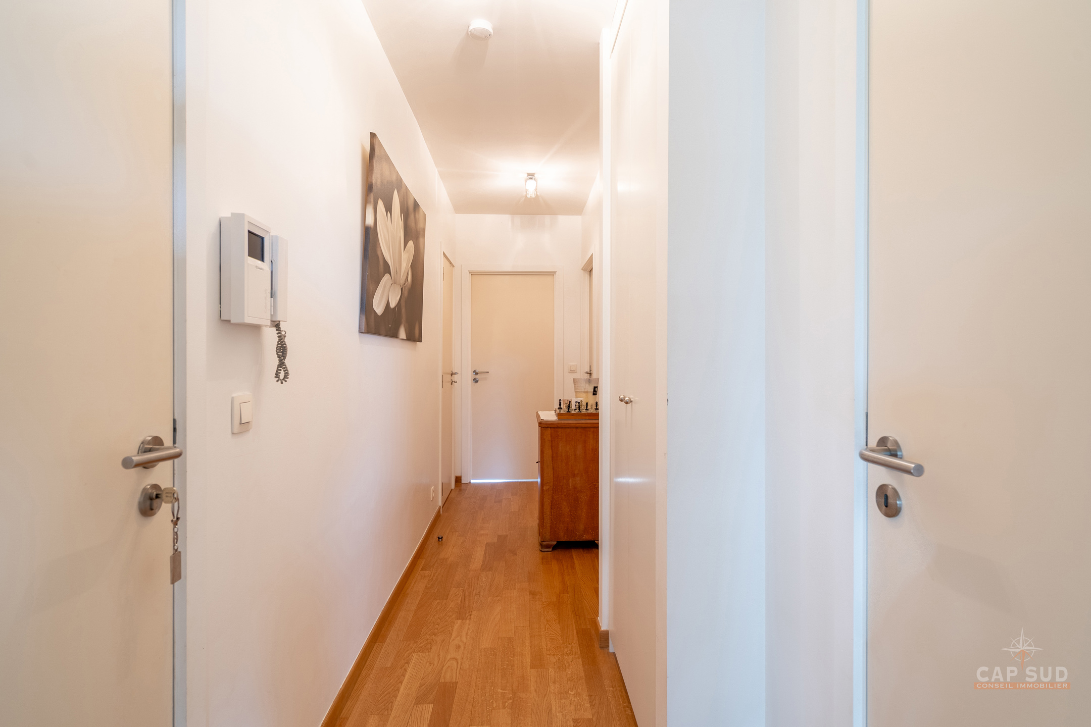Provisions/Charges mensuelles de 170,- euros pour les communs, pour le chauffage et l’eau chaude privative. Emplacement parking intérieur + cave. PEB B. 89kWh/m2.an.