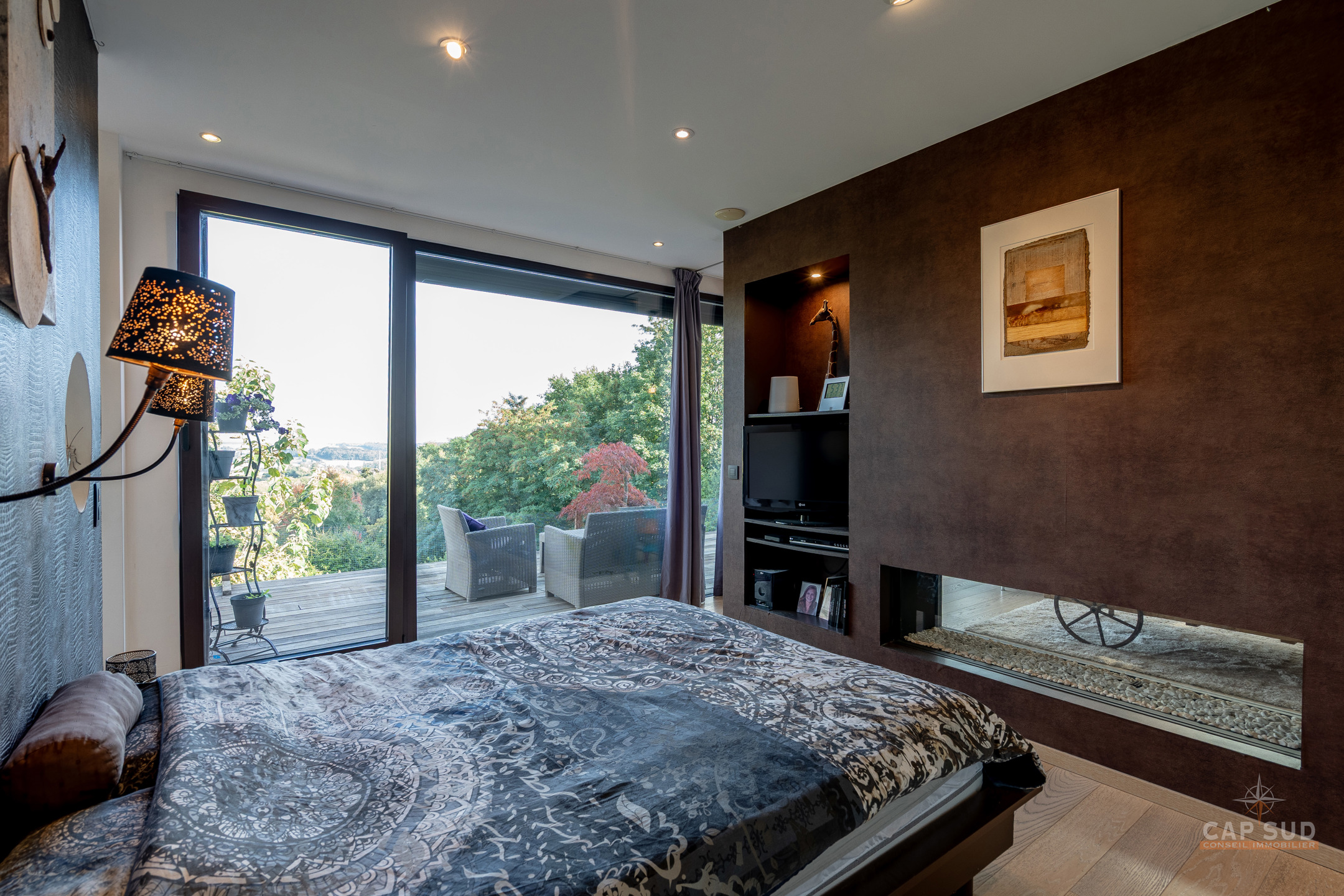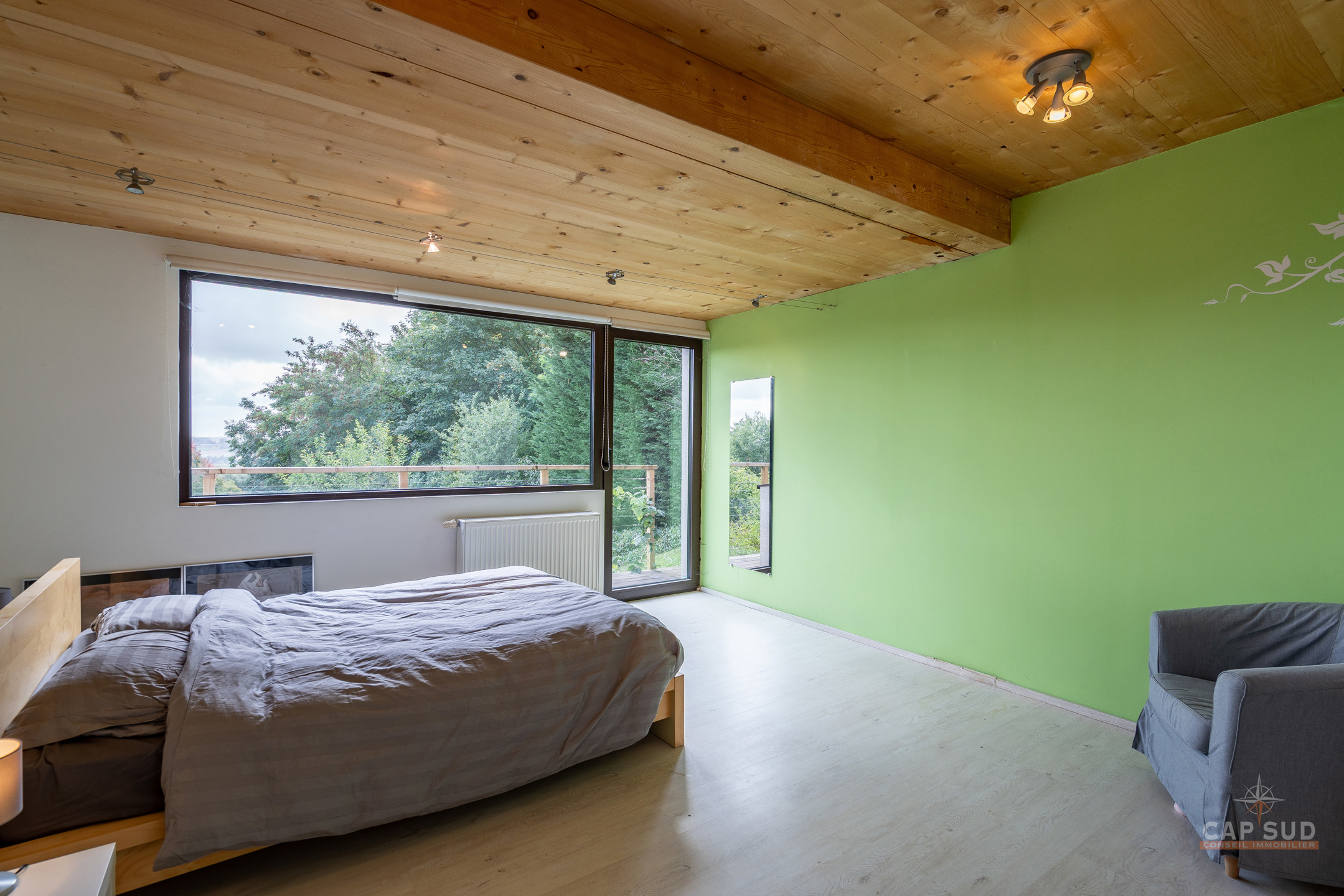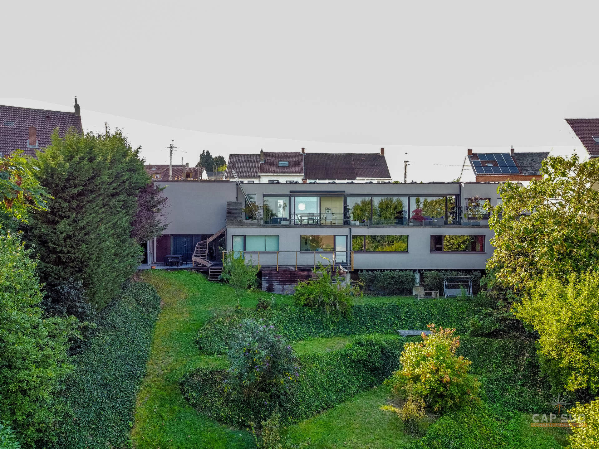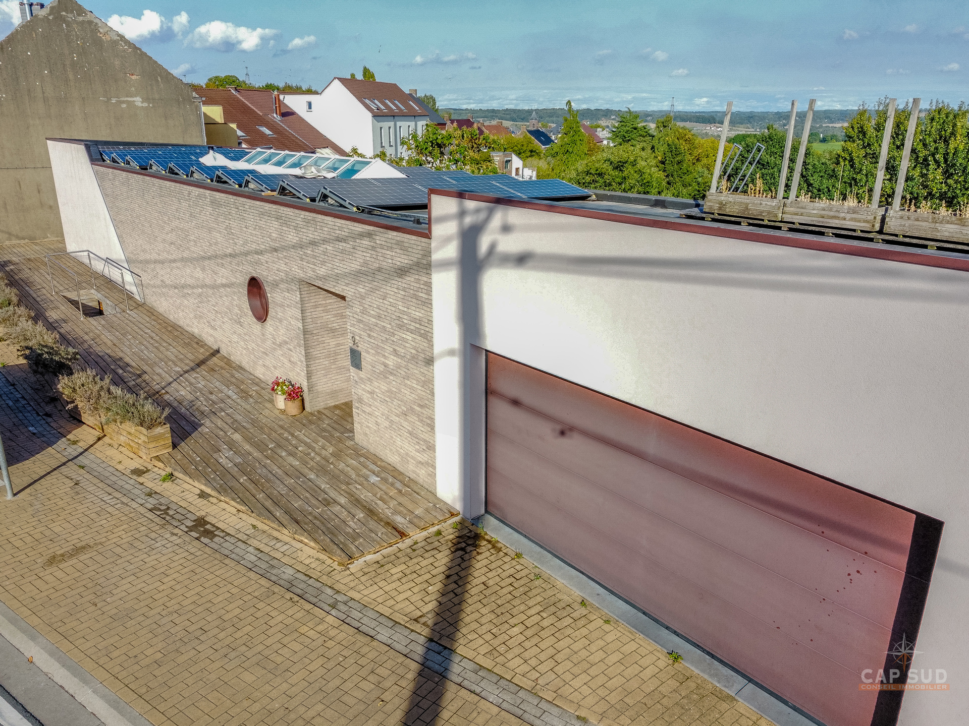 Dans la commune de Ittre, Cap Sud vous présente cette splendide villa d’architecte 4 façades bâtie en 2014 développant environ 445 m² bruts dont 365 m² habitables sur un terrain de 9 ares 50. Bâtie en bois massif et édifiée sur pilotis, elle séduit par son originalité, ses volumes baignés de lumière et sa façade arrière largement vitrée offrant une vue imprenable sur la campagne. Dès l’entrée, un hall avec espace vestiaire et WC séparé mène d’un côté vers le garage double et de l’autre vers un vaste espace de vie. Celui-ci se compose d’une cuisine ouverte avec coin repas et d’un salon convivial agrémenté d’un poêle à gaz, le tout prolongé par une terrasse donnant sur le jardin et la vallée. À ce même niveau se trouve une chambre parentale avec sa salle de bains complète comprenant baignoire, douche, sauna et WC séparé, véritable espace bien-être avec accès direct à l’extérieur où se trouve le jacuzzi.