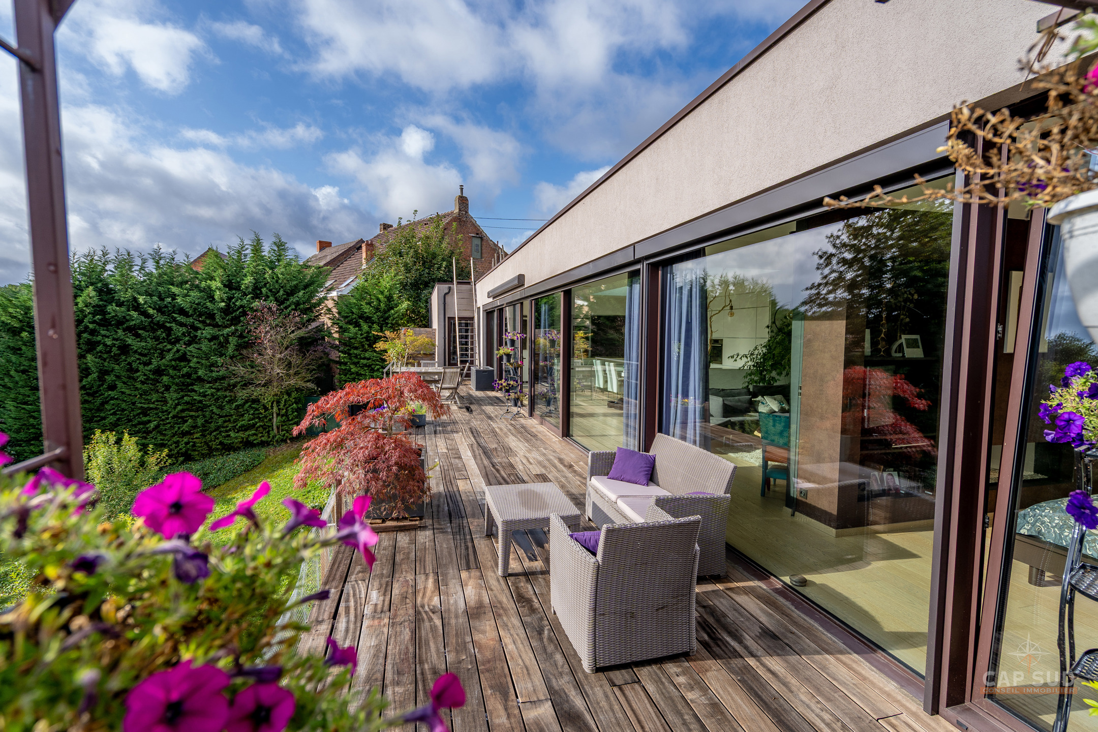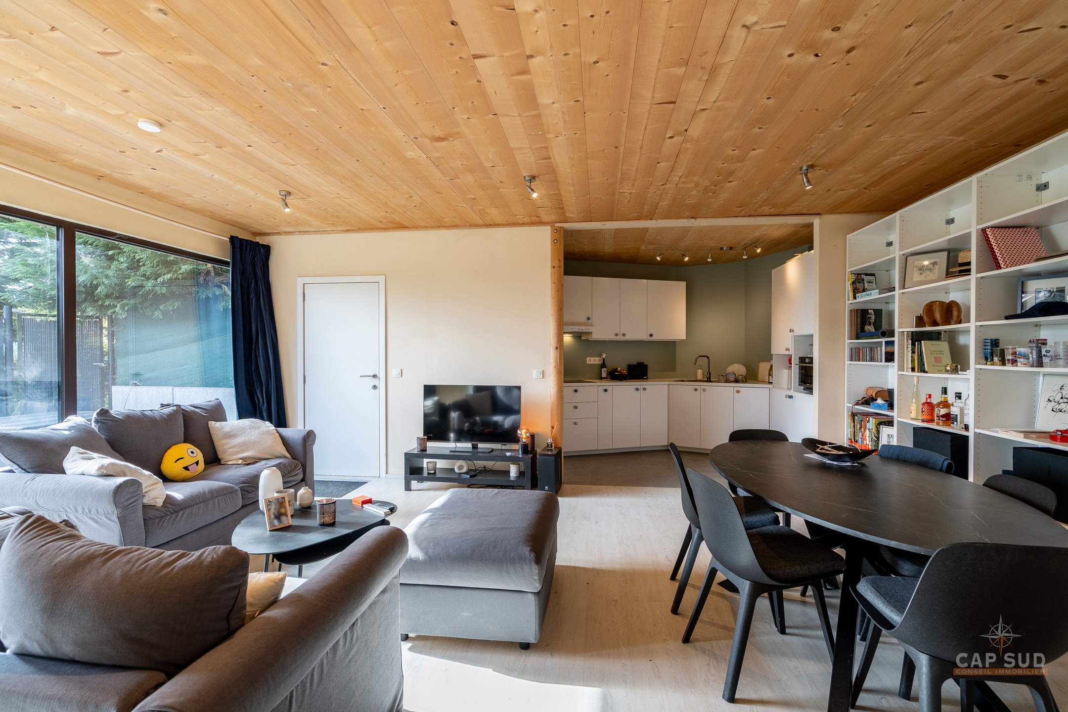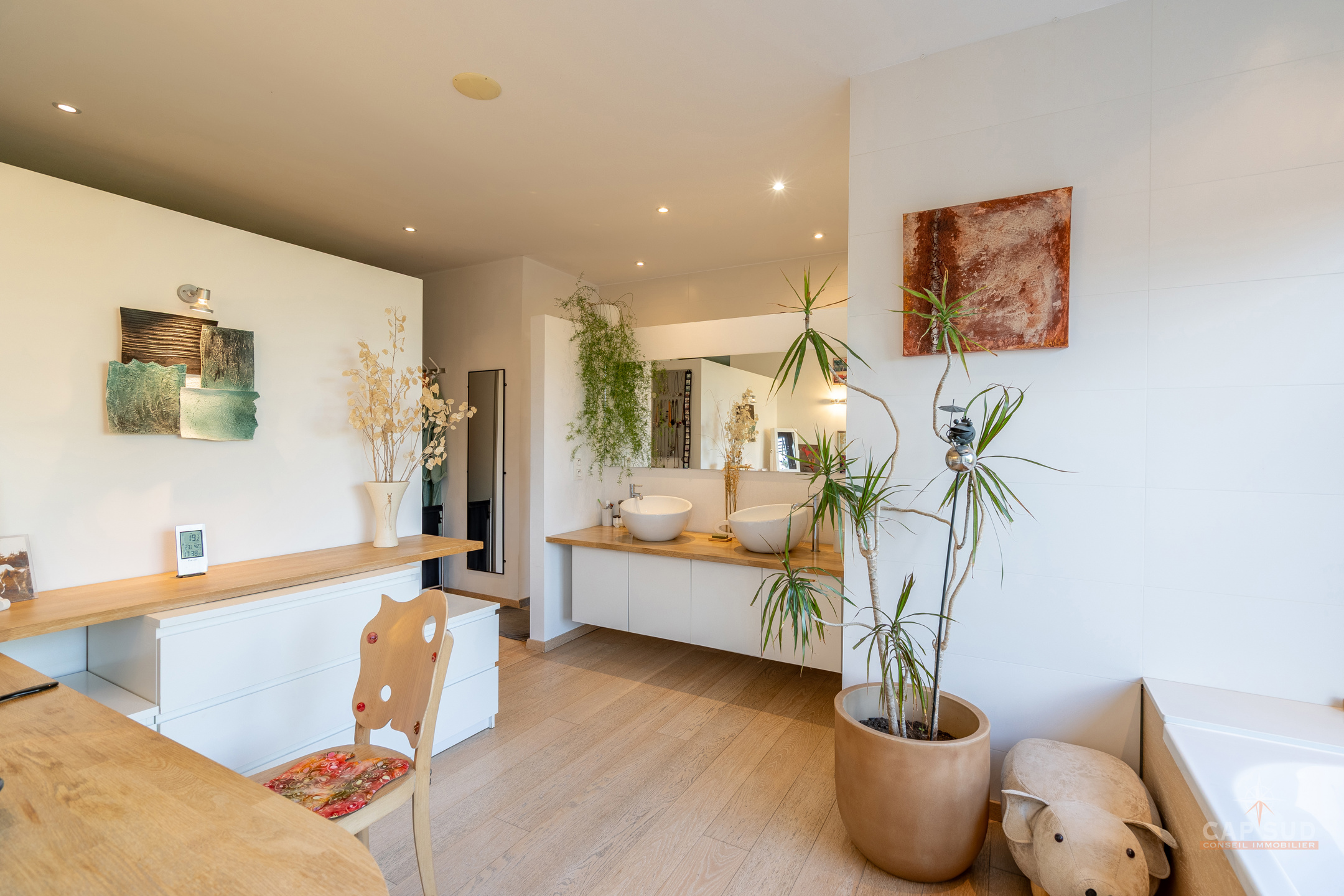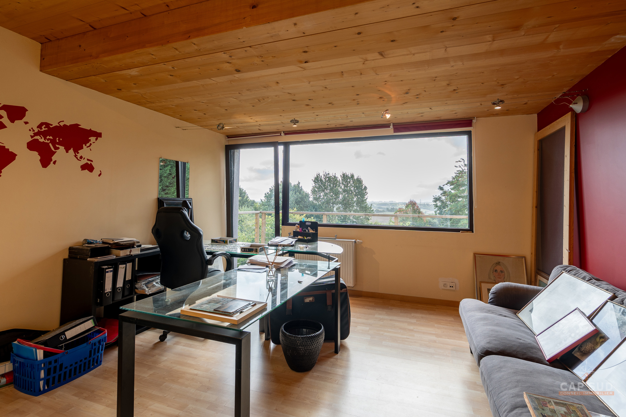 Dans la commune de Ittre, Cap Sud vous présente cette splendide villa d’architecte 4 façades bâtie en 2014 développant environ 445 m² bruts dont 365 m² habitables sur un terrain de 9 ares 50. Bâtie en bois massif et édifiée sur pilotis, elle séduit par son originalité, ses volumes baignés de lumière et sa façade arrière largement vitrée offrant une vue imprenable sur la campagne. Dès l’entrée, un hall avec espace vestiaire et WC séparé mène d’un côté vers le garage double et de l’autre vers un vaste espace de vie. Celui-ci se compose d’une cuisine ouverte avec coin repas et d’un salon convivial agrémenté d’un poêle à gaz, le tout prolongé par une terrasse donnant sur le jardin et la vallée. À ce même niveau se trouve une chambre parentale avec sa salle de bains complète comprenant baignoire, douche, sauna et WC séparé, véritable espace bien-être avec accès direct à l’extérieur où se trouve le jacuzzi.