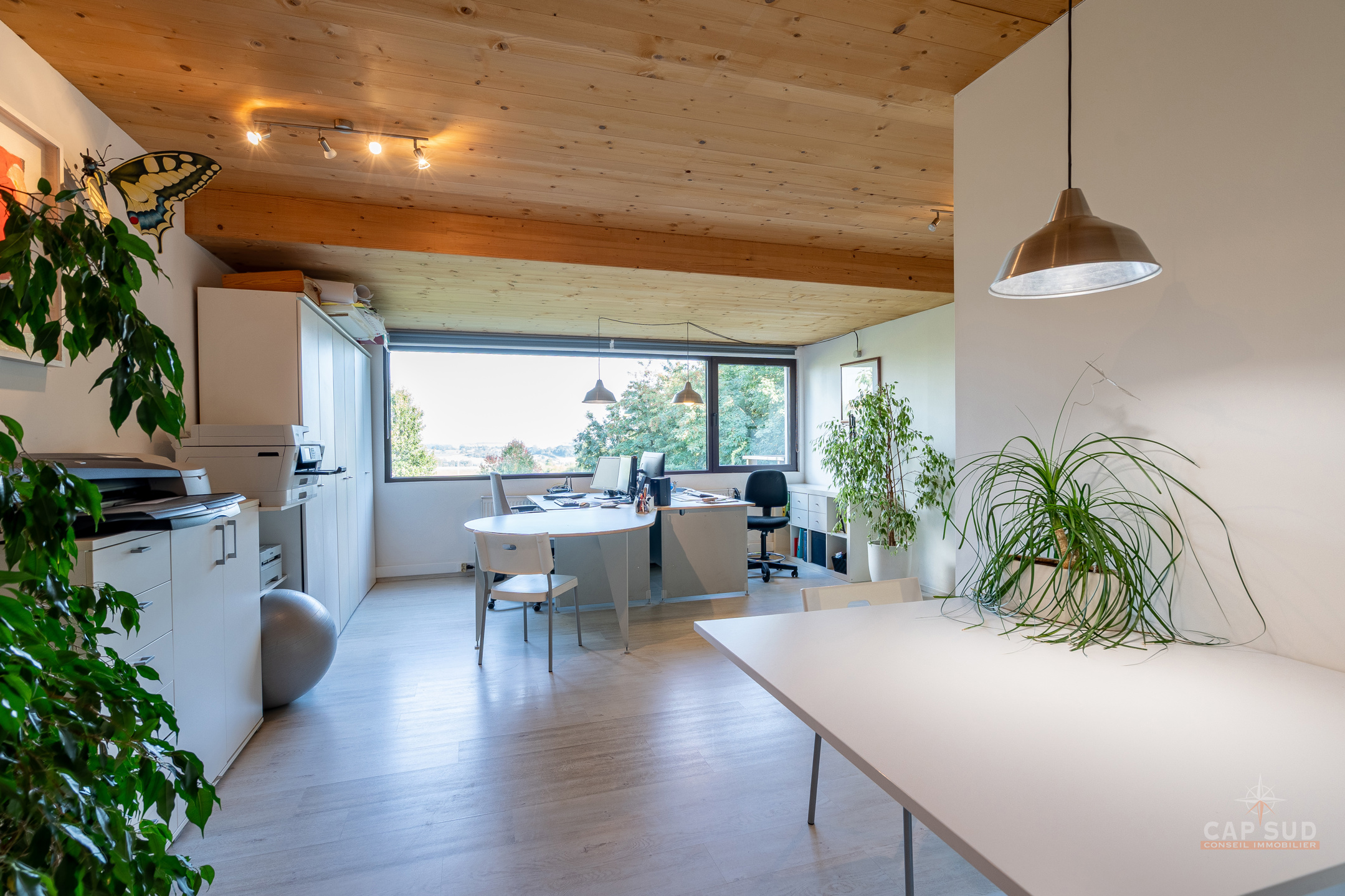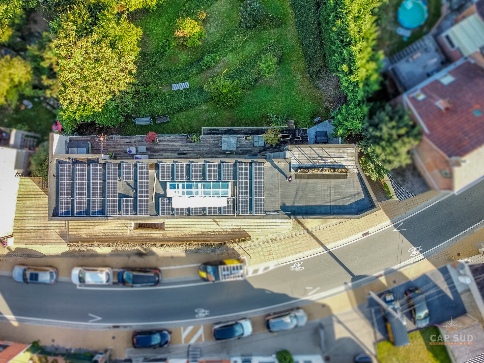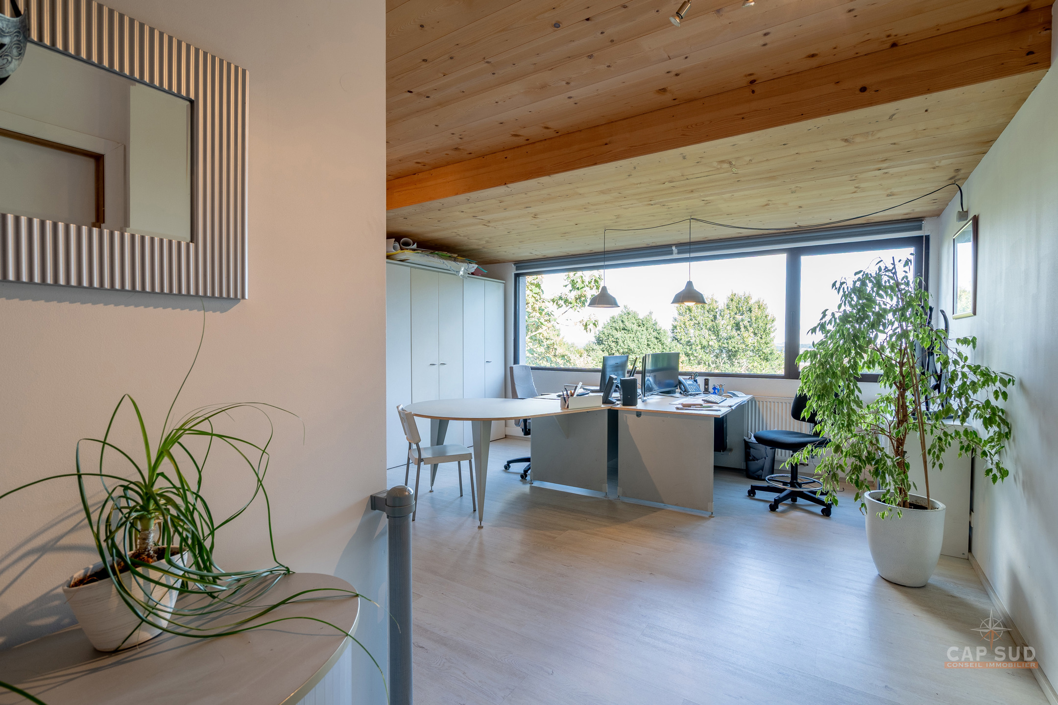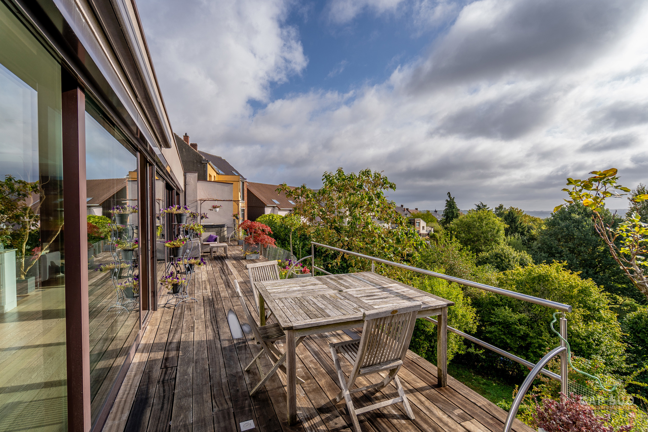 Au niveau inférieur, un appartement indépendant entièrement équipé comprenant un séjour avec salon et salle à manger, une cuisine, deux chambres, une salle de bains avec baignoire et douche ainsi qu’une terrasse privative, actuellement loué 1 180 euros par mois. On y trouve également un espace professionnel composé d’un open space et d’un bureau séparé, une buanderie, une chaufferie et un WC, le tout bénéficiant d’accès indépendants. La propriété offre 104 m² de terrasses dont un toit-terrasse dominant la vallée et un jardin en pentes aménagées en paliers successifs qui rappellent des rizières, créant un cadre paysager unique. Triple vitrage aluminium, chaudière au gaz, domotique, alarme, électricité conforme, 30 panneaux photovoltaïques, PEB A. Une demeure rare qui allie confort moderne, prestations haut de gamme et polyvalence unique. Pour toute information, contactez Nathan Mardaga au 02 387 42 42.