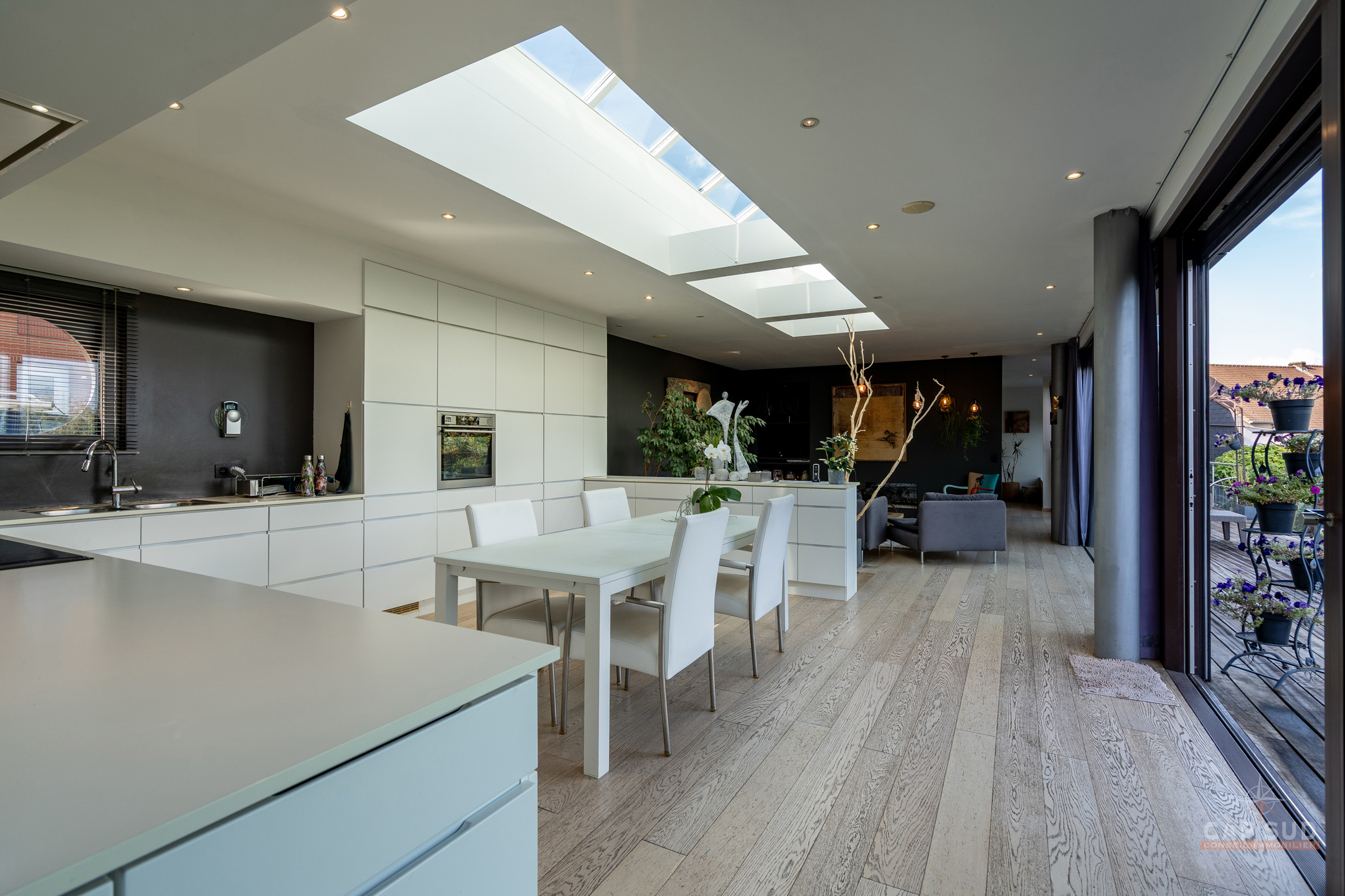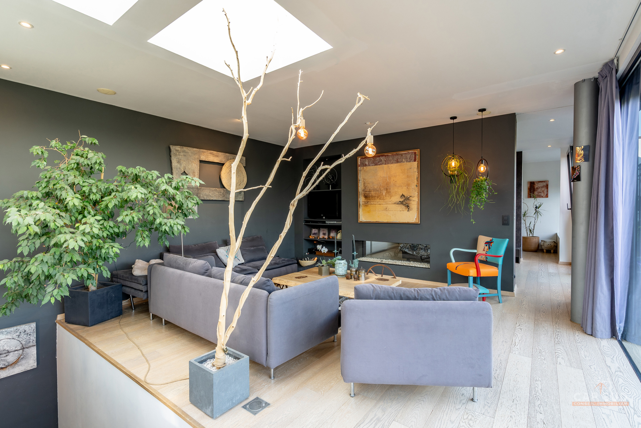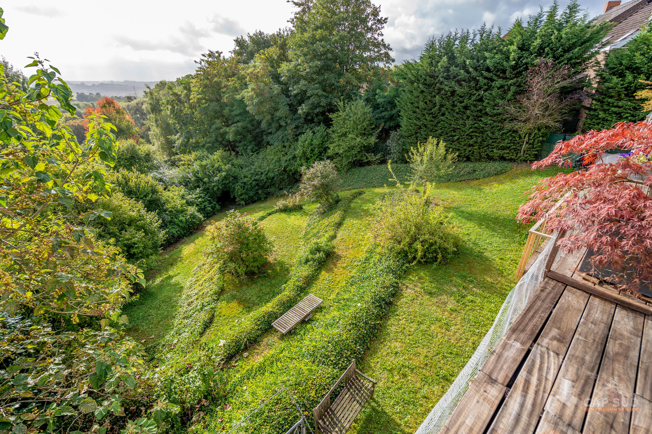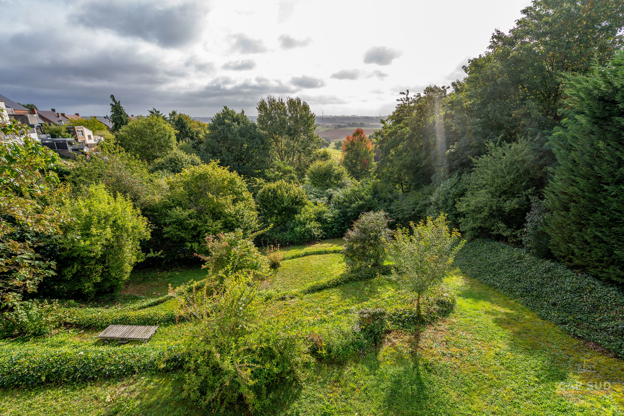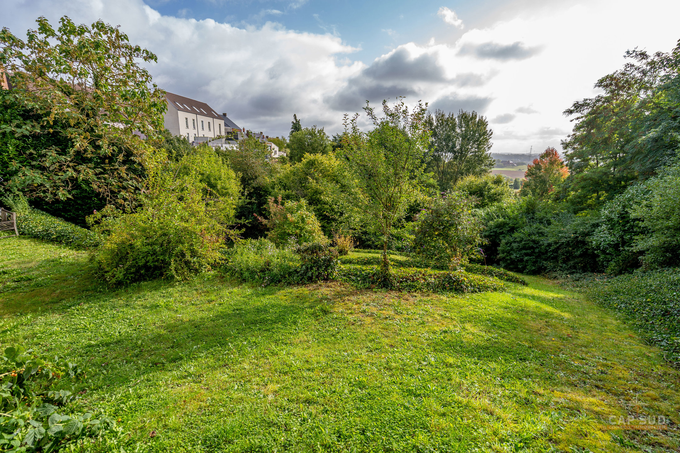 Au niveau inférieur, un appartement indépendant entièrement équipé comprenant un séjour avec salon et salle à manger, une cuisine, deux chambres, une salle de bains avec baignoire et douche ainsi qu’une terrasse privative, actuellement loué 1 180 euros par mois. On y trouve également un espace professionnel composé d’un open space et d’un bureau séparé, une buanderie, une chaufferie et un WC, le tout bénéficiant d’accès indépendants. La propriété offre 104 m² de terrasses dont un toit-terrasse dominant la vallée et un jardin en pentes aménagées en paliers successifs qui rappellent des rizières, créant un cadre paysager unique. Triple vitrage aluminium, chaudière au gaz, domotique, alarme, électricité conforme, 30 panneaux photovoltaïques, PEB A. Une demeure rare qui allie confort moderne, prestations haut de gamme et polyvalence unique. Pour toute information, contactez Nathan Mardaga au 02 387 42 42.