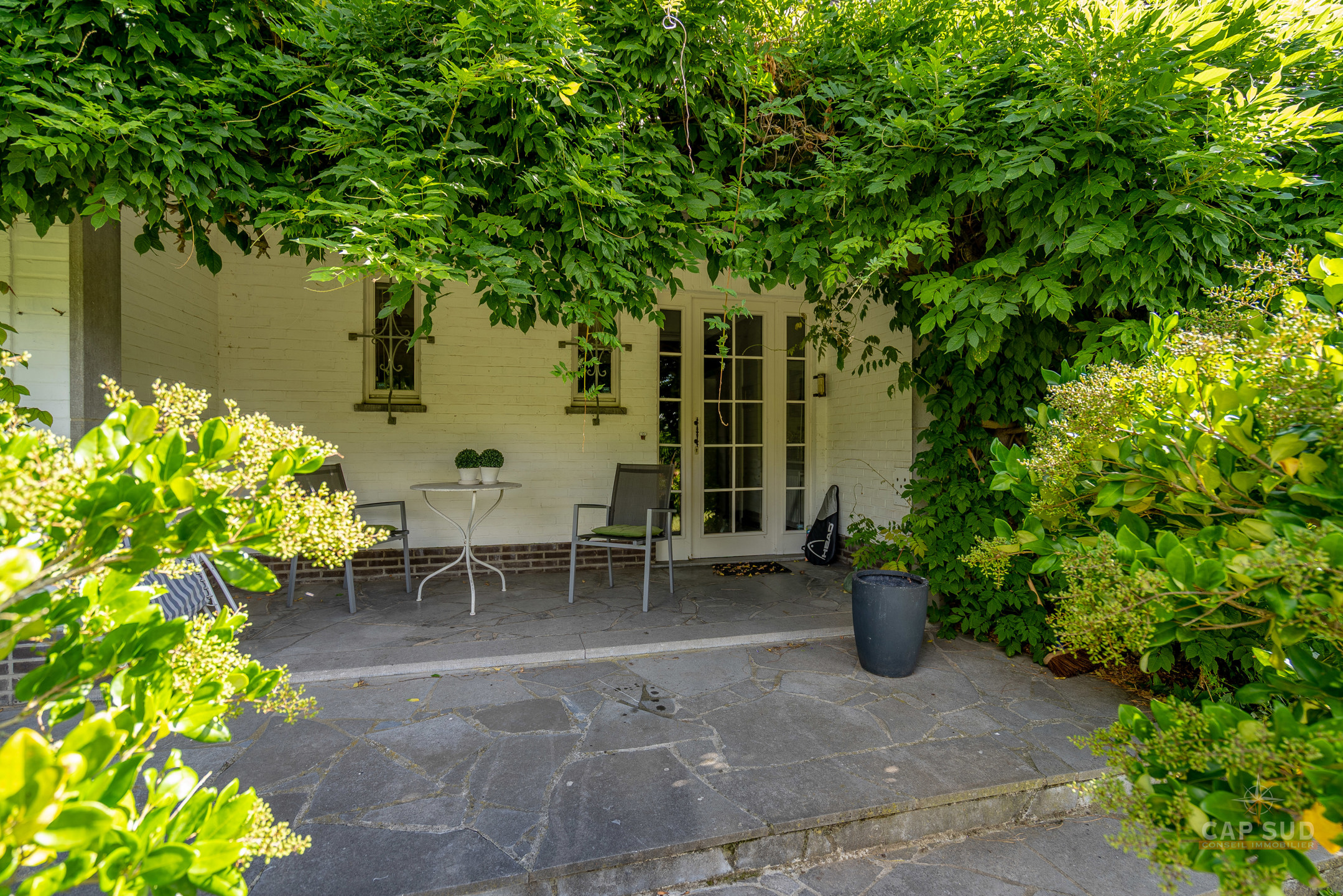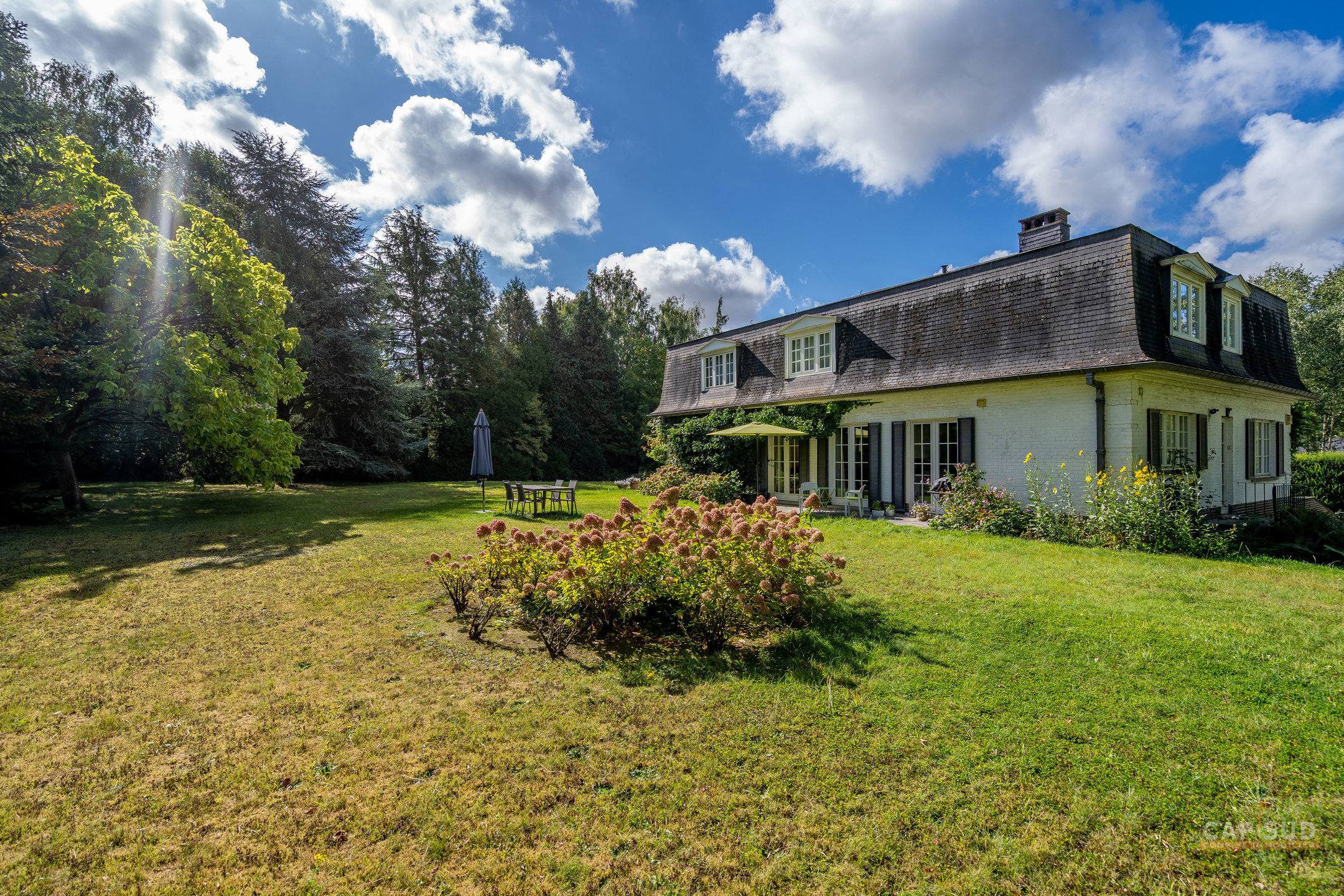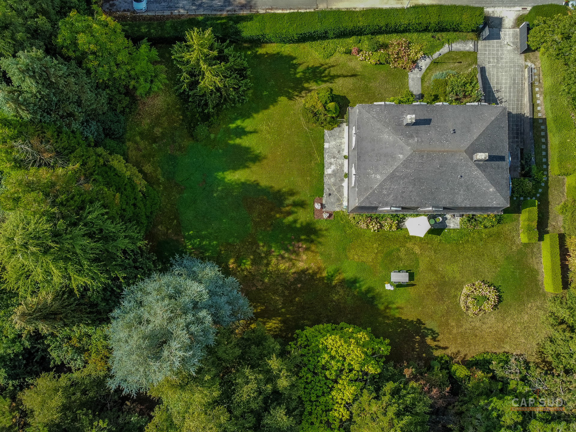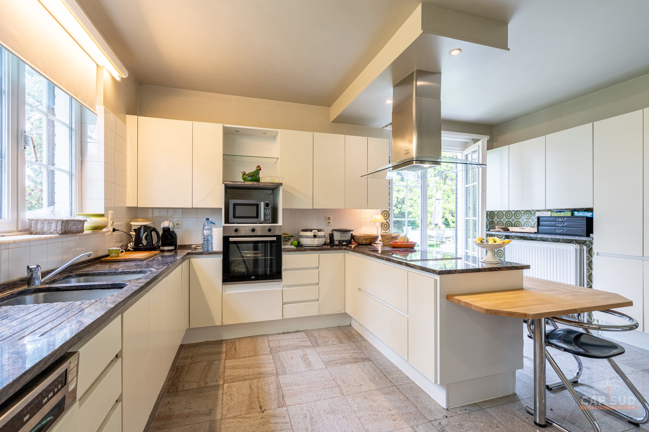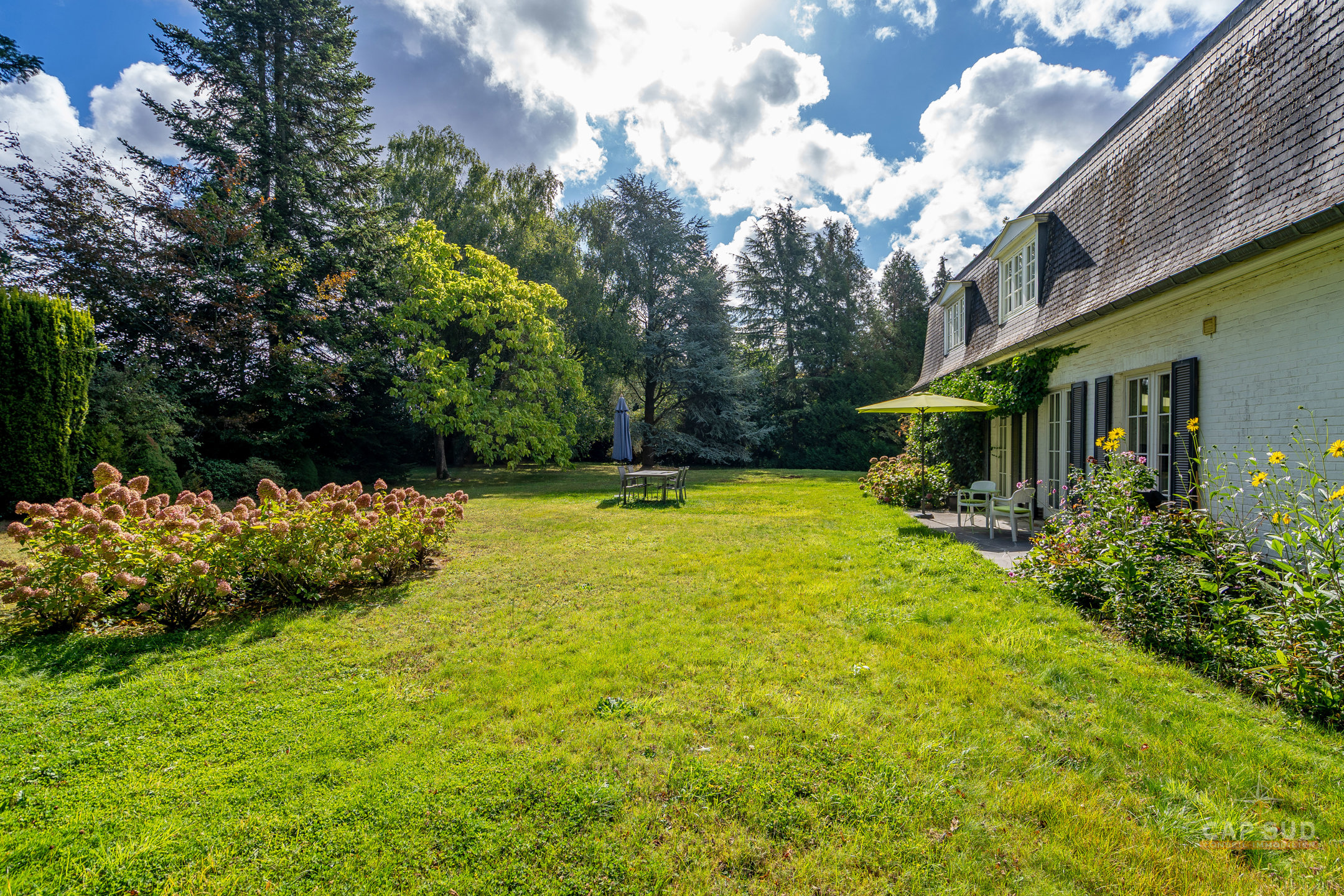Dans un clos résidentiel calme et arboré, CAP SUD vous propose cette ravissante propriété de 500m2 (dont 300m2 habitables) sise sur un splendide terrain de 30ares à l’abris des regards. Au rez-de-chaussée, vous trouverez un vaste hall d’entrée de 18m2, un lumineux living en L de 70m2 avec FO et plancher massif au sol, une cuisine équipée de 21m2 donnant sur le jardin et un bureau de 22m2. Au 1er étage, le hall de nuit dessert 2 grandes chambres de 17 et 25m2, une salle de douche et une chambre parentale de 32m2 comprenant la chambre, son dressing et sa salle de bains. Sur le même étage, il y a également un appartement de service (avec entrée séparée, accessible de l’extérieur par un escalier) comprenant un living de 21m2 et sa kitchenette (pouvant servir de chambre supplémentaire) et une chambre de 20m2 avec sa propre salle de bains. Grenier de rangement accessible via une trappe. Au sous-sol, la villa est entièrement sous caves et garage pour une superficie de 150m2 – possibilité de garer 4 voitures de belles tailles. Terrasse de 40m2 donnant sur un cadre verdoyant agrémenté d’arbres fruitiers et de multiples essences. Marbre, plancher massif, placards, adoucisseur, portes de garage automatiques, système d’alarme, portail, luminaires extérieurs…Très bonne isolation : PEB C – 217 kWh/an.m2. Vous serez séduits par ses volumes, la qualité des matériaux et la quiétude des lieux à deux pas de Bruxelles. Venez la découvrir !