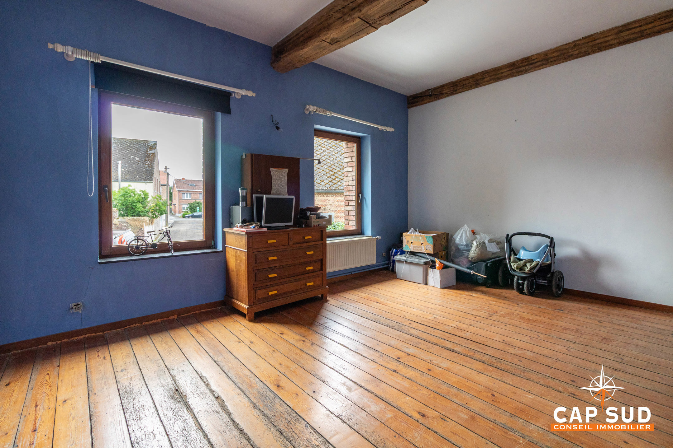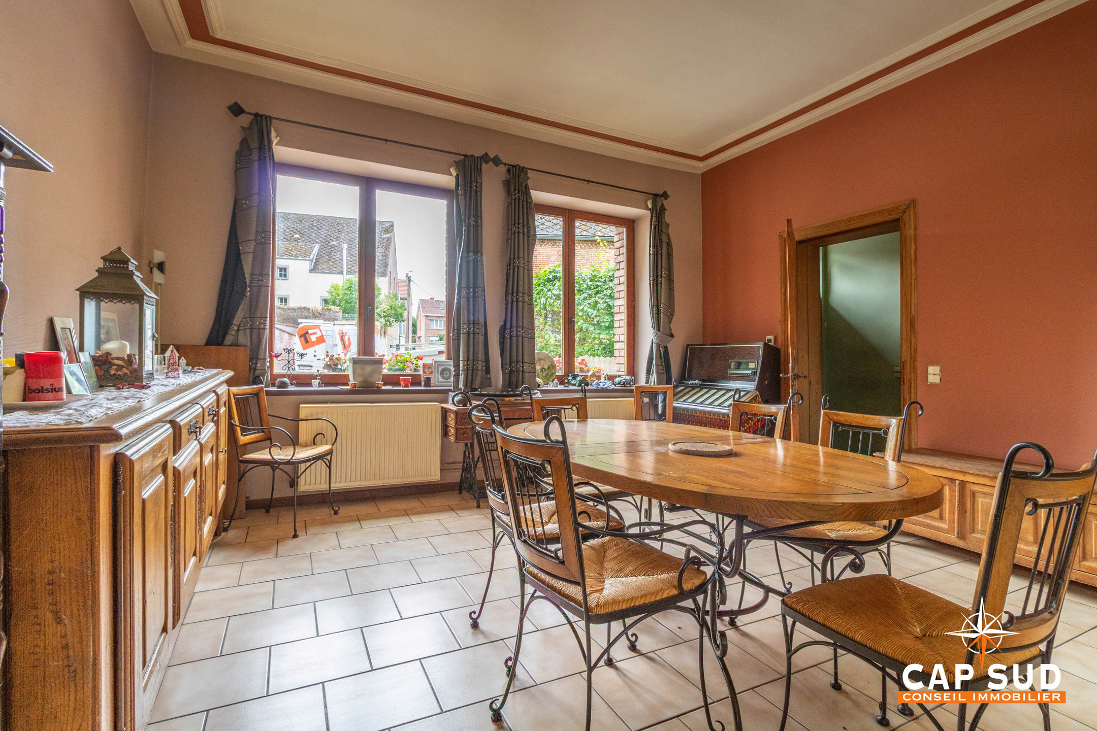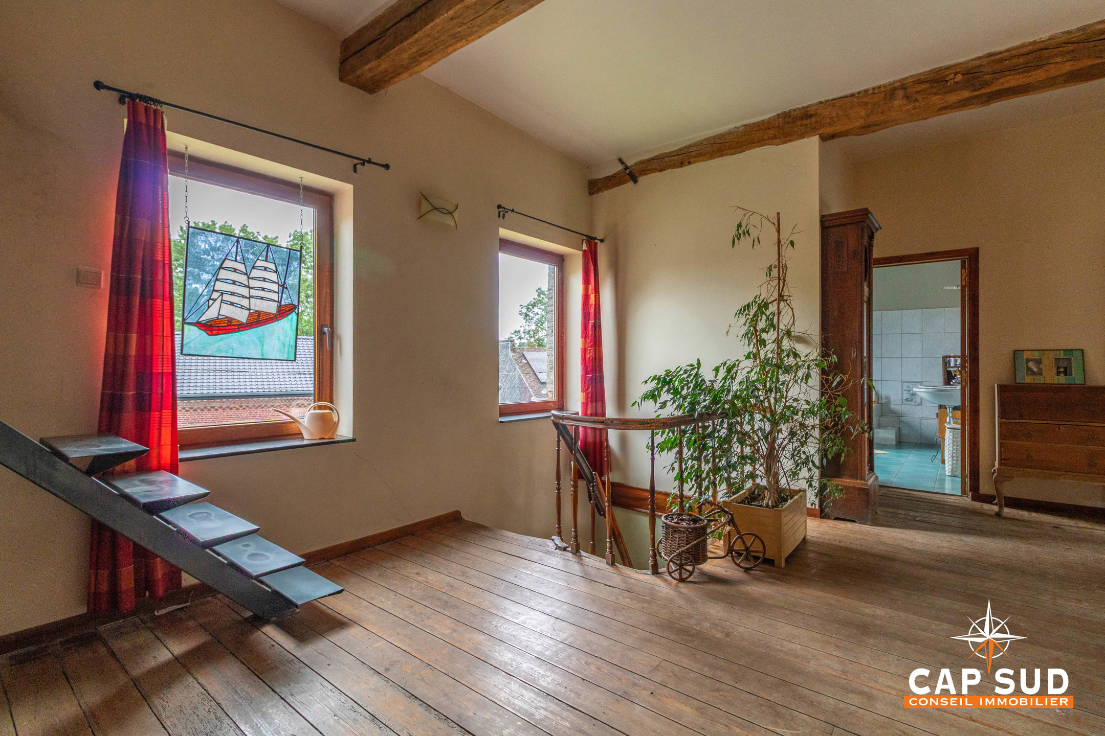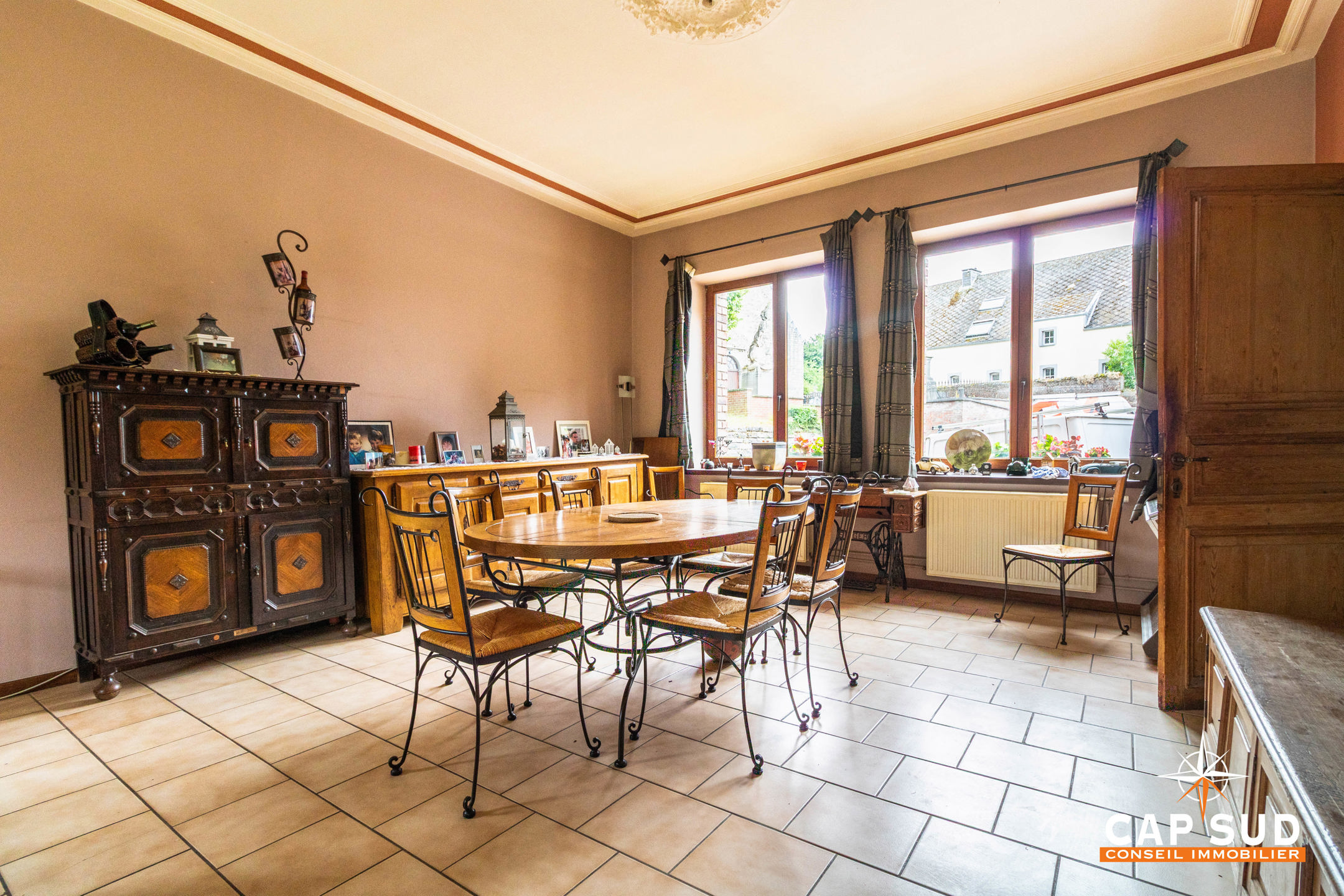 Avec une surface habitable d’environ 230 m², elle offre un cadre de vie chaleureux et un très beau potentiel d’aménagement. Le rez-de-chaussée comprend un séjour lumineux, une cuisine équipée et une toilette séparée. À l’étage, vous trouverez deux grandes chambres, une salle de bains ainsi qu’une buanderie. Le grenier aménagé accueille deux vastes pièces polyvalentes, idéales comme bureaux, chambres ou espace loisirs. La maison dispose également de caves voûtées, saines. Côté confort, on note la présence d’une chaudière à condensation et de châssis double vitrage.