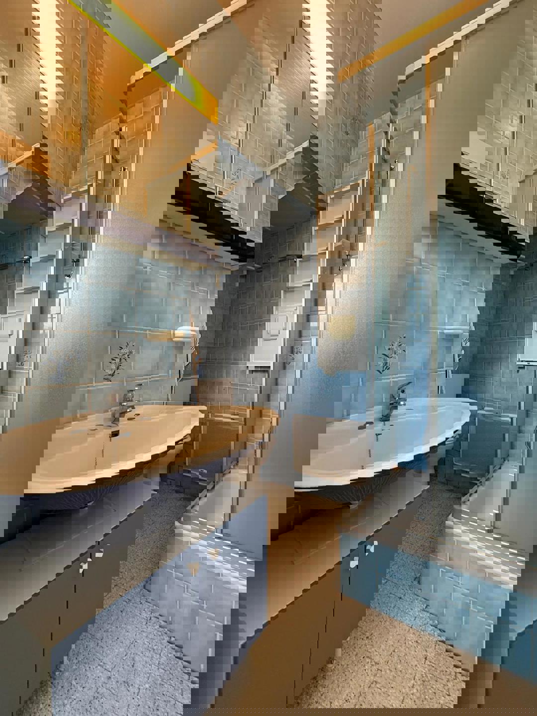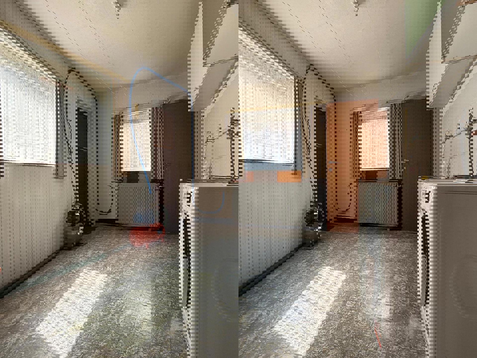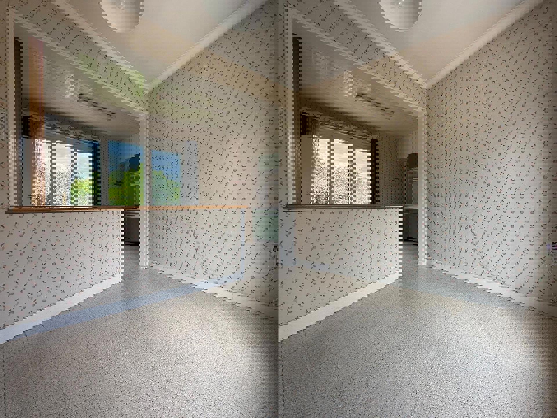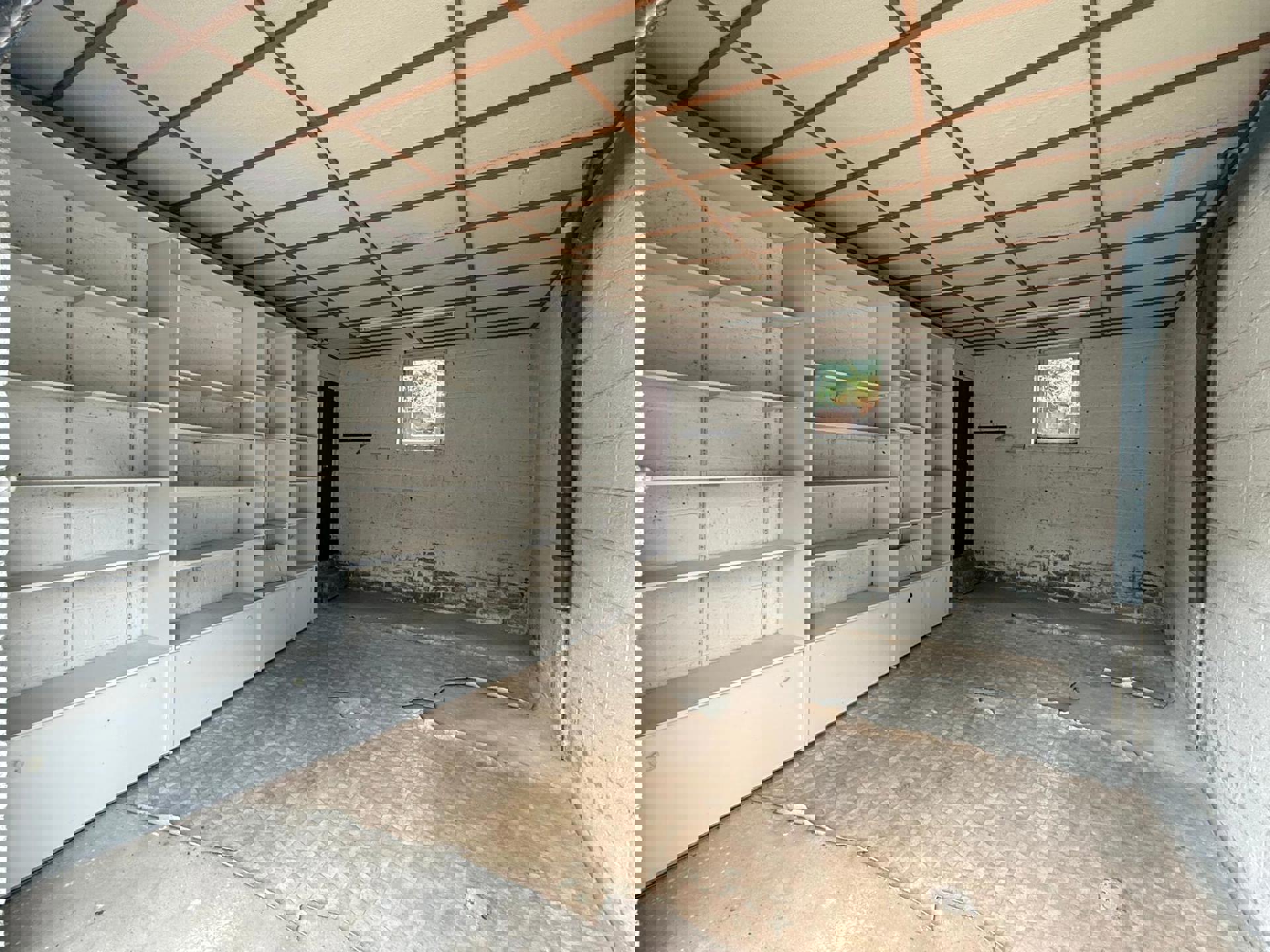 La maison est composée au rez d’un hall d’entrée avec wc, de 3 garages accessibles de l’intérieur, d’une chaufferie et de l’accès à la cour extérieure. Au 1er: un séjour avec feu ouvert, une cuisine avec coin à manger, une chambre et une la salle de douche avec wc.