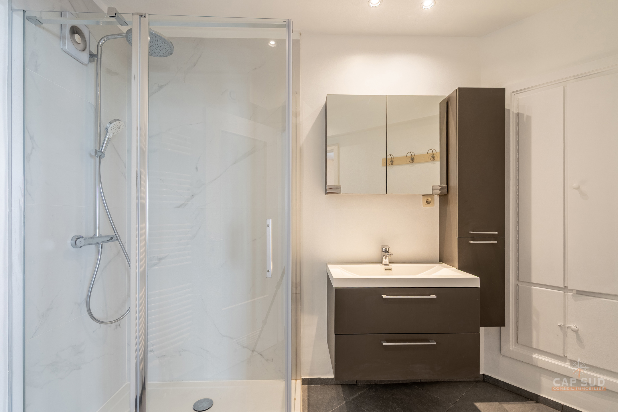 CAP SUD vous présente ce charmant appartement une chambre, entièrement rénové et dans un état impeccable. Situé au premier étage d’un immeuble bien entretenu, il développe une superficie de 65 m². Dès l’entrée, un hall avec espace vestiaire mène à une toilette séparée, une salle de douche et une buanderie. La pièce de vie propose un séjour lumineux avec cuisine ouverte équipée. L’espace nuit comprend une chambre confortable et fonctionnelle. En supplément obligatoire, un emplacement de parking et un garage fermé sont proposés au prix de 35.000 €. Électricité conforme, charges mensuelles 140 € pour les communs. Idéalement situé, cet appartement bénéficie d’un accès rapide aux grands axes et autoroutes, d’une excellente desserte en transports en commun ainsi que de la proximité immédiate de nombreux commerces et services. Un cadre pratique et recherché qui allie confort et mobilité.