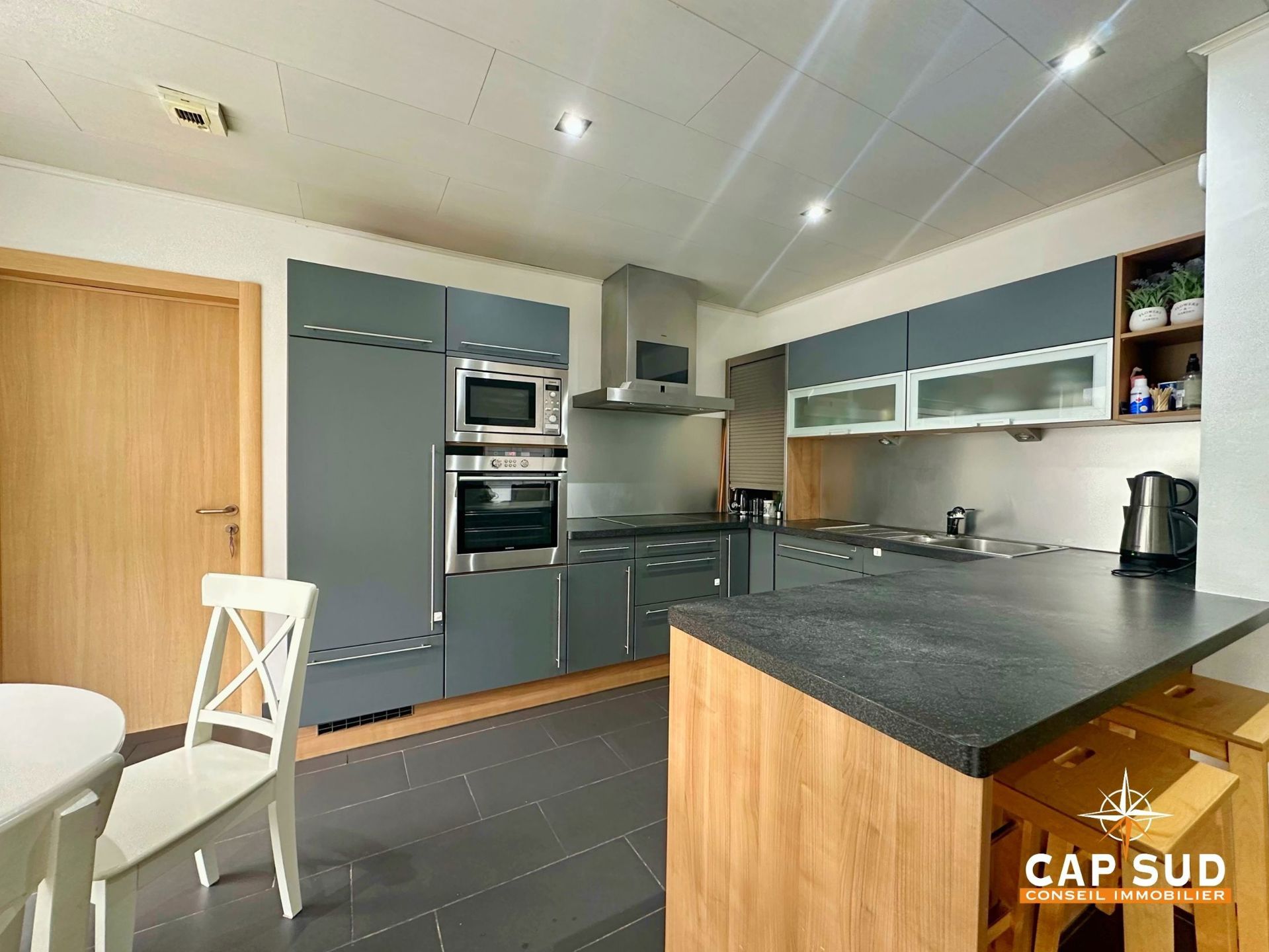 La cuisine américaine ouverte de 12 m², entièrement équipée avec des électroménagers Siemens, ravira les amateurs de convivialité.