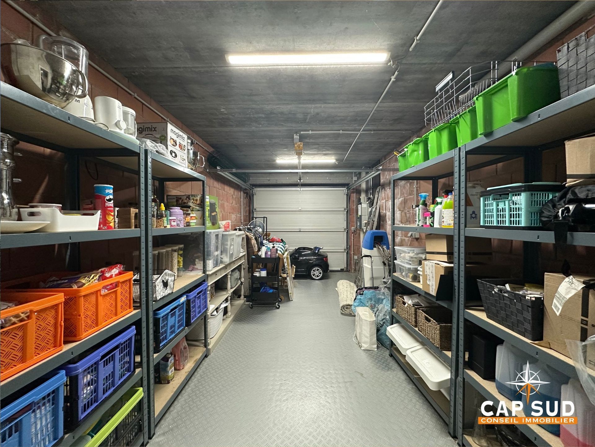 Une buanderie de 8 m² et un garage de 19 m² avec porte automatique complètent ce niveau, ainsi que trois emplacements de parking à l’avant.