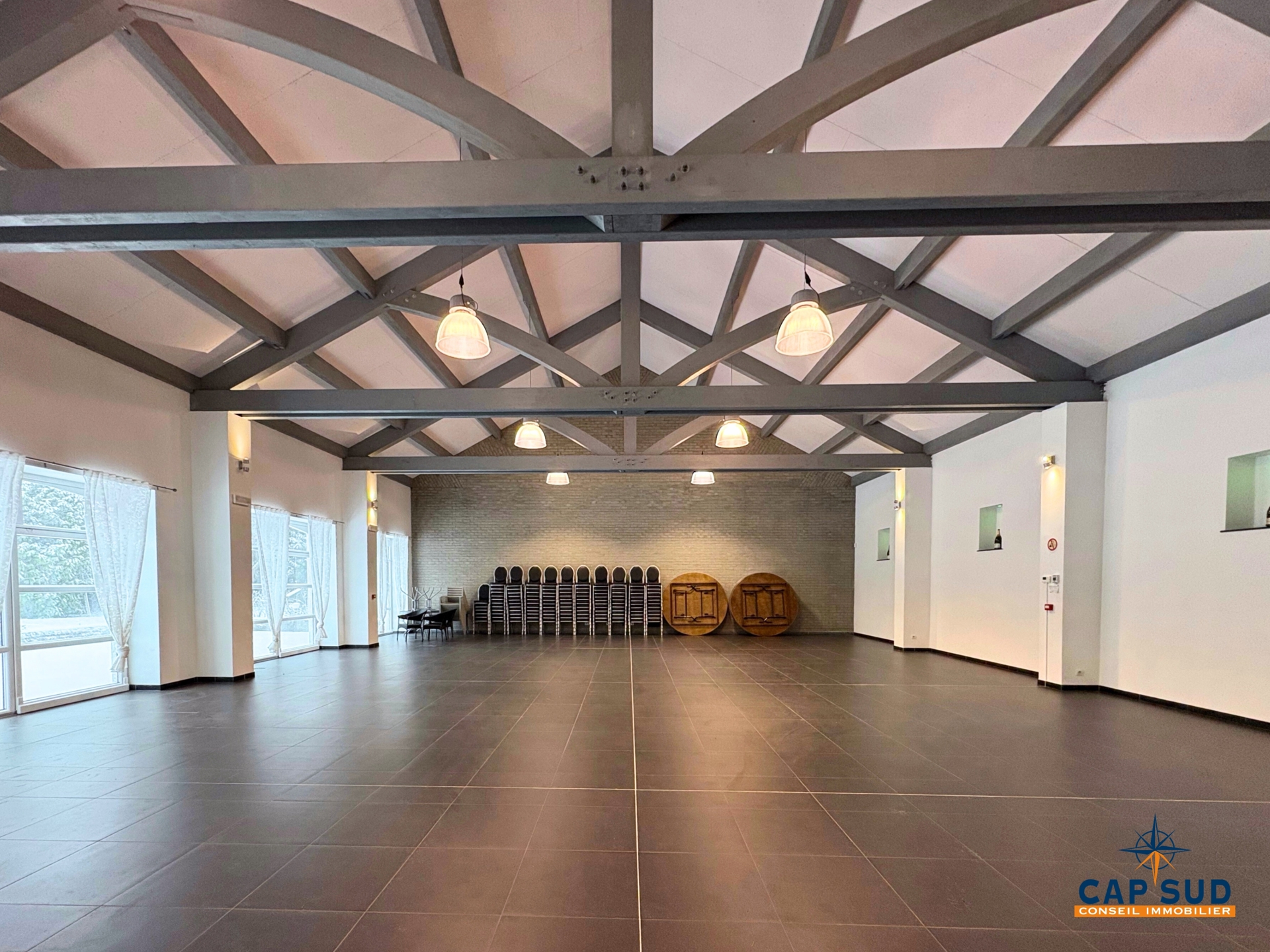 -Une vaste salle de réception avec belle hauteur sous plafond et charpente apparente