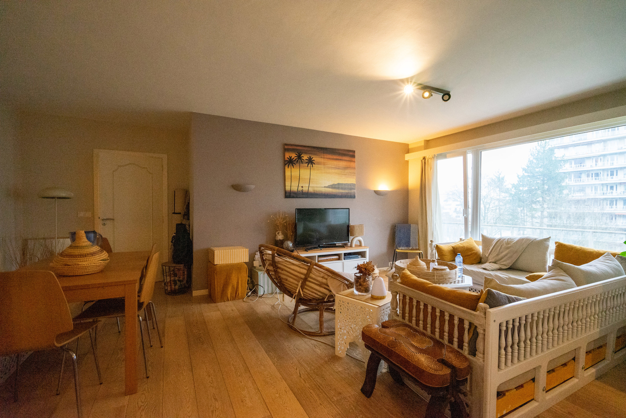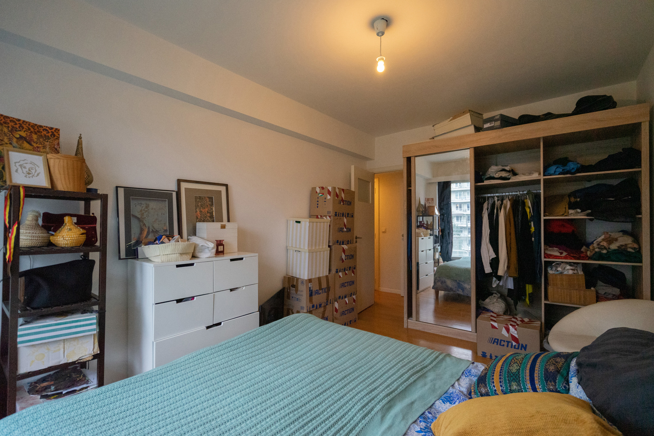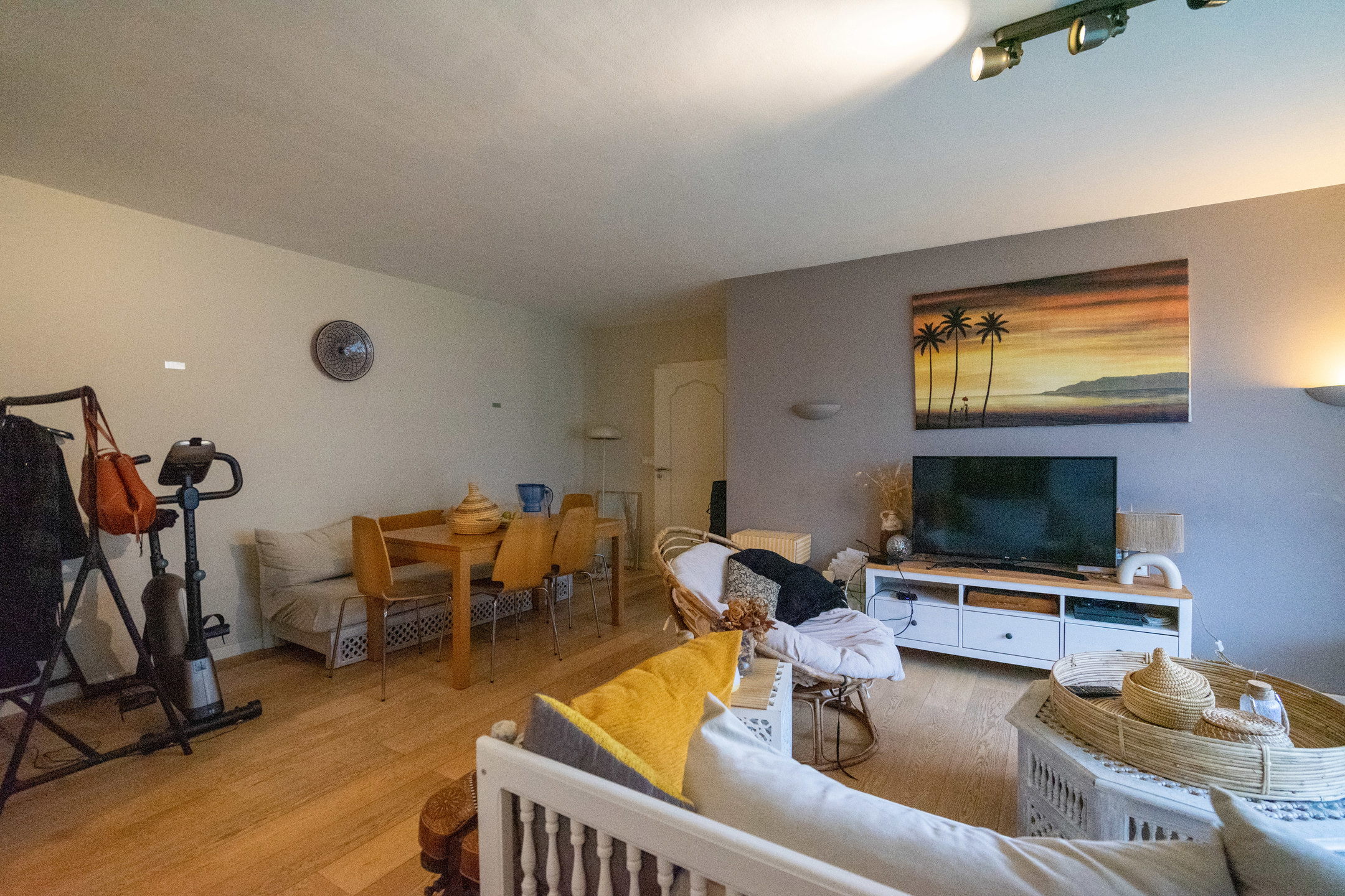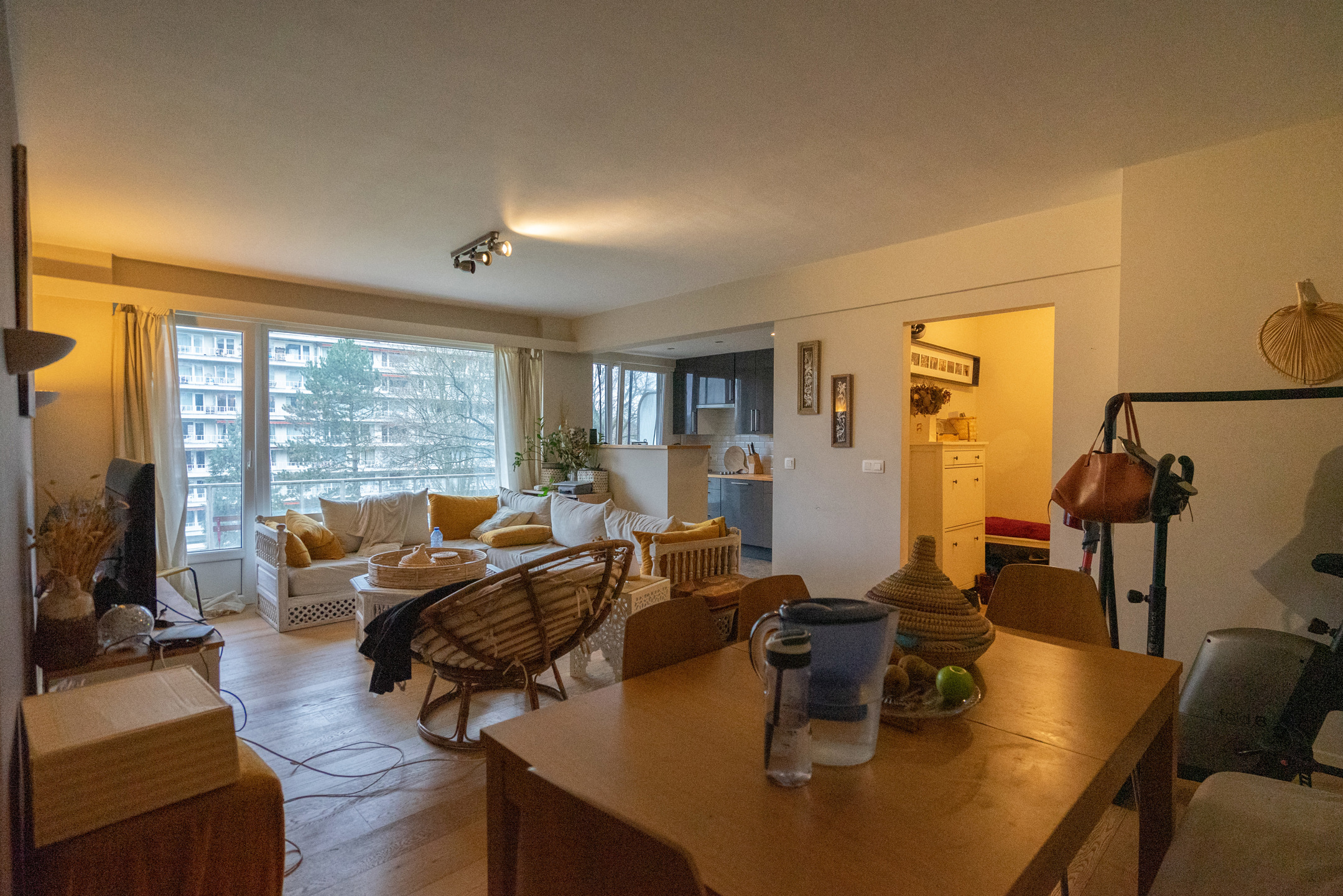 L’appartement s’ouvre sur un séjour lumineux de ± 25m² intégrant une cuisine américaine super-équipée de ± 5,5m². Le hall de nuit dessert deux chambres (± 13m² et ± 12m²), dont l’une est dotée de placards intégrés. Côté sanitaires, le bien dispose d’une salle de bain (avec emplacement machine à laver) ainsi que d’une toilette séparée. Vous profiterez également d’une belle terrasse de ± 15m² offrant une vue dégagée sur les jardins de la copropriété. Une cave privative complète l’ensemble et des places de parking sont disponibles aux abords de l’immeuble pour les habitants.