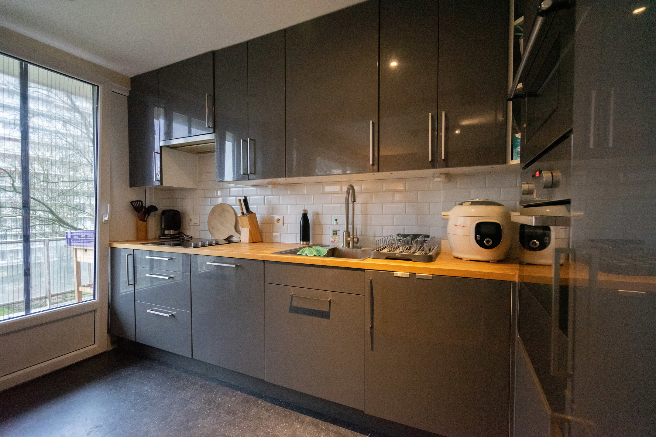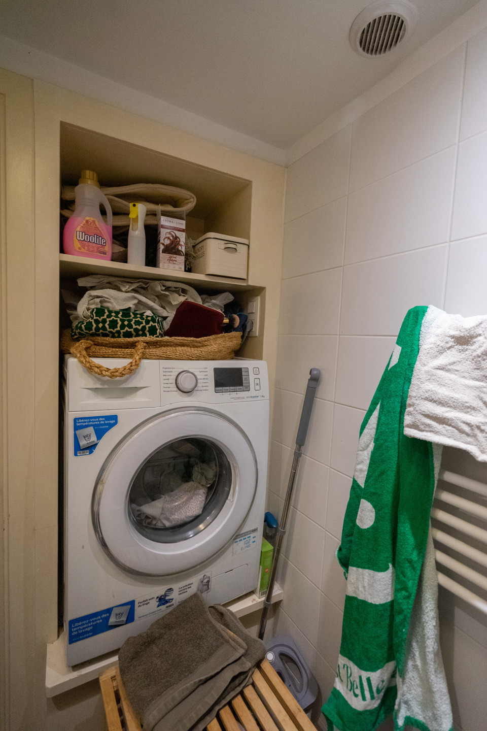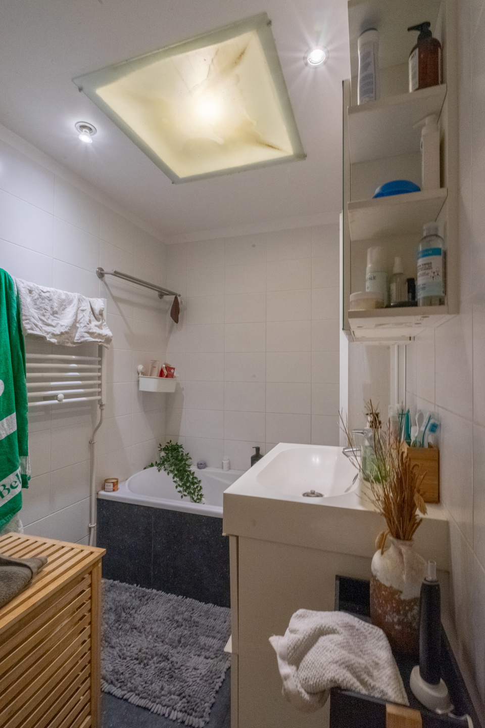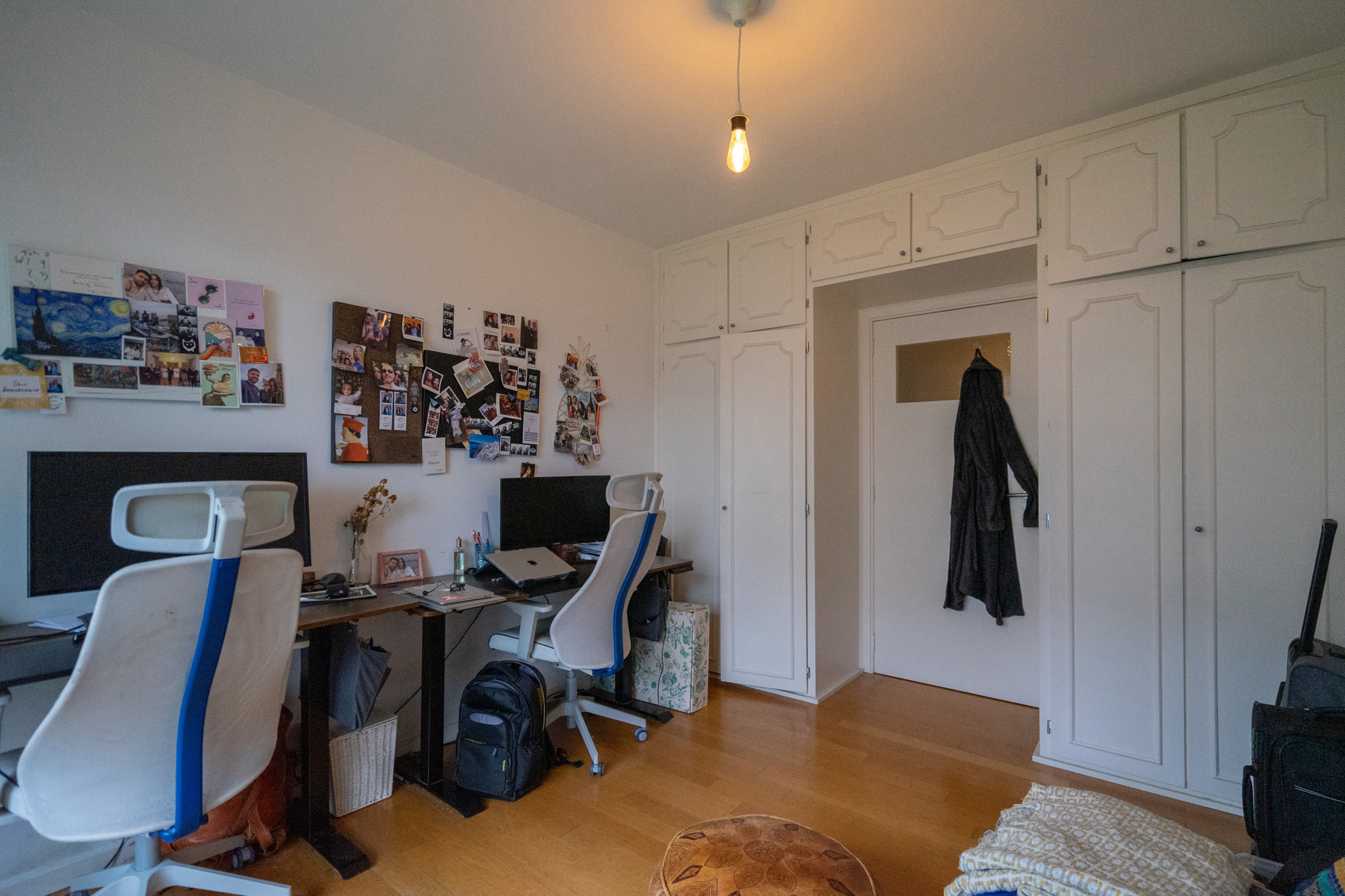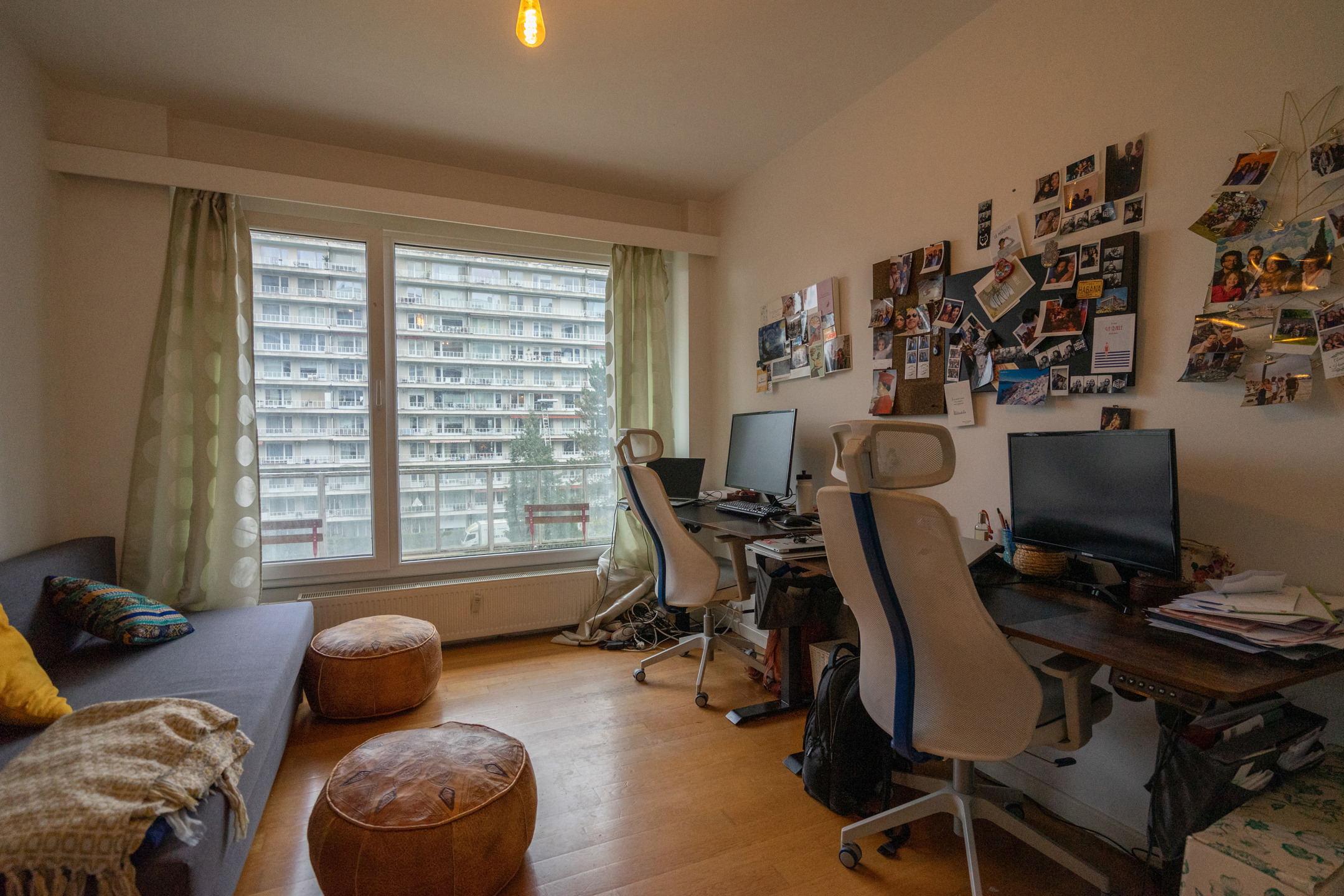L’appartement s’ouvre sur un séjour lumineux de ± 25m² intégrant une cuisine américaine super-équipée de ± 5,5m². Le hall de nuit dessert deux chambres (± 13m² et ± 12m²), dont l’une est dotée de placards intégrés. Côté sanitaires, le bien dispose d’une salle de bain (avec emplacement machine à laver) ainsi que d’une toilette séparée. Vous profiterez également d’une belle terrasse de ± 15m² offrant une vue dégagée sur les jardins de la copropriété. Une cave privative complète l’ensemble et des places de parking sont disponibles aux abords de l’immeuble pour les habitants.