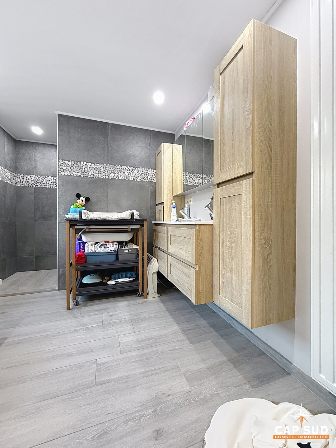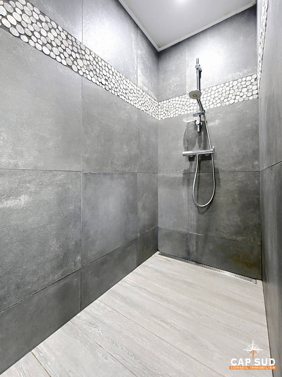 Le premier étage se compose d’un hall de nuit donnant accès à deux chambres, une salle de bain avec douche italienne et baignoire et un WC indépendant.
