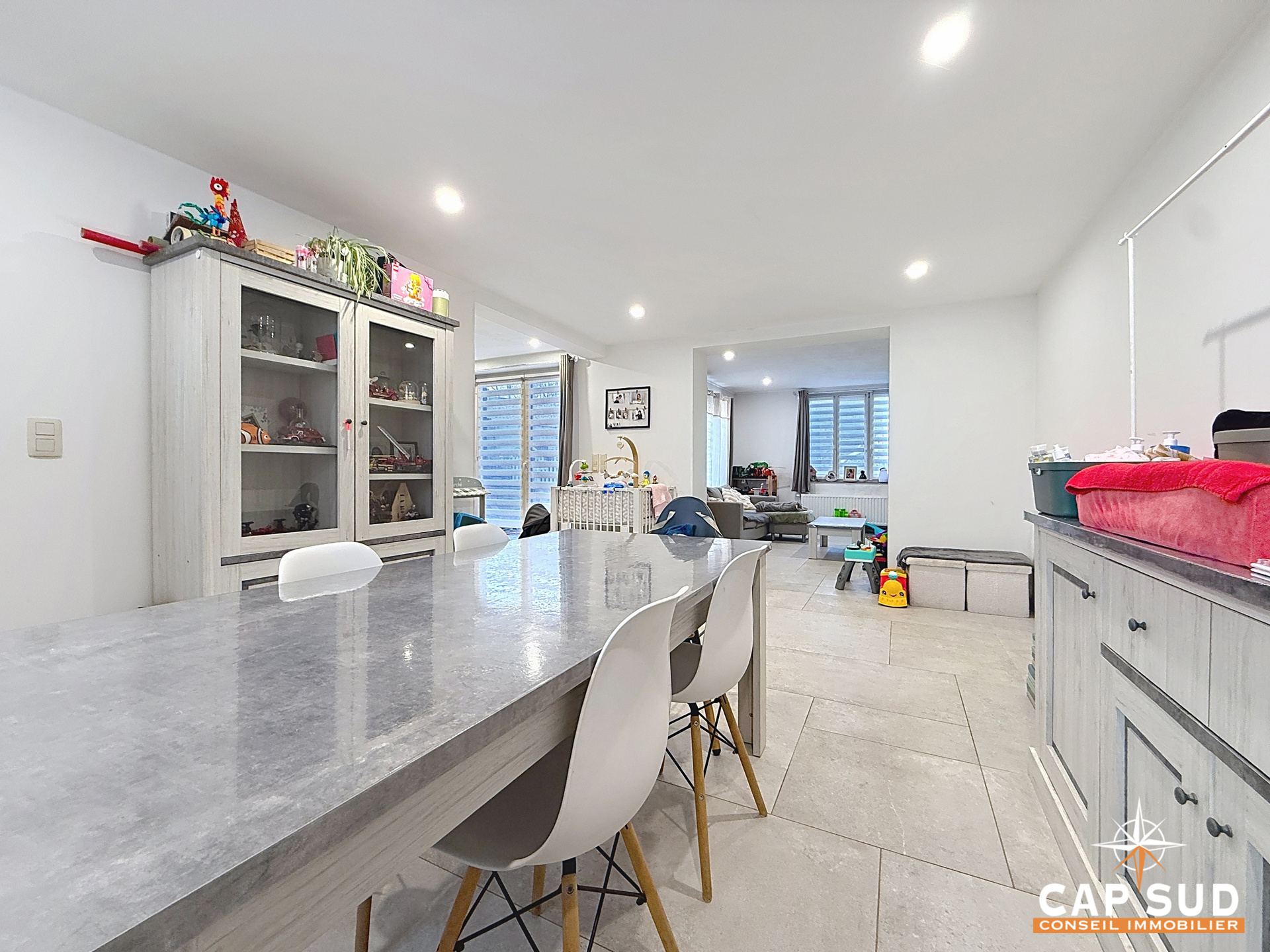 Au rez-de-chaussée, vous découvrirez un hall d’entrée avec wc, une salle à manger conviviale et un salon lumineux, une nouvelle cuisine équipée ainsi qu’une buanderie.