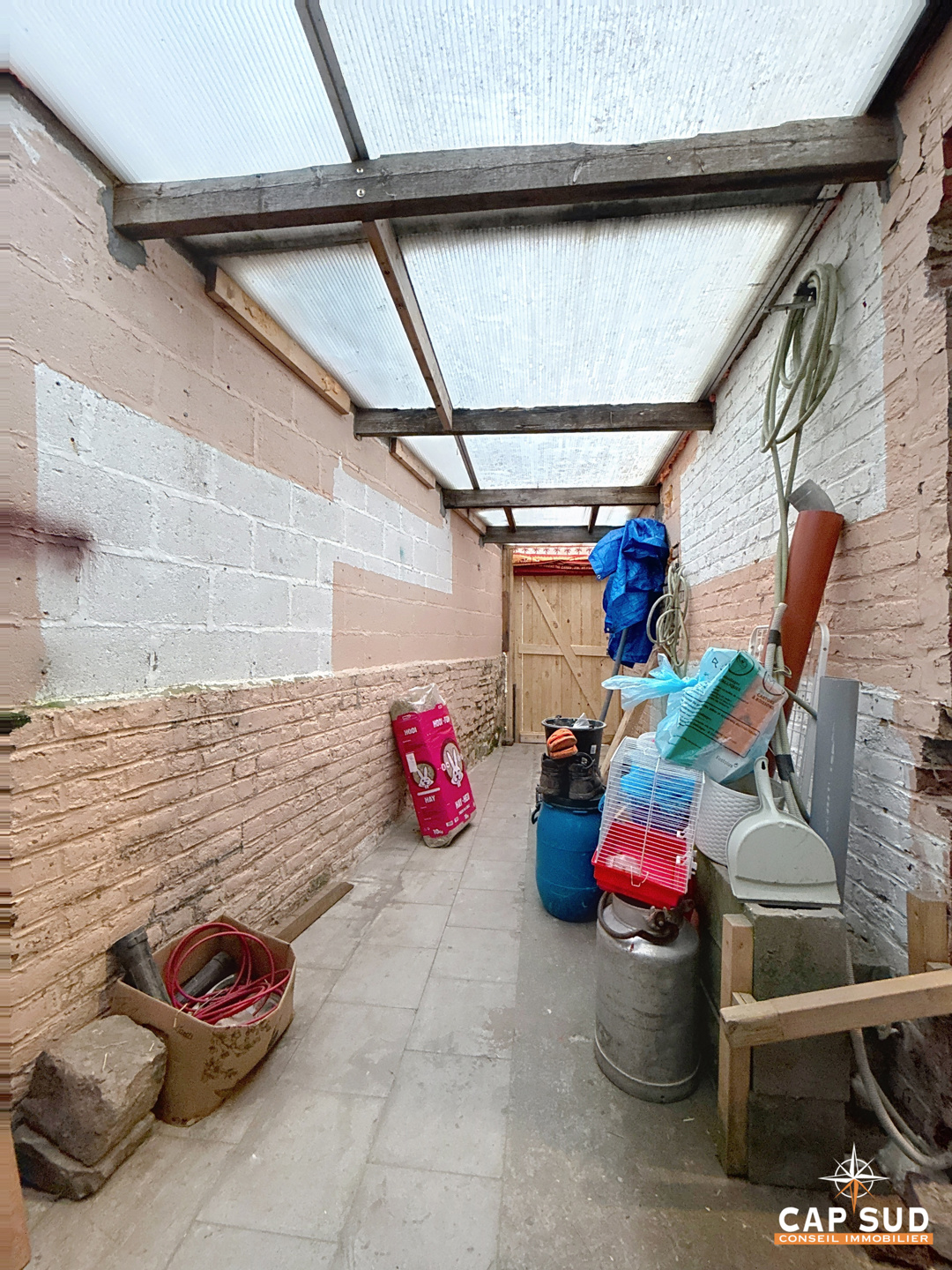 Il existe un espace de stockage/petit garage sur le côté gauche de la maison qui permet également de passer à l’arrière et une cave.