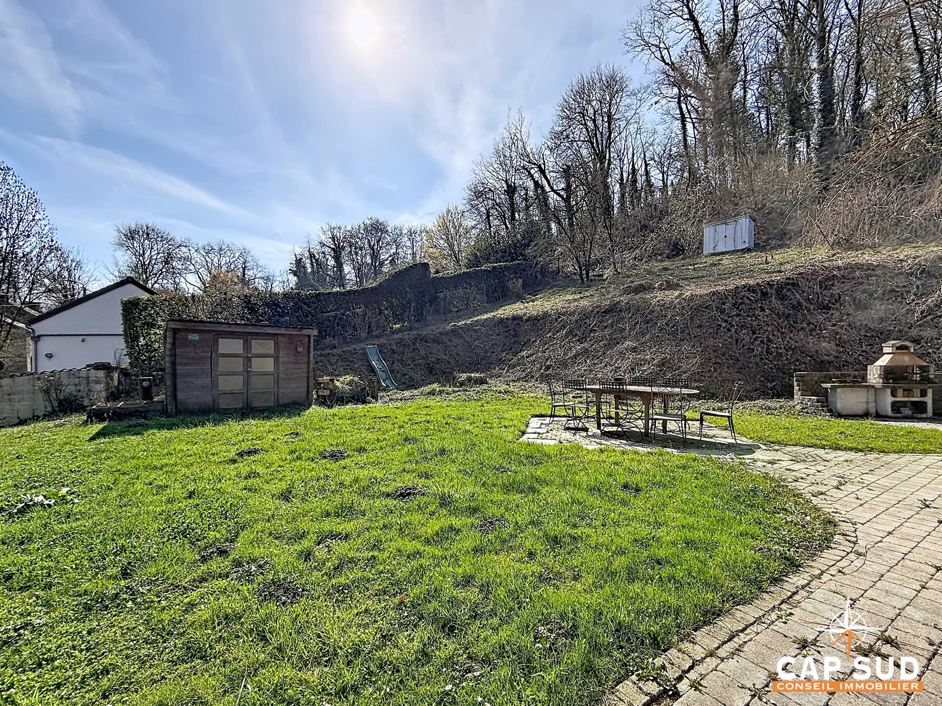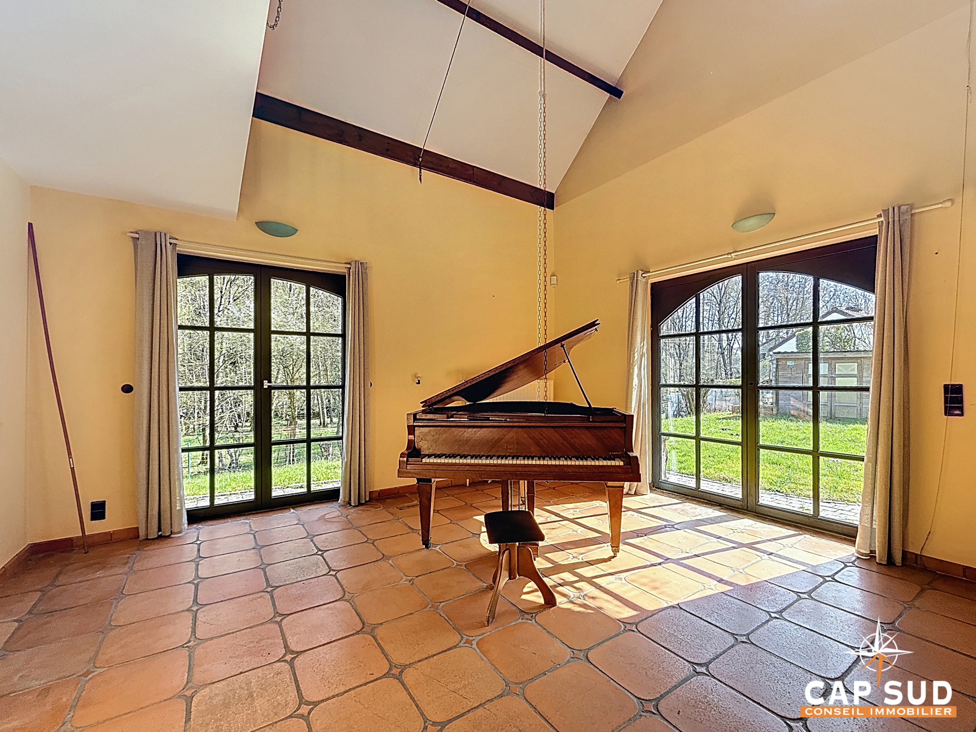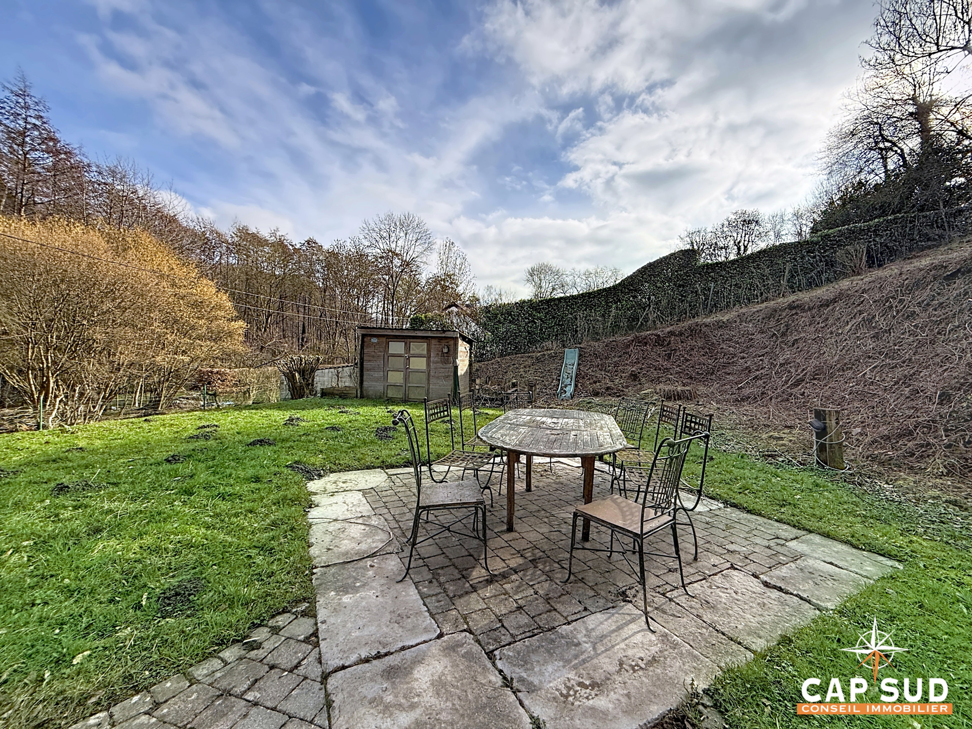 À l’extérieur, une spacieuse terrasse orientée plein sud vous permettra de profiter pleinement du cadre naturel et du jardin arboré.