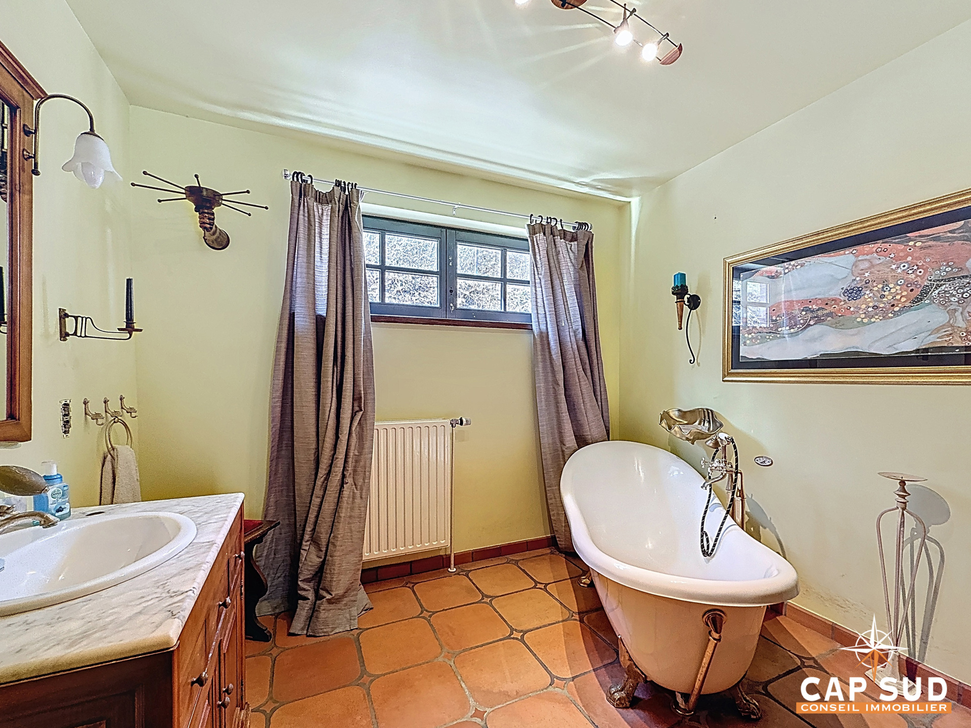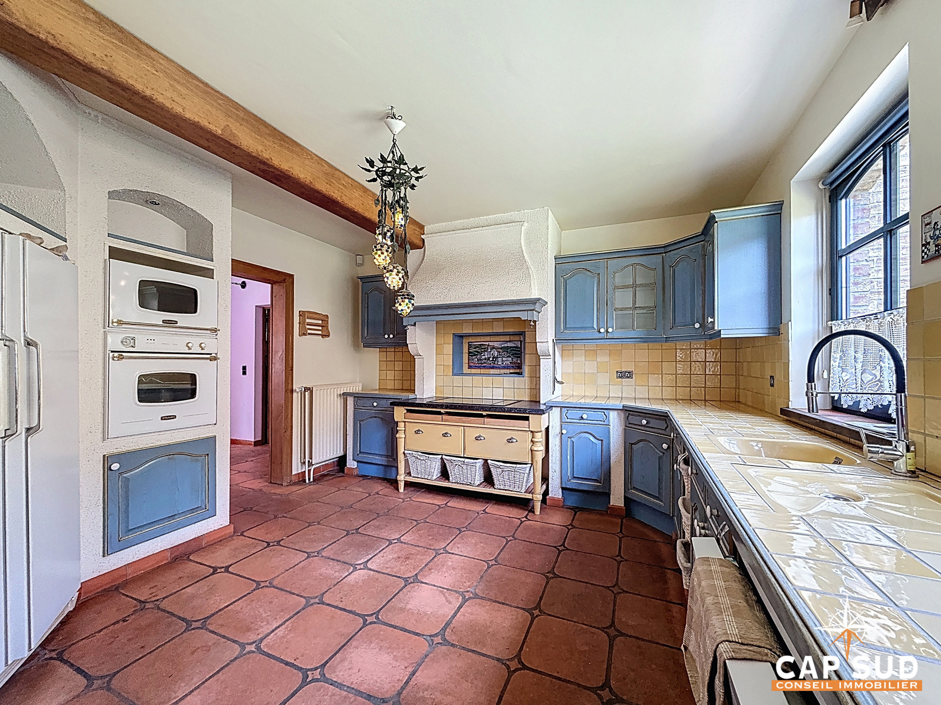 Au rez-de-chaussée, vous profiterez d’une cuisine entièrement équipée au style provençal, conviviale et fonctionnelle, avec accès direct à une buanderie et vers l’extérieur. Une salle de bain de style victorien, ainsi qu’un WC séparé, complètent ce niveau.