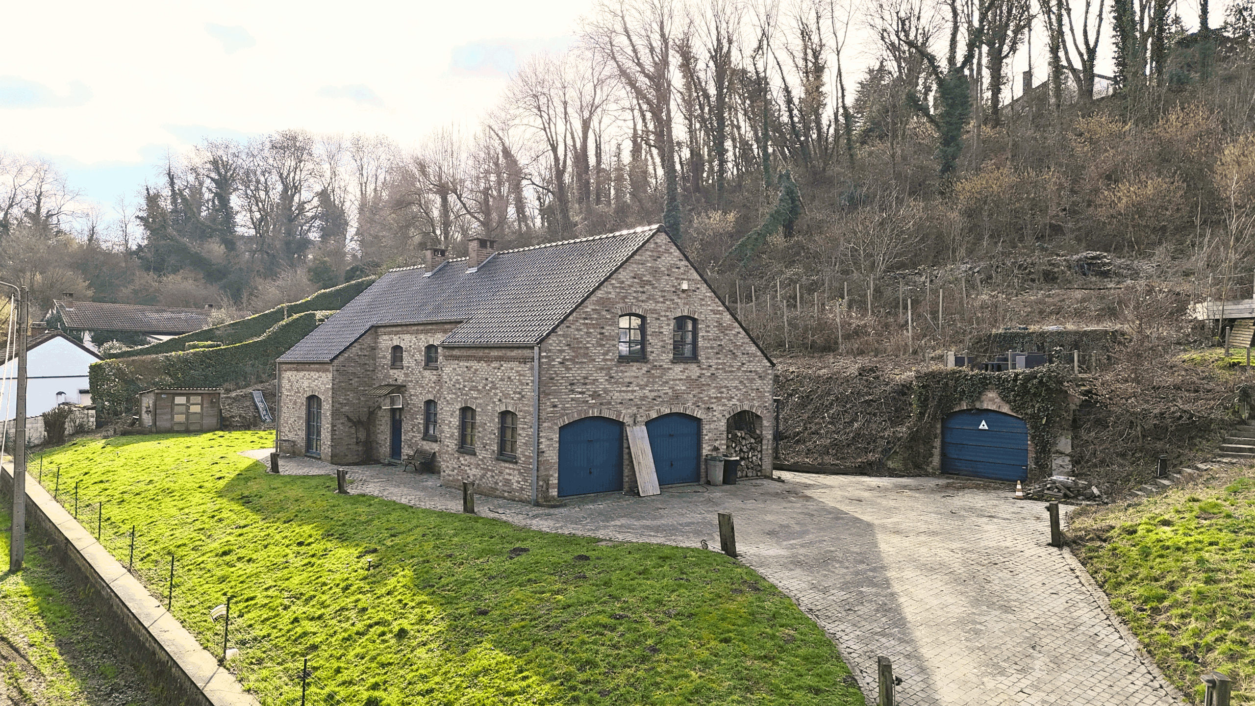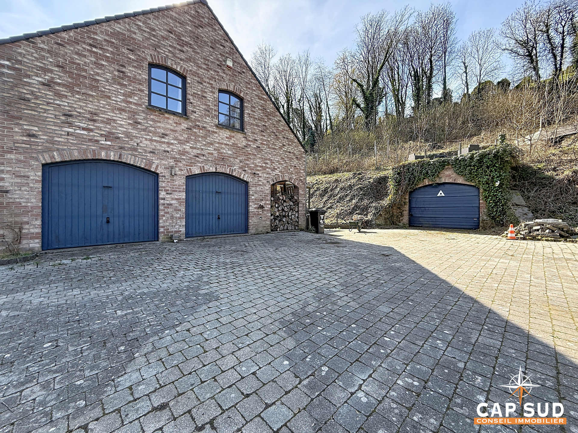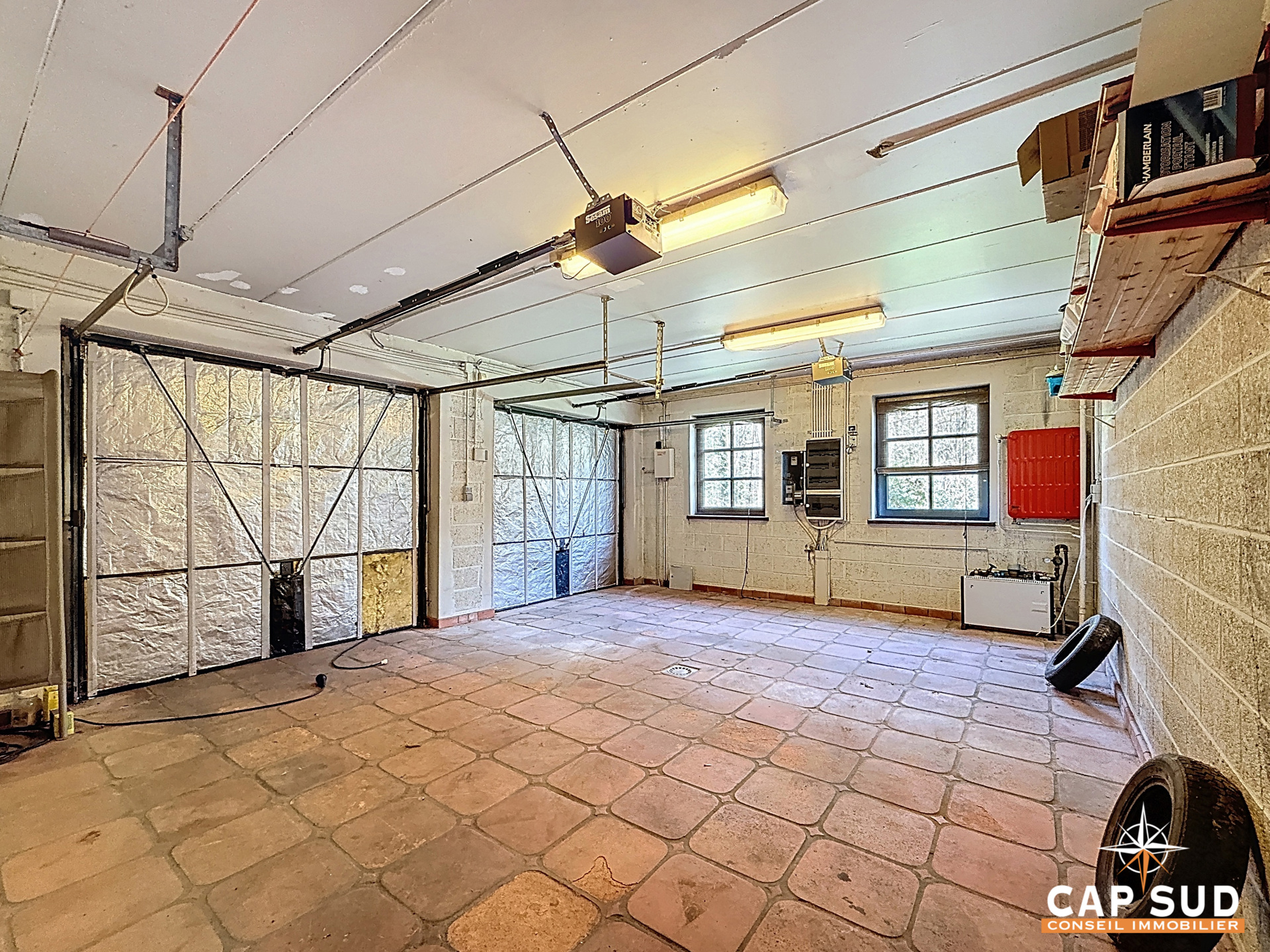 Côté pratique, vous bénéficiez de deux garages intérieurs avec portes électriques ainsi que d’un garage extérieur fermé d’environ 25 m².