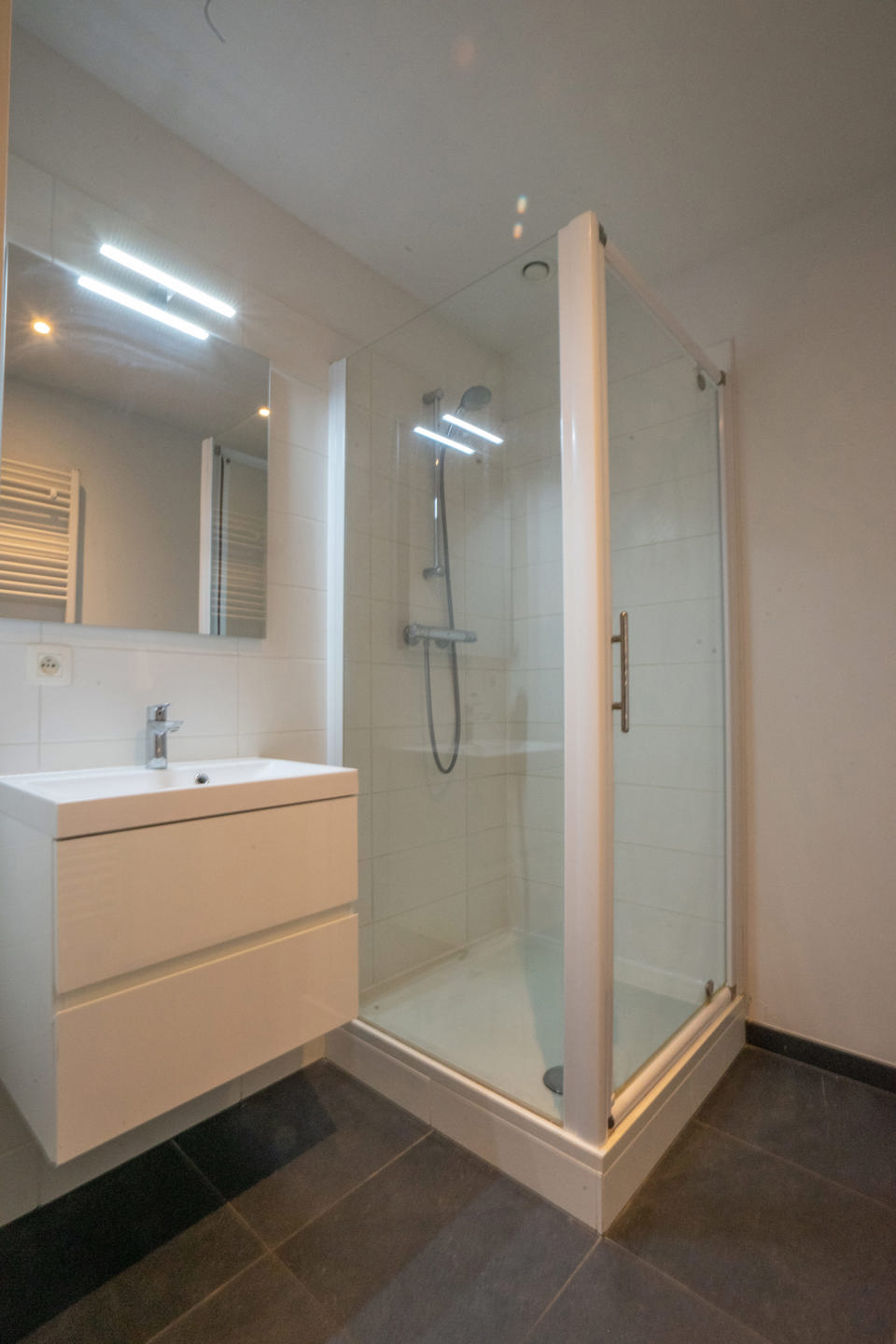 Le studio s’articule autour d’une pièce principale de ± 26 m² intégrant une cuisine équipée, le tout donnant accès à une terrasse privative de ± 8 m². Le bien dispose également d’un hall d’entrée avec toilette séparée et d’une salle de douche moderne avec un emplacement dédié pour la machine à laver.