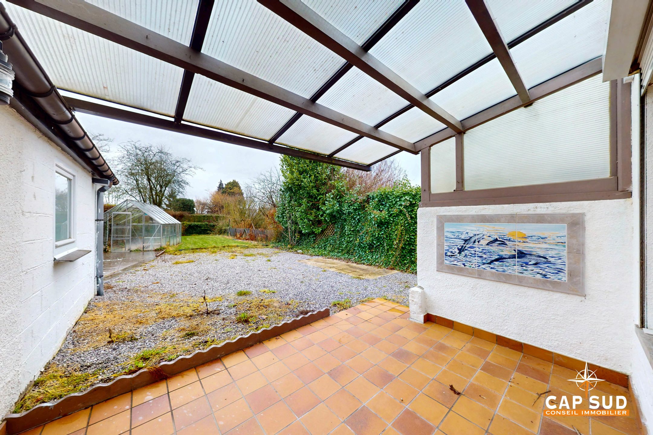 Hall d’entrée, living, véranda, cuisine équipée, 2 chambres rez, salle de bains, débarras