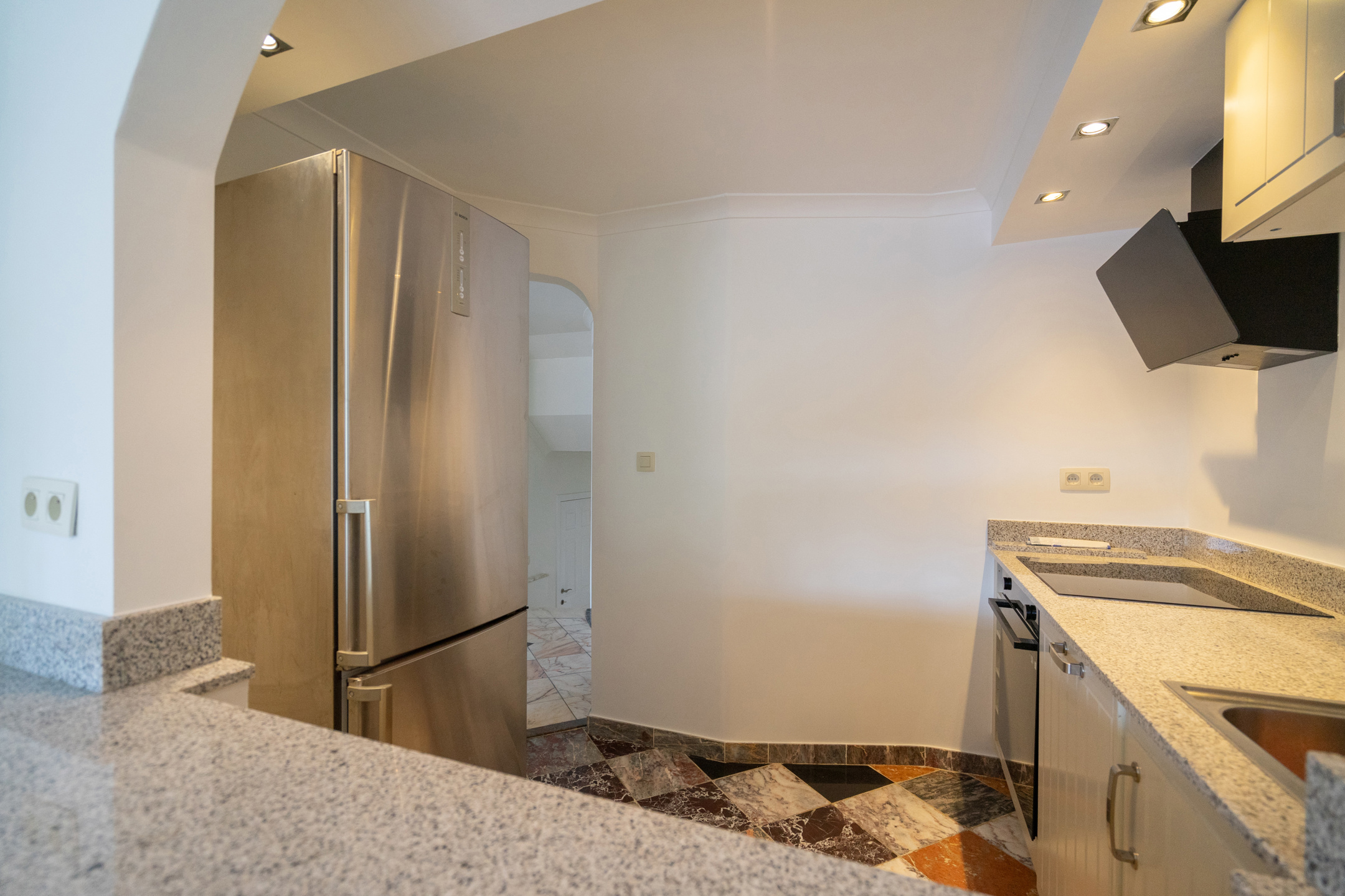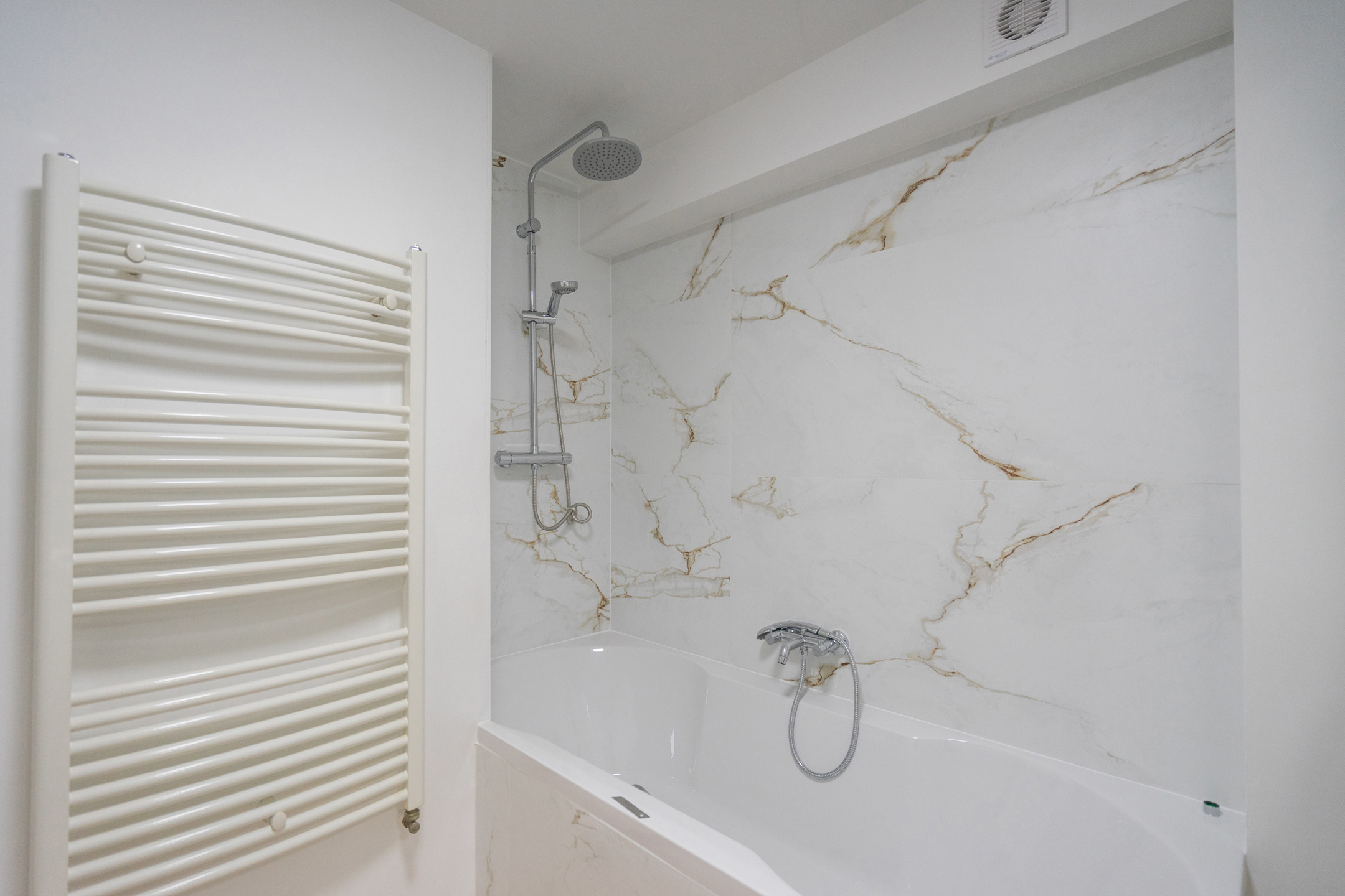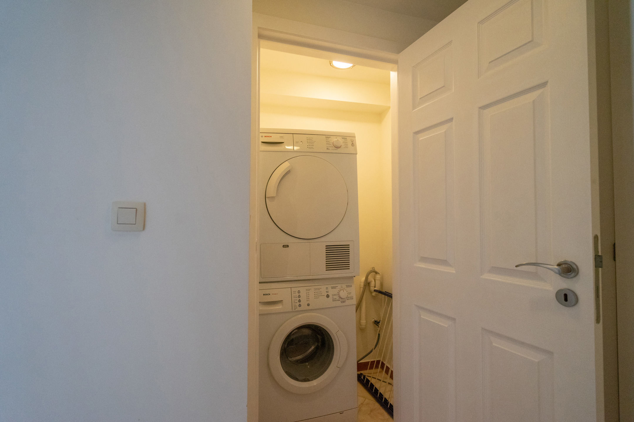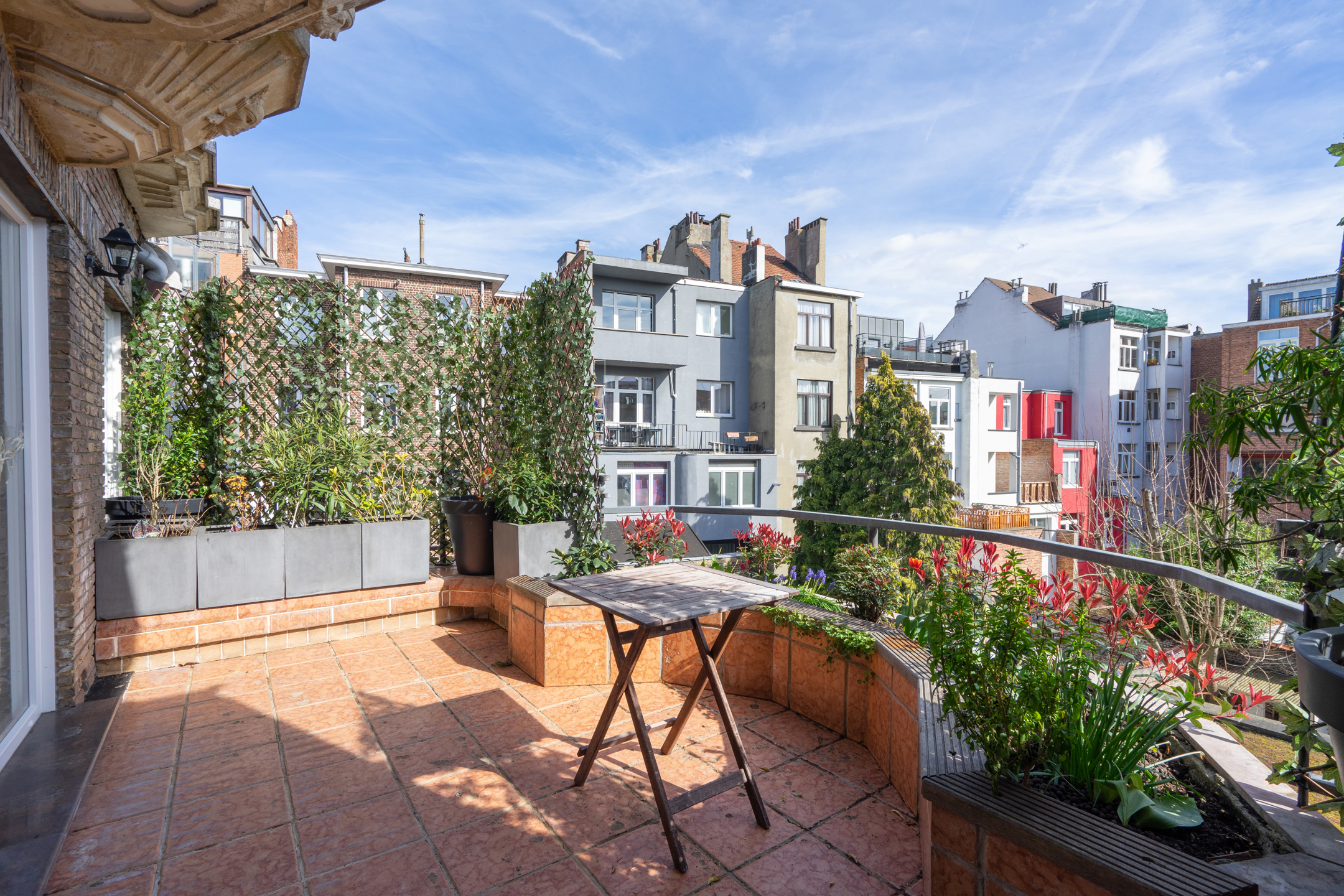 L’appartement dispose d’un vaste living de ± 42m² avec une cuisine ouverte super-équipée, le tout donnant accès à une agréable terrasse de ± 10m² orientée SUD. L’espace nuit se compose de deux chambres (± 13,5m² et ± 12m²) équipées de placards intégrés. Le bien comprend également une salle de bain (douche dans le bain), un hall d’entrée avec placard, une toilette séparée ainsi qu’une buanderie équipée d’un lave-linge et d’un sèche-linge.