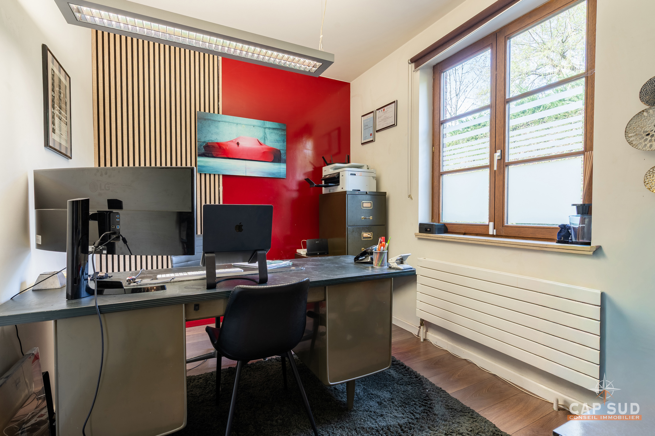 Dès le hall d’entrée, on accède à de beaux espaces de vie (65m2) très lumineux. Le salon avec feu ouvert offre une ambiance chaleureuse, complété par une salle à manger agréable ouverte sur le jardin. La cuisine Siematic, entièrement équipée, est à la fois moderne et conviviale, idéale au quotidien comme pour recevoir. Un bureau séparé complète ce niveau.