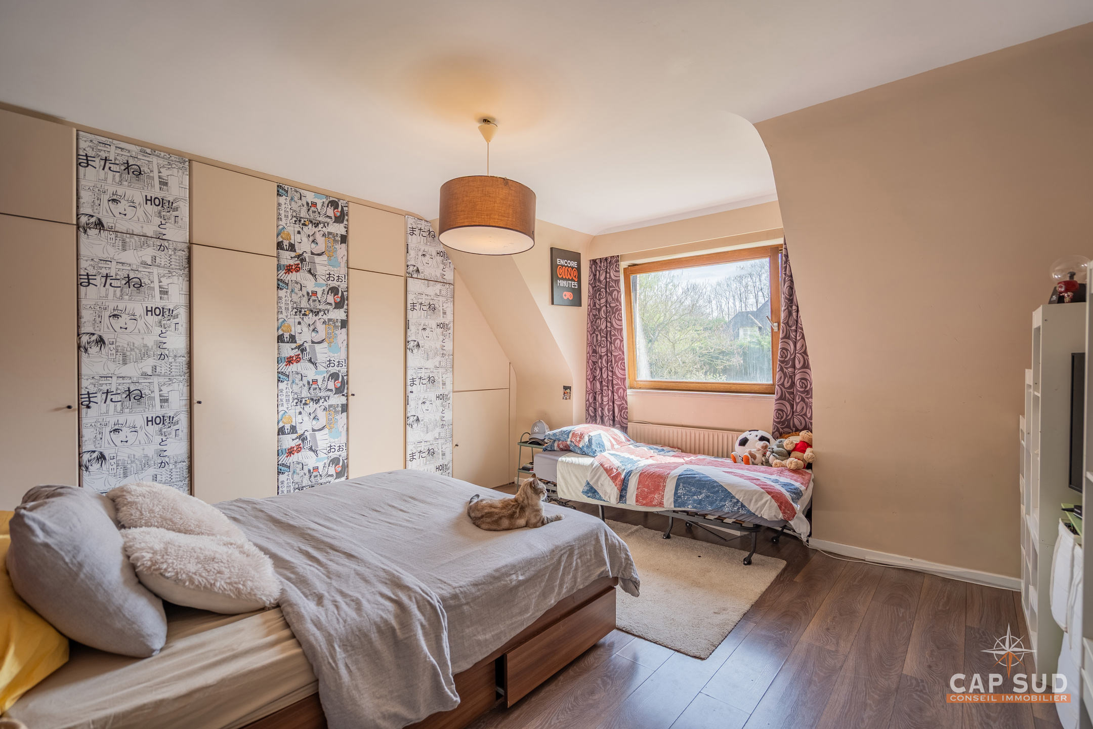 À l’étage, le hall de nuit dessert une suite parentale (38m2) avec rangements intégrés et salle de bain attenante. Quatre autres chambres (21,20,16 et12m2), ainsi que deux salles d’eau, permettent d’accueillir confortablement une famille. Grenier de rangement.