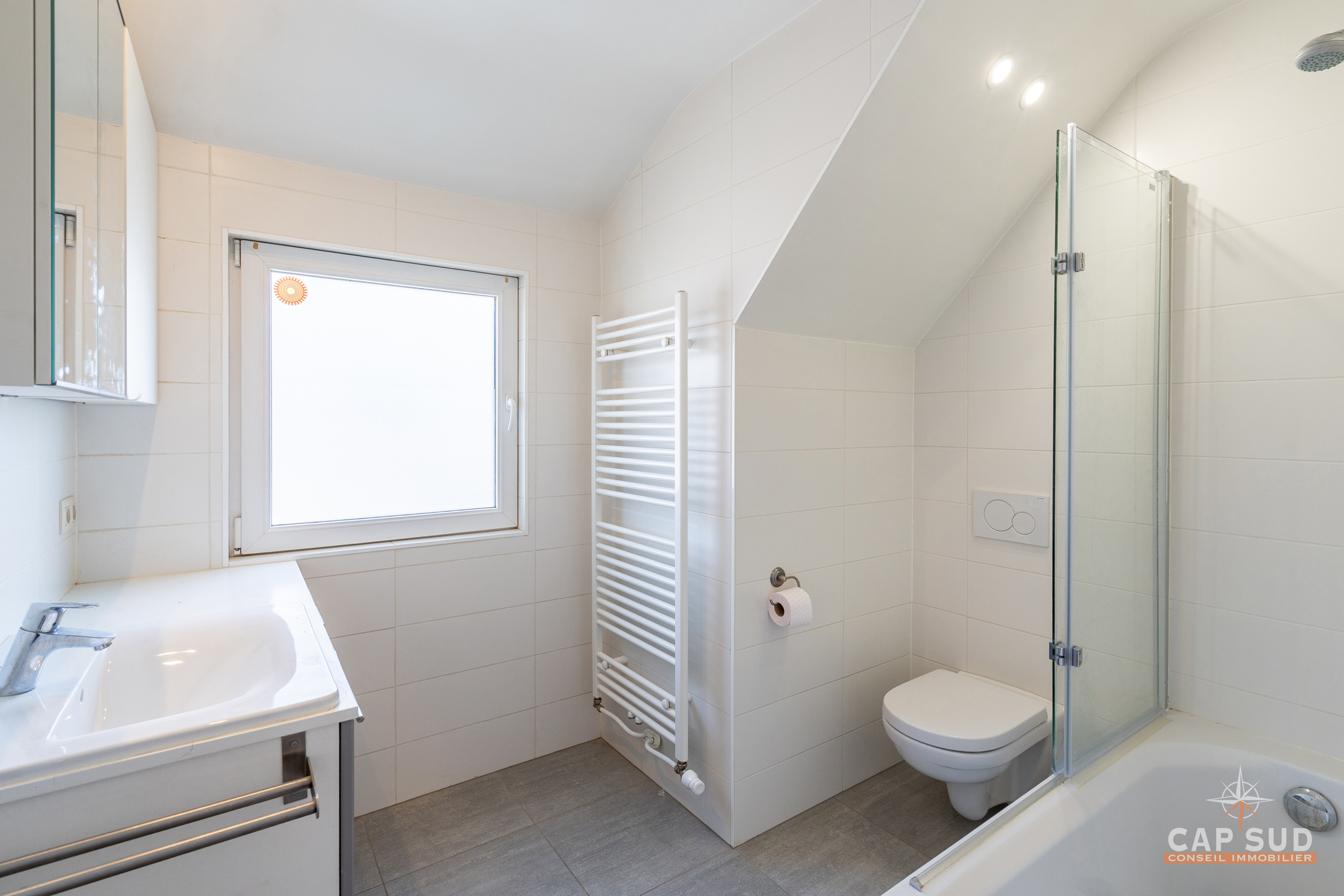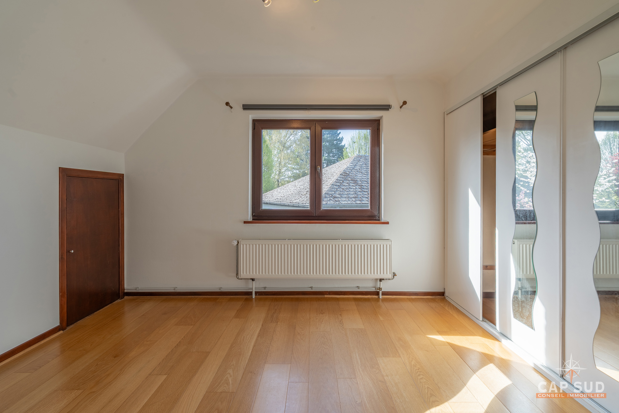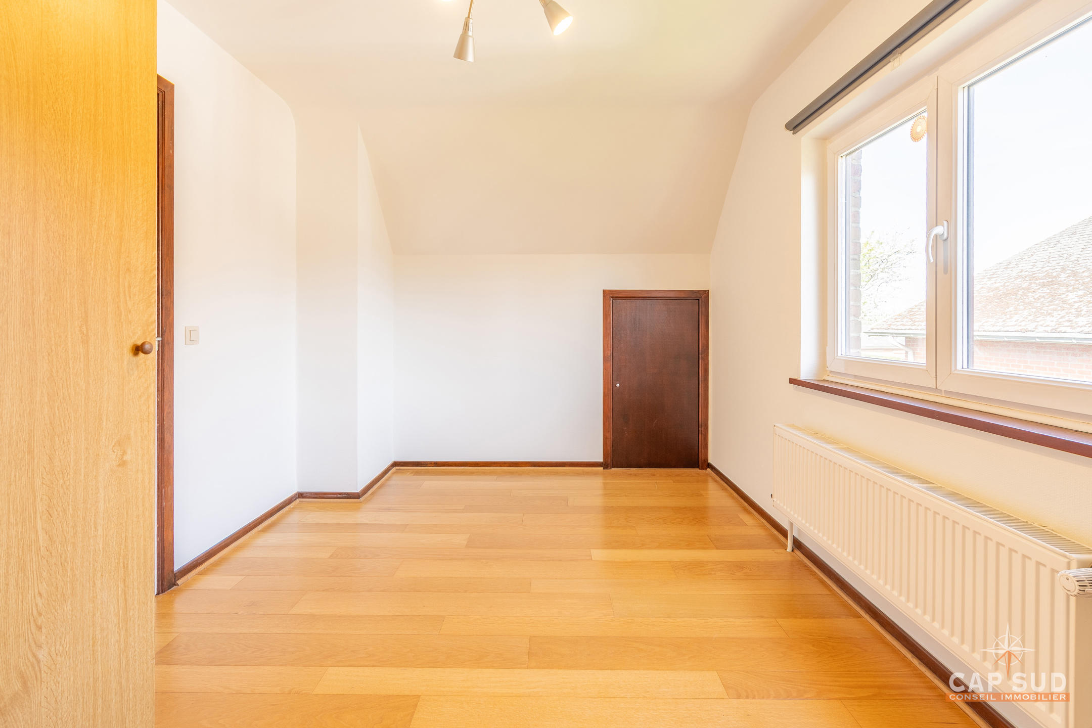 L’étage se compose d’un hall de nuit desservant deux chambres avec placard intégré (+-13 m² et +-12 m²), un dressing de +-8 m², une salle de bains équipée d’une baignoire, d’un lavabo et d’un WC.