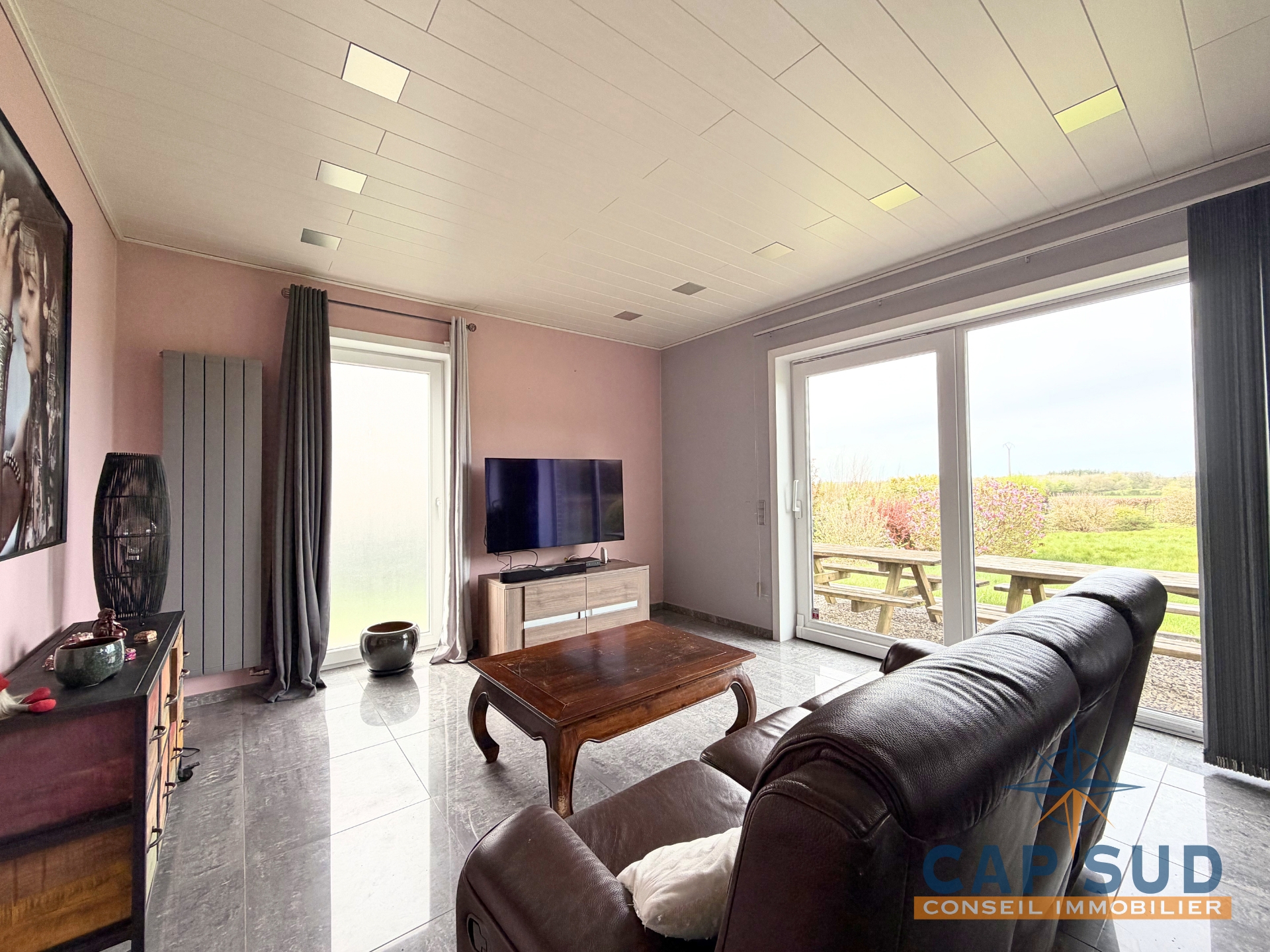 Les pièces de vie se composent d’un salon chaleureux, d’une salle à manger conviviale et d’une cuisine équipée. L’ensemble est baigné de lumière grâce à de larges baies vitrées offrant une vue dégagée et apaisante sur le jardin.