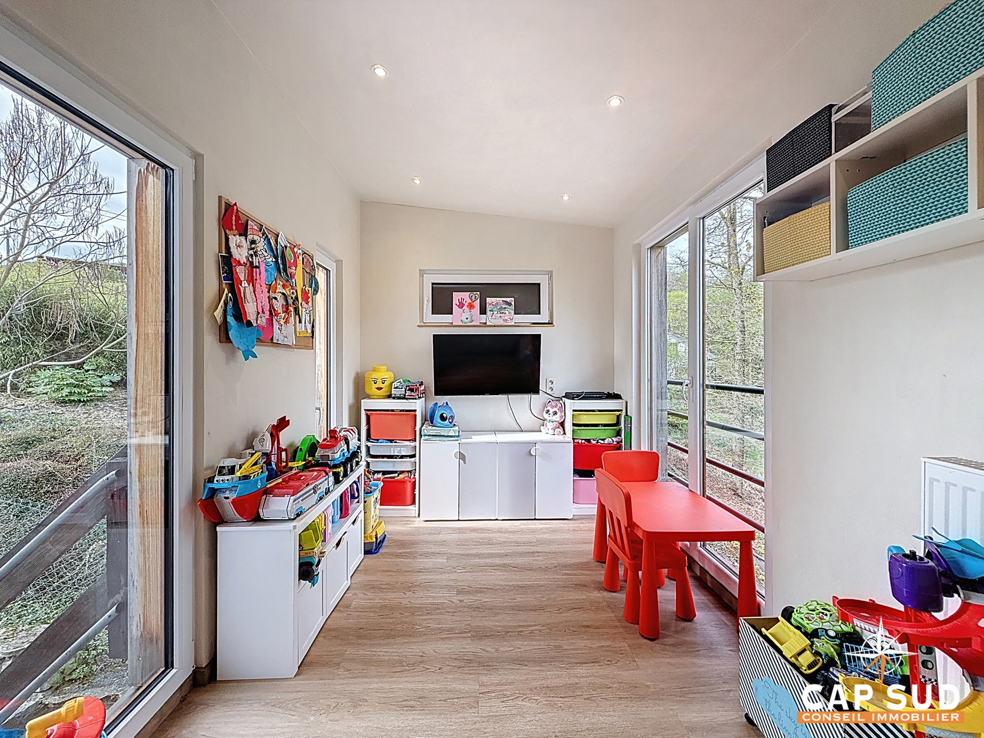Composition : au rez-de-chaussée : un hall d’entrée avec wc, une cuisine équipée de 2020, un salon – salle à manger chaleureux avec coin lecture et poêle à bois ainsi qu’une pièce bureau/salle-de-jeux.
