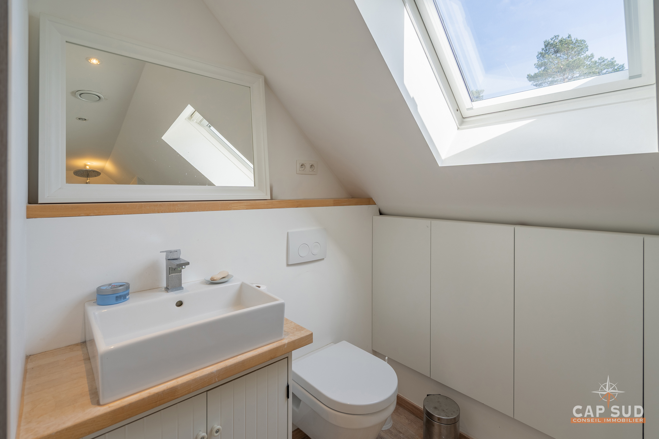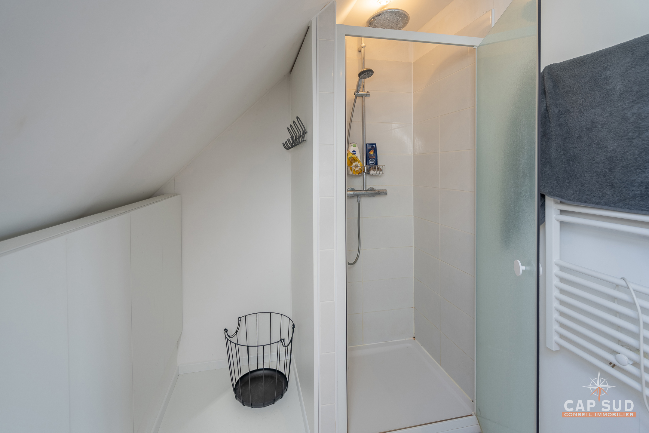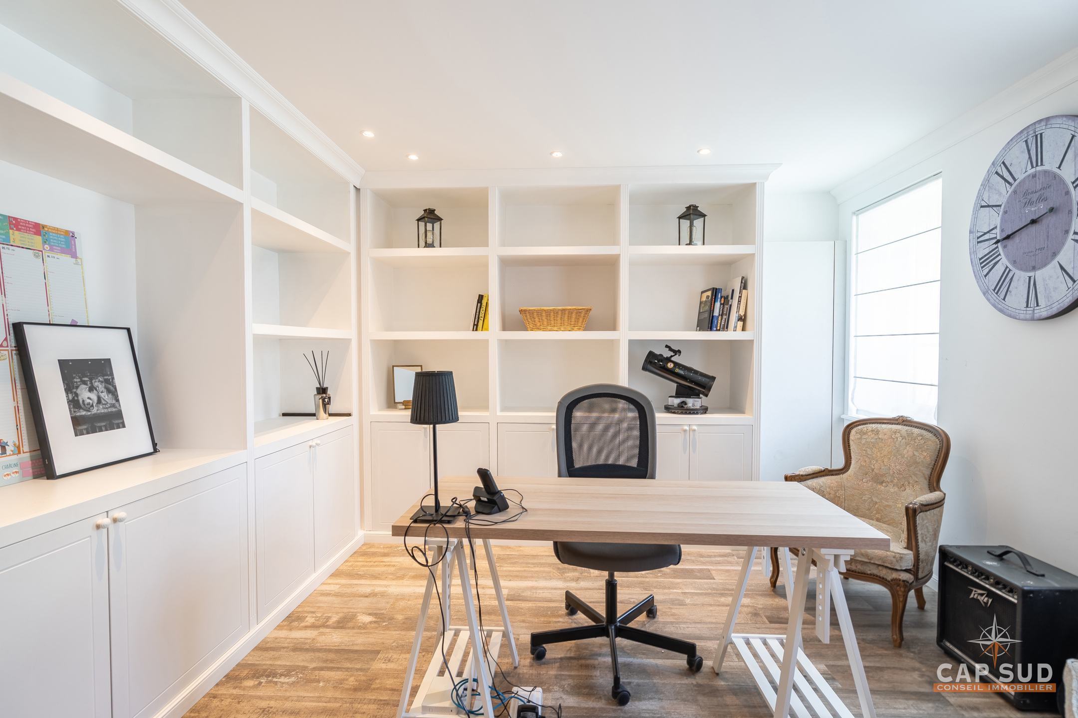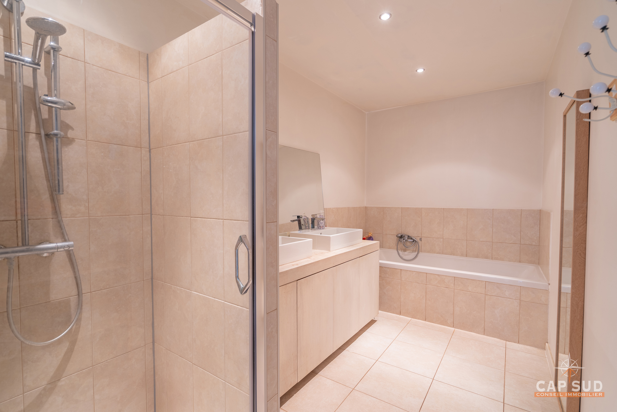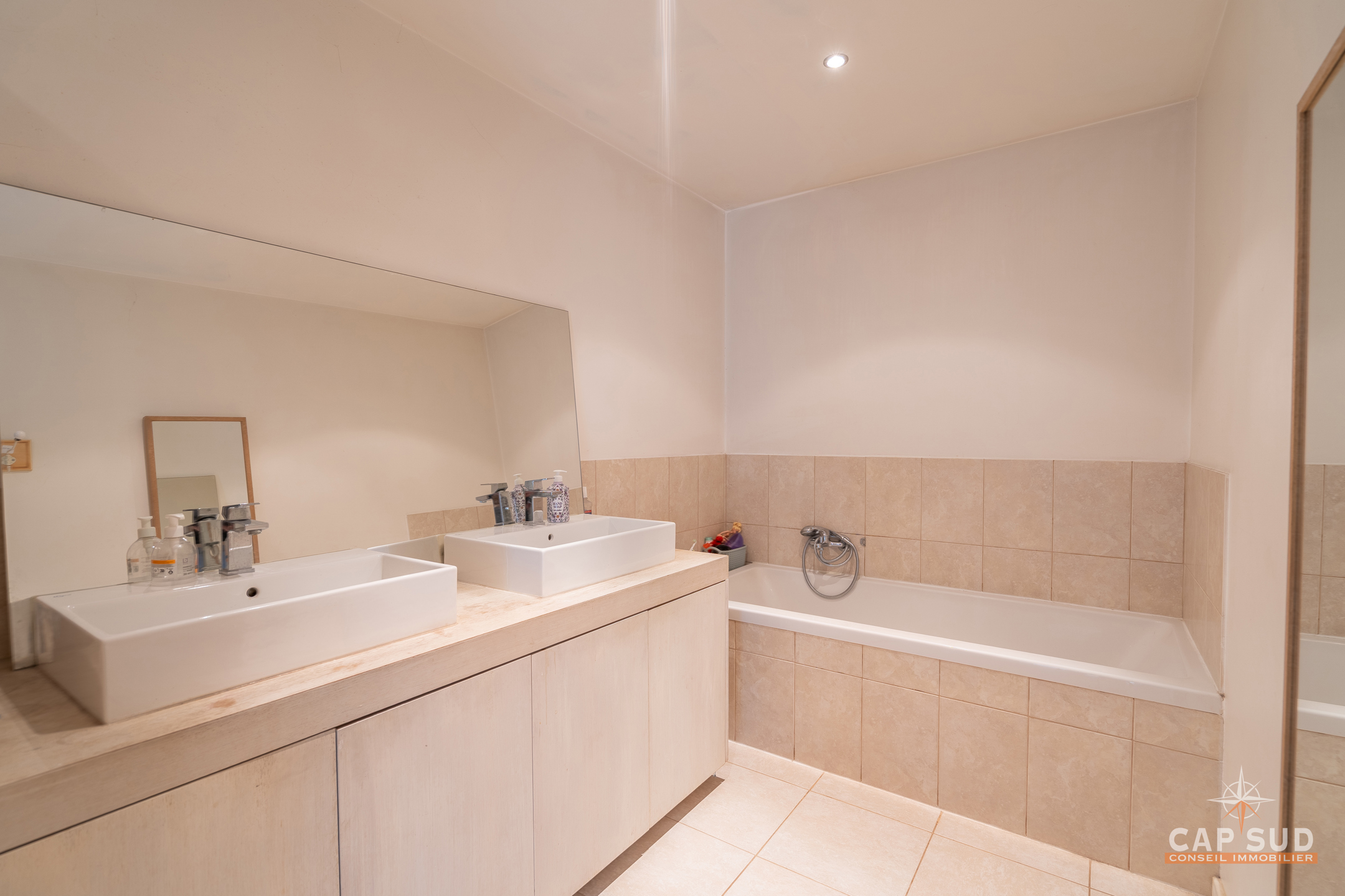 Le rez-de-chaussée propose également un bureau ou chambre de 15 m², une salle de bains complète (douche, baignoire, double lavabo), une buanderie/local technique ainsi qu’un garage avec porte automatique.