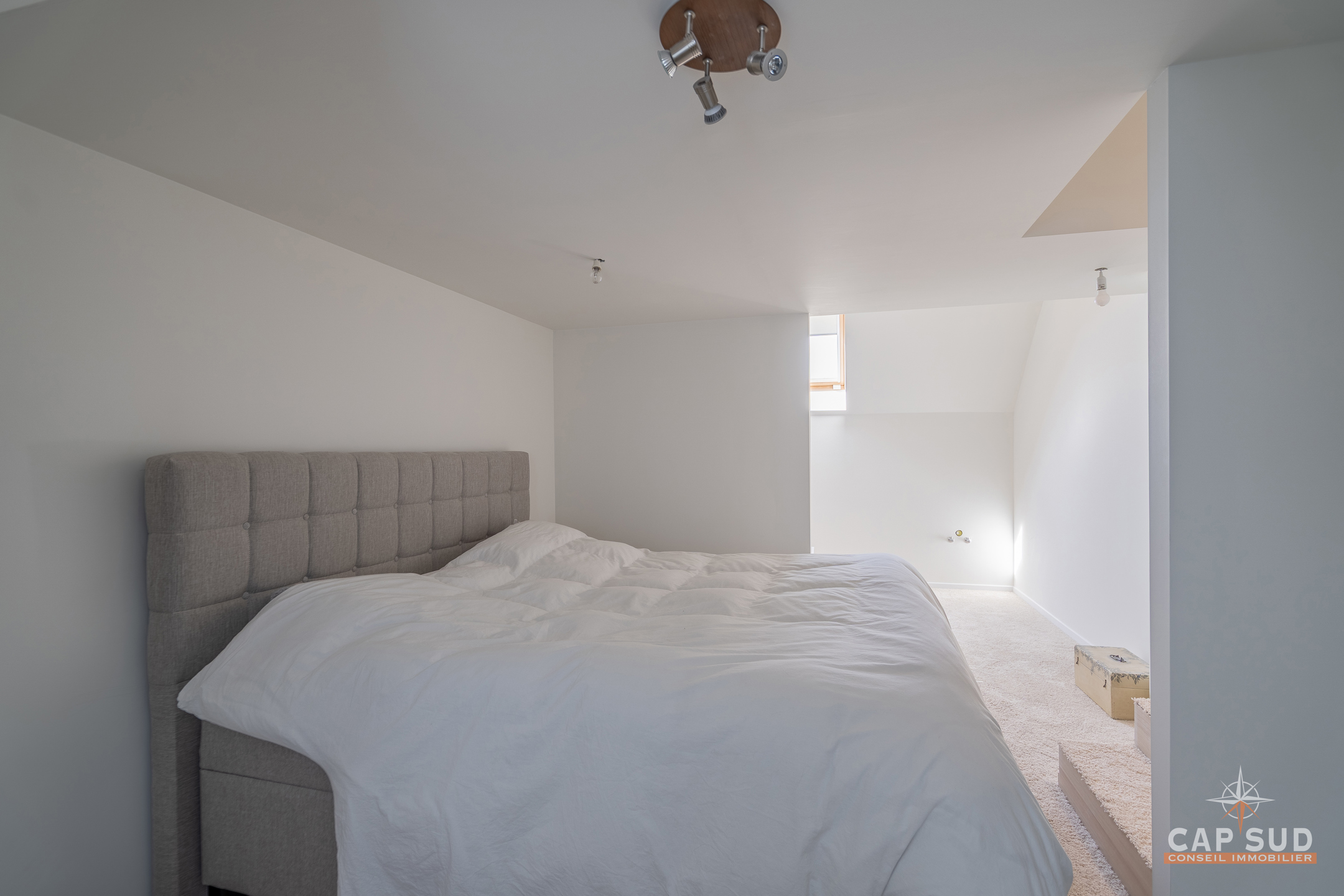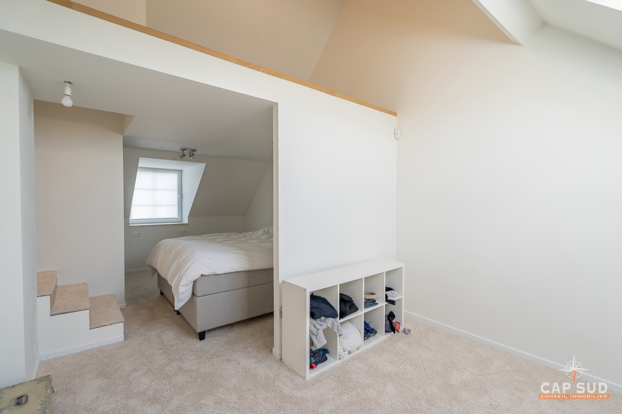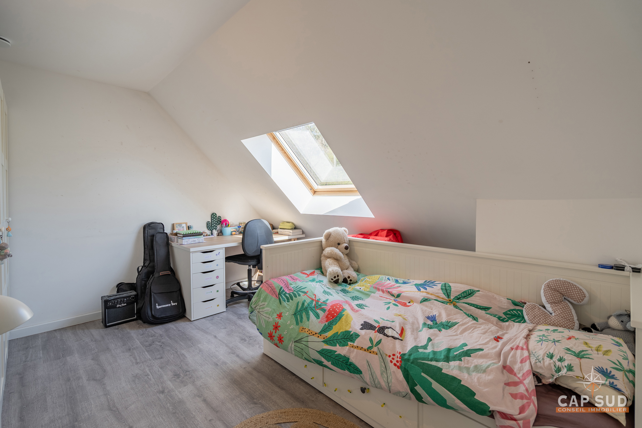À l’étage, le hall de nuit dessert deux belles chambres de 12 m² et 21 m², ainsi qu’une suite parentale de 23 m² avec espace prévu pour une salle de bains et mezzanine. Une salle de douche supplémentaire (douche, lavabo, WC) complète cet étage. Grenier de rangement accessible.