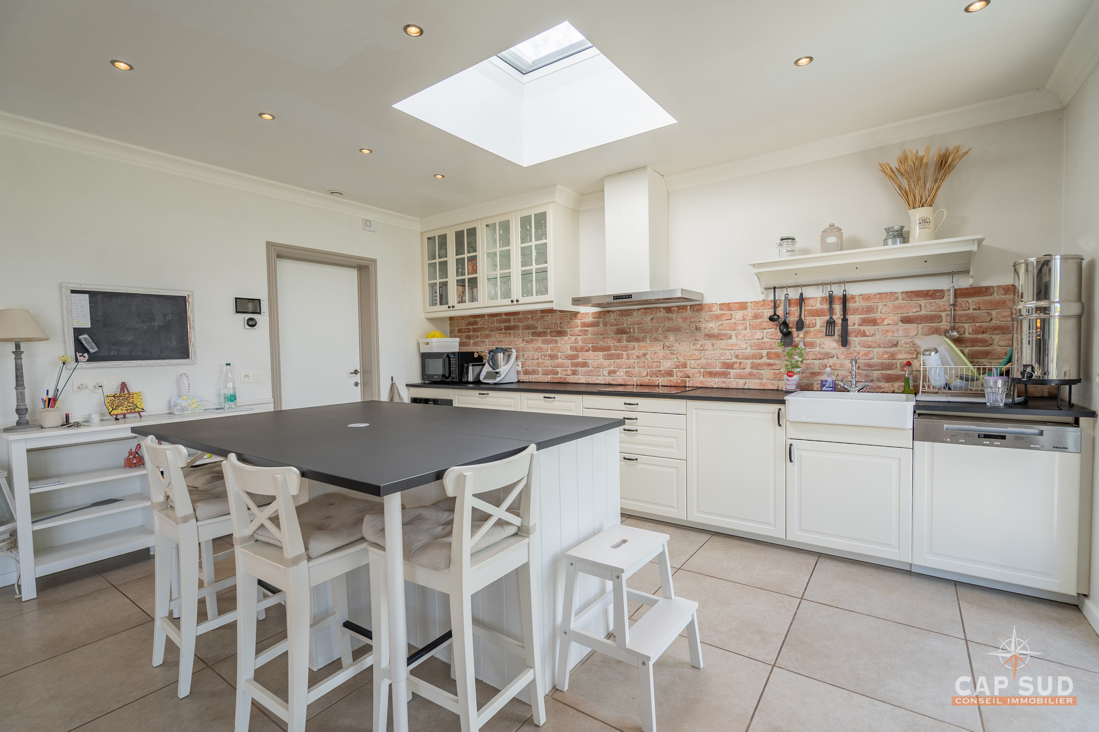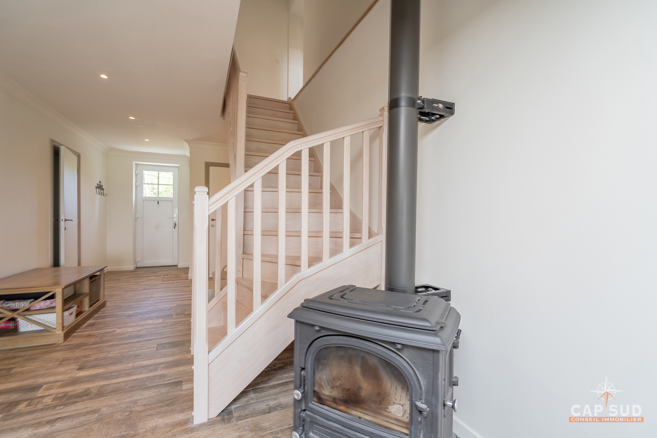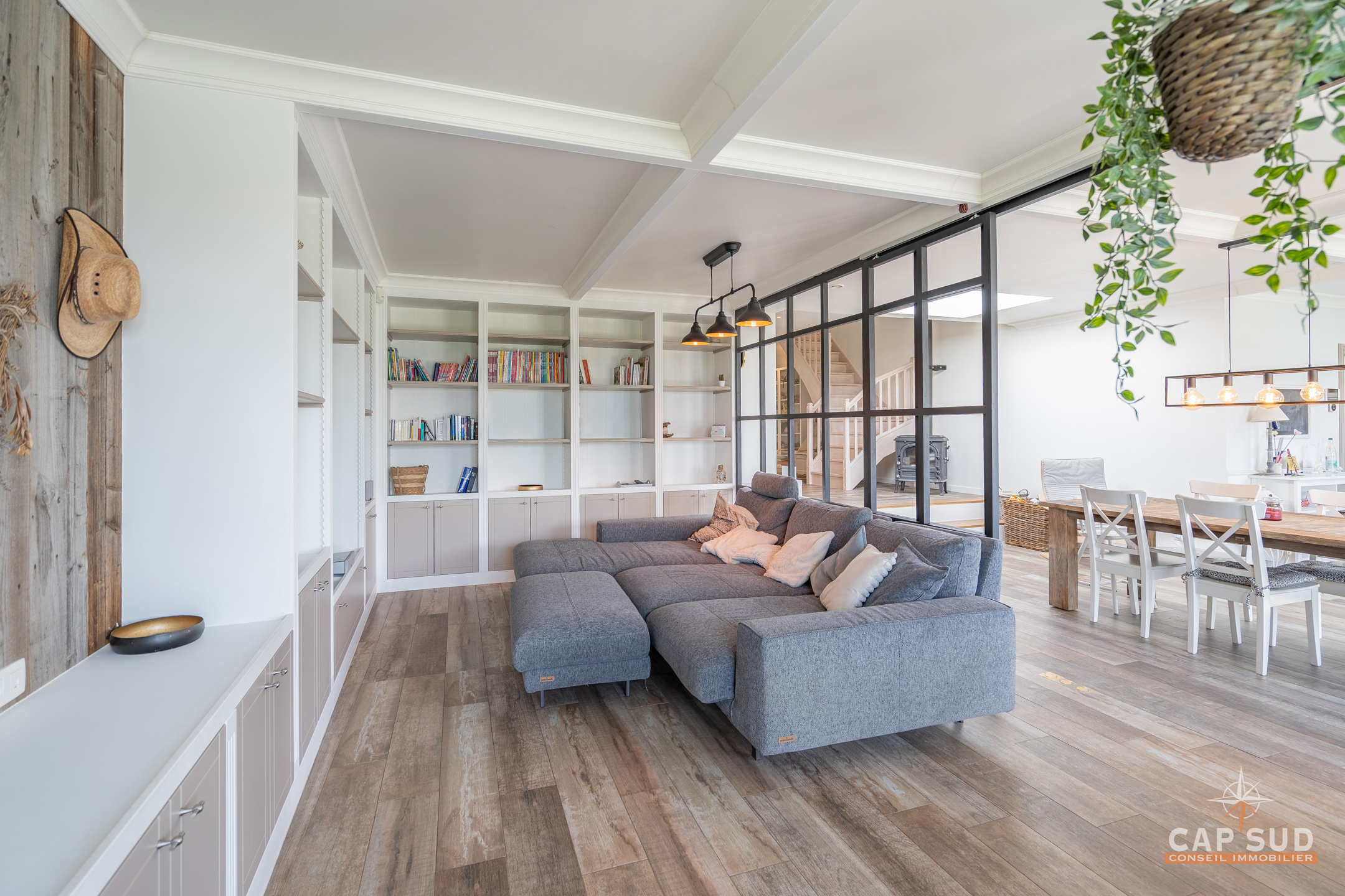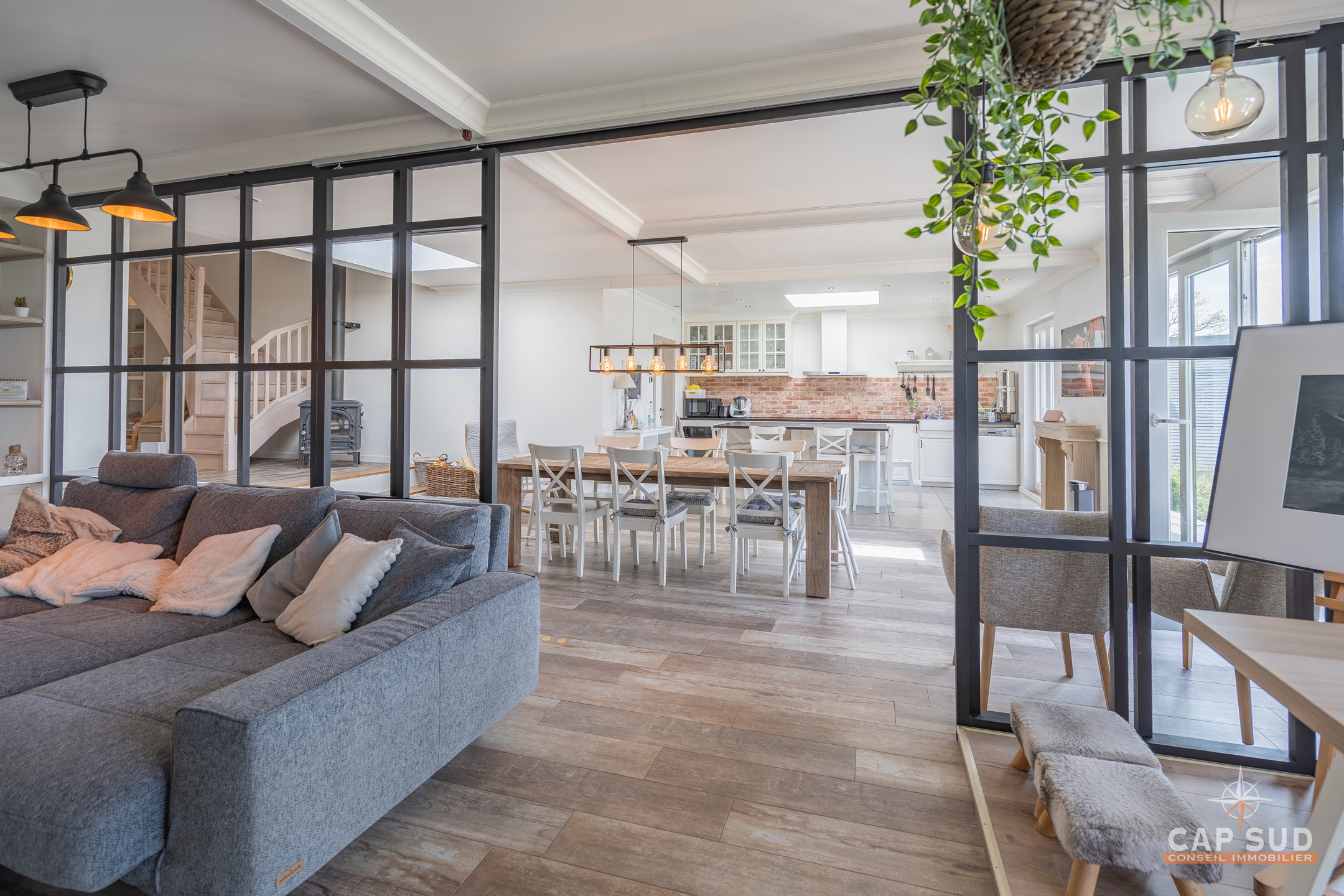 Dès l’entrée, un vaste hall vous accueille et s’ouvre sur un magnifique espace de vie de 80m², baigné de lumière, comprenant un séjour convivial et une cuisine super équipée. L’ensemble donne directement accès à la terrasse et au jardin, idéal pour profiter des beaux jours et des couchers de soleil.